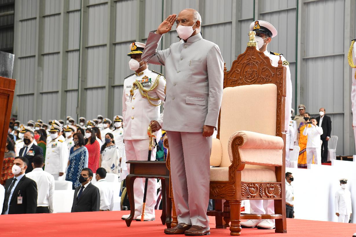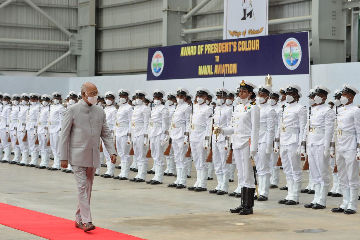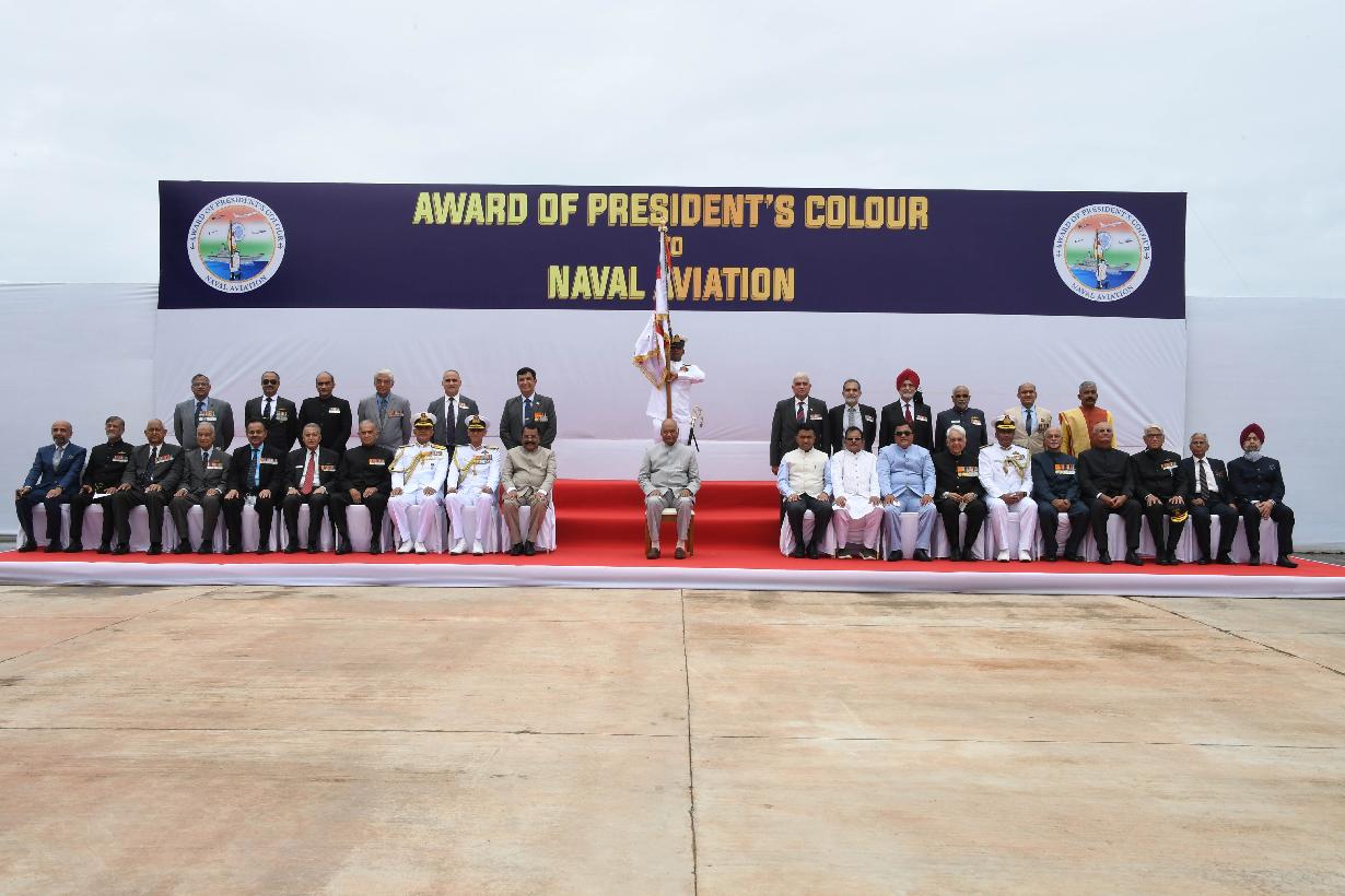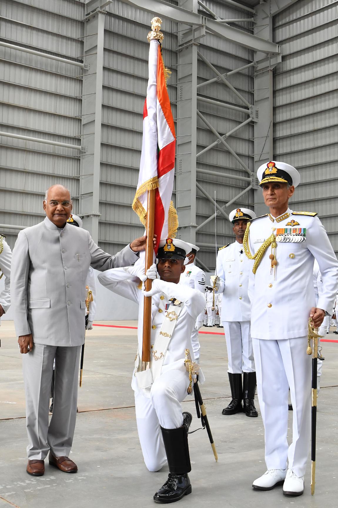 | Caption: | The President of India, Shri Ram Nath Kovind presenting President s Colour to the Indian Naval Aviation, at INS Hansa, in Goa on September 06, 2021. |