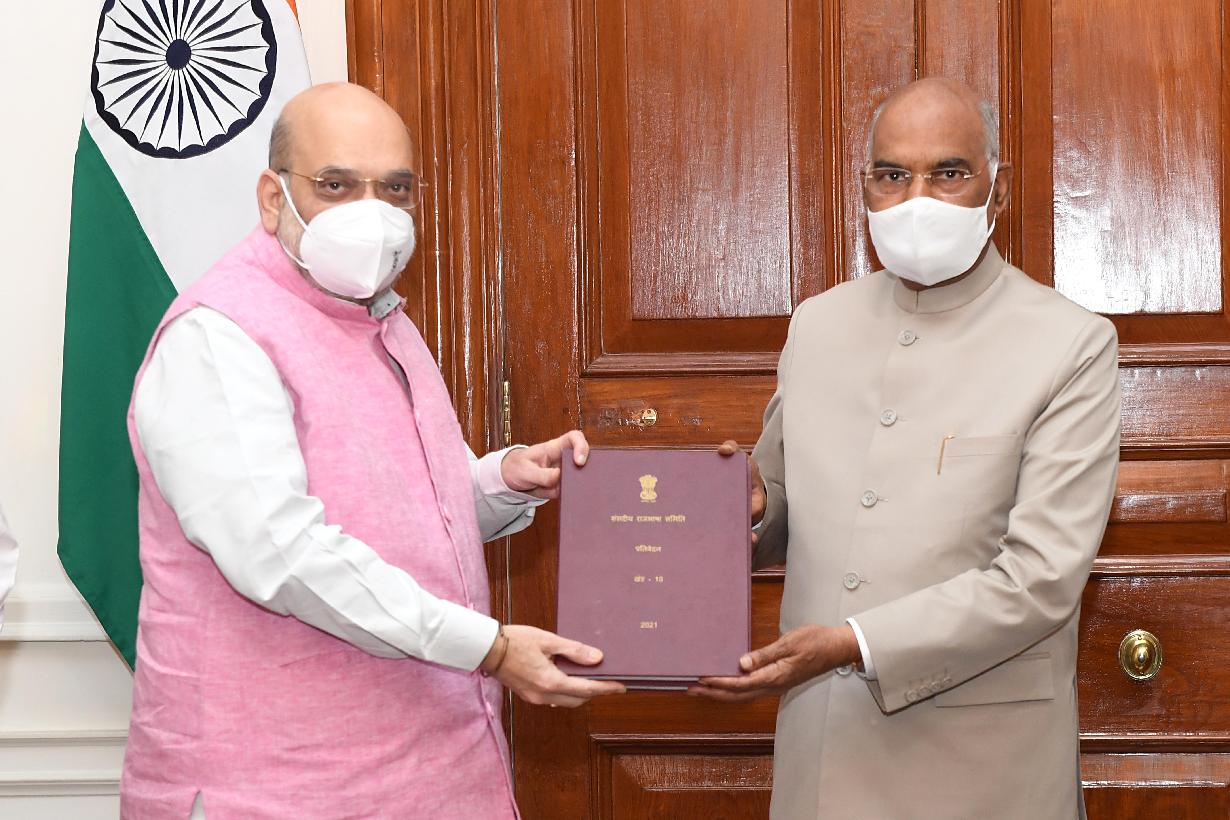 | Caption: | A delegation led by the Union Minister of Home Affairs, Shri Amit Shah called on the President of India, Shri Ram Nath Kovind and presented the 10th volume of the report of the Parliamentary Committee on Official Language, at Rashtrapati Bhavan on September 09, 2021. |