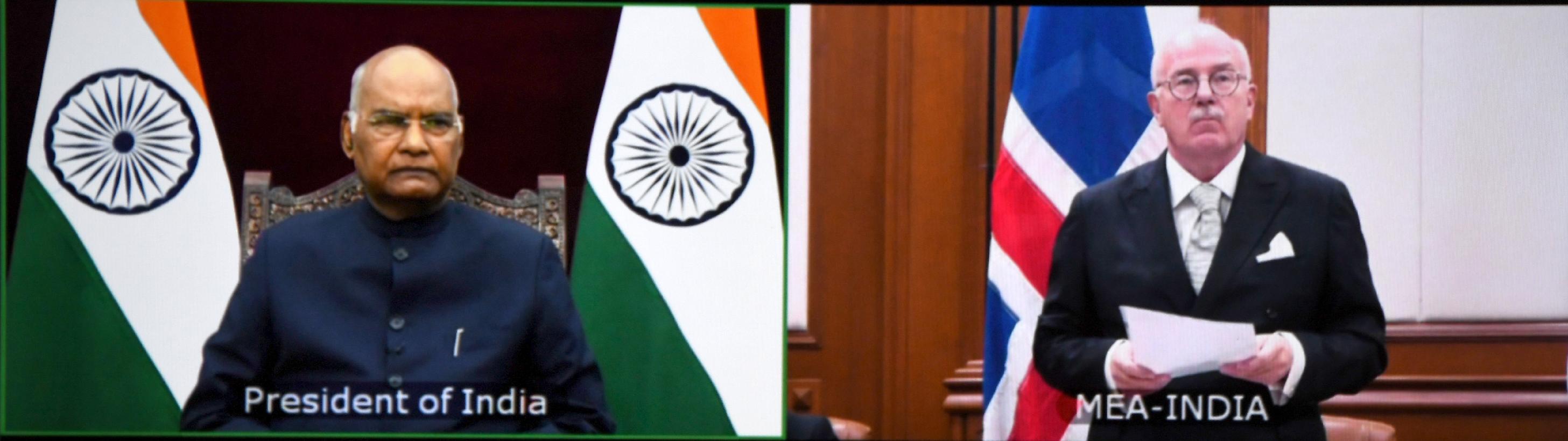 | Caption: | The President of India, Shri Ram Nath Kovind receiving credentials from the Ambassador of Iceland, H.E. Mr. Gudni Bragason, in a virtual ceremony, at Rashtrapati Bhavan on September 22, 2021. |