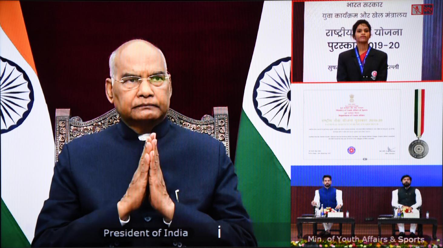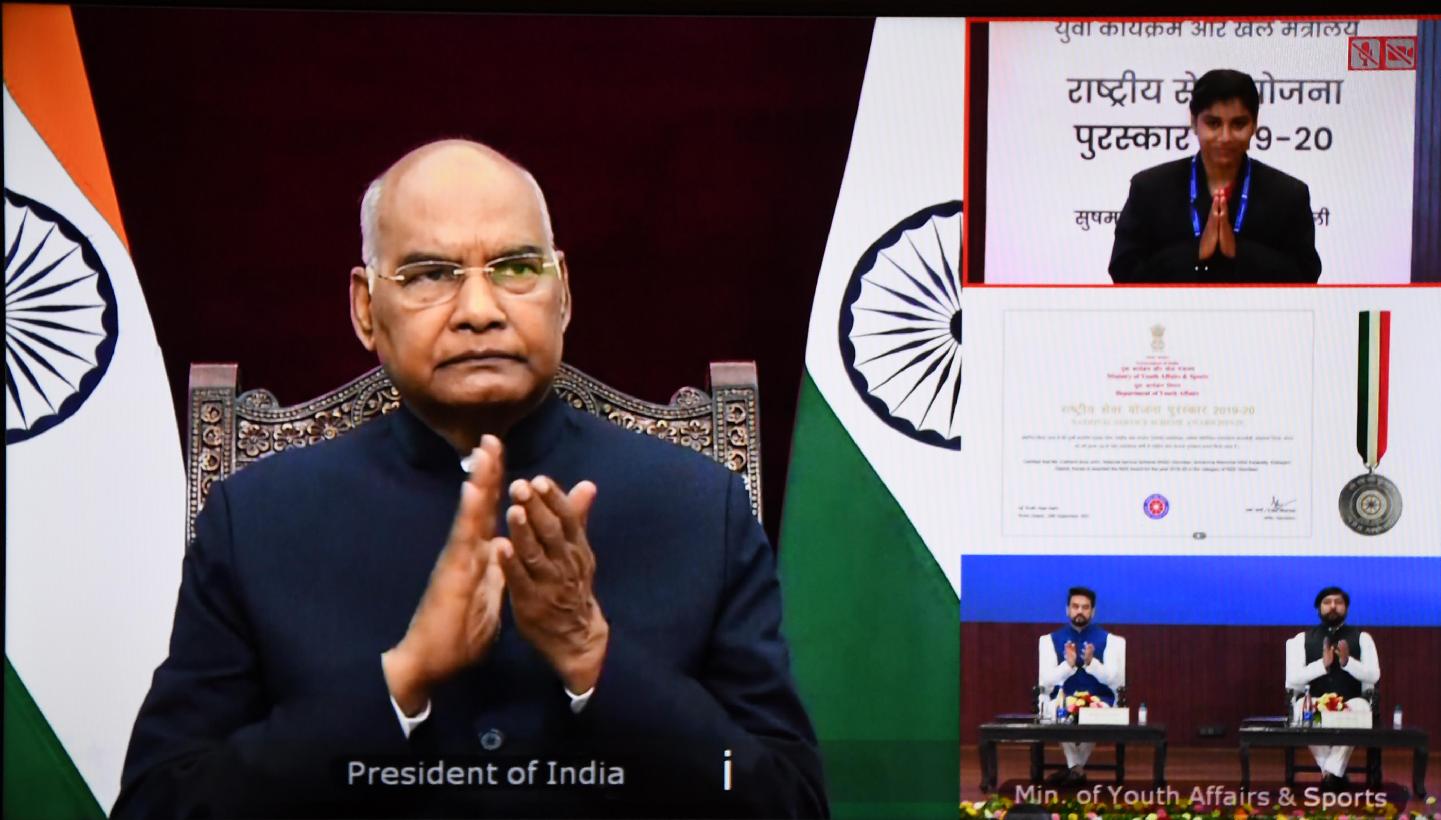 | Caption: | The President of India, Shri Ram Nath Kovind presents the National Service Scheme (NSS) awards for 2019-2020, in a virtual ceremony, at Rashtrapati Bhavan on September 24, 2021. |