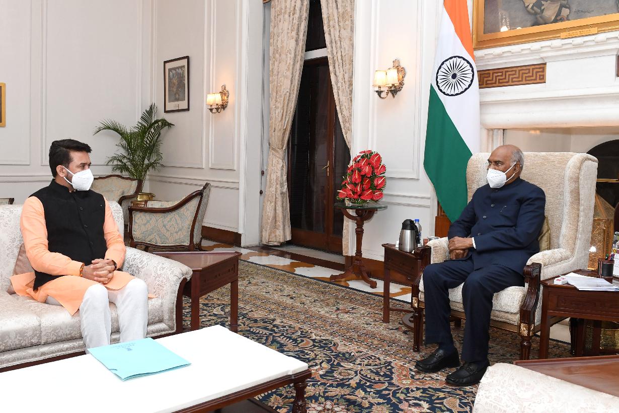 | Caption: | The Union Minister of Information & Broadcasting and Youth Affairs & Sports, Shri Anurag Singh Thakur calling on the President of India, Shri Ram Nath Kovind, at Rashtrapati Bhavan on October 04, 2021. |
