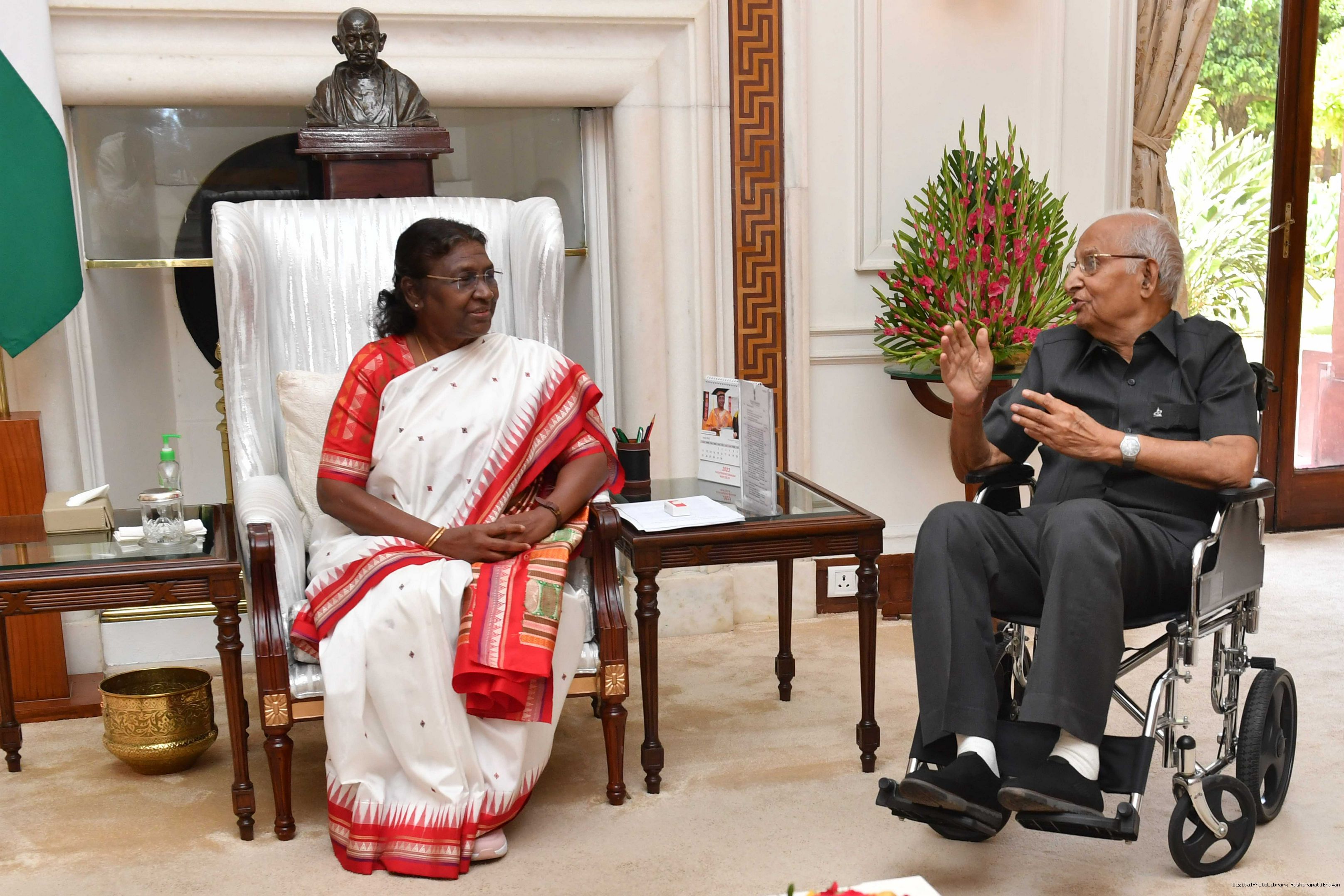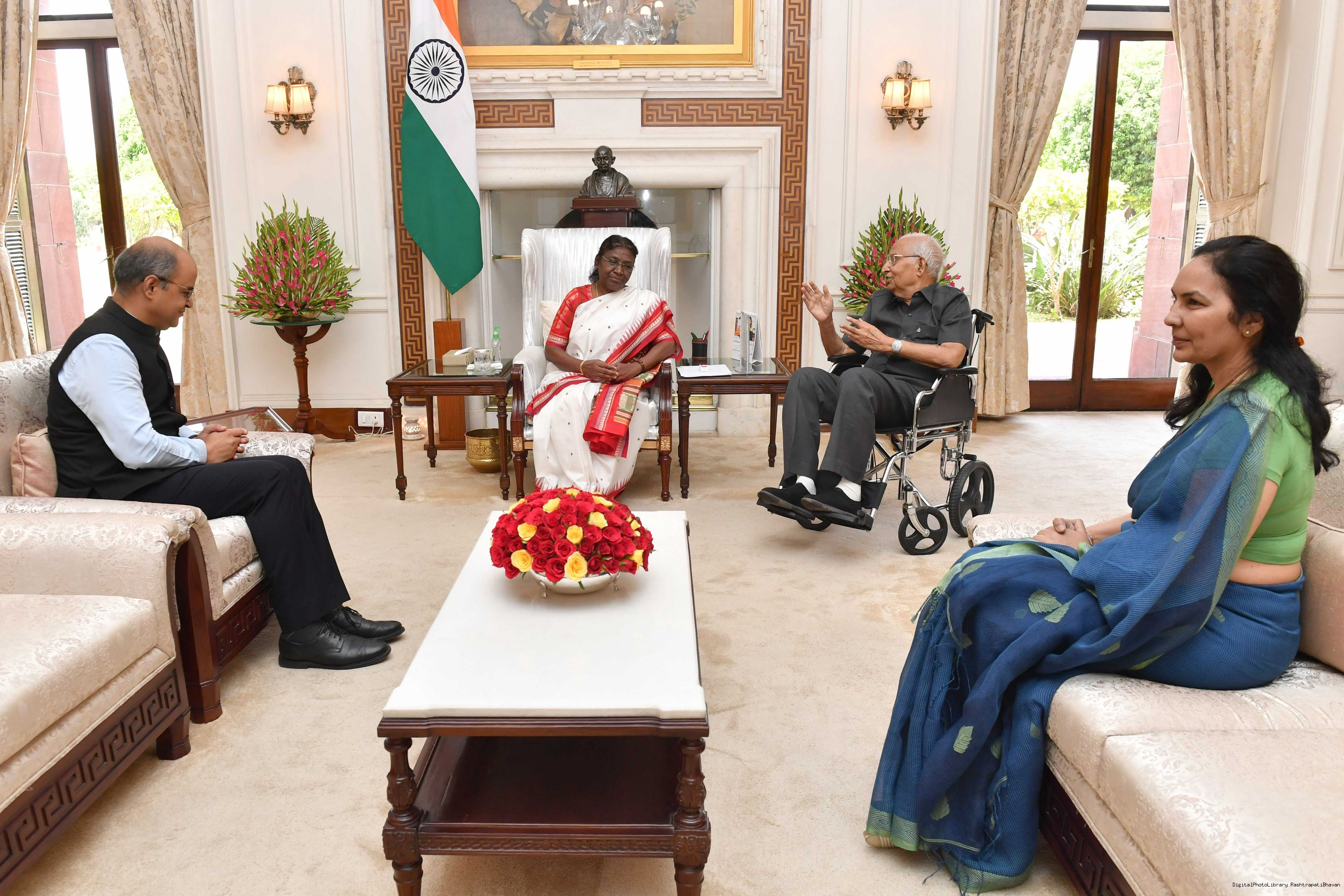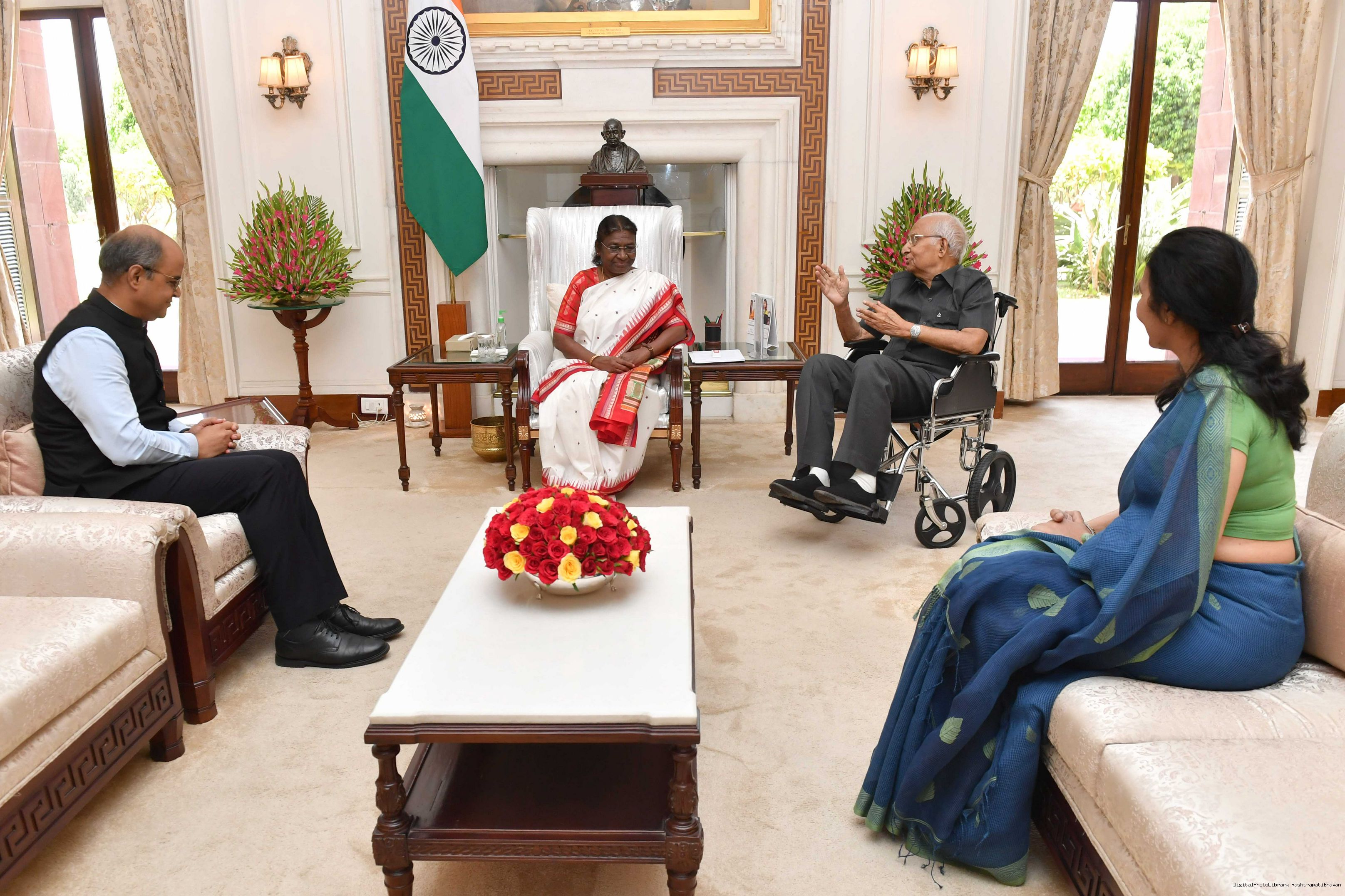 | Caption: | Shri OP Gupta along with Dr. Rakesh Gupta, Additional Secretary to the President meeting with the President of India, Smt. Droupadi Murmu at Rashtrapati Bhavan on June 13, 2023. |