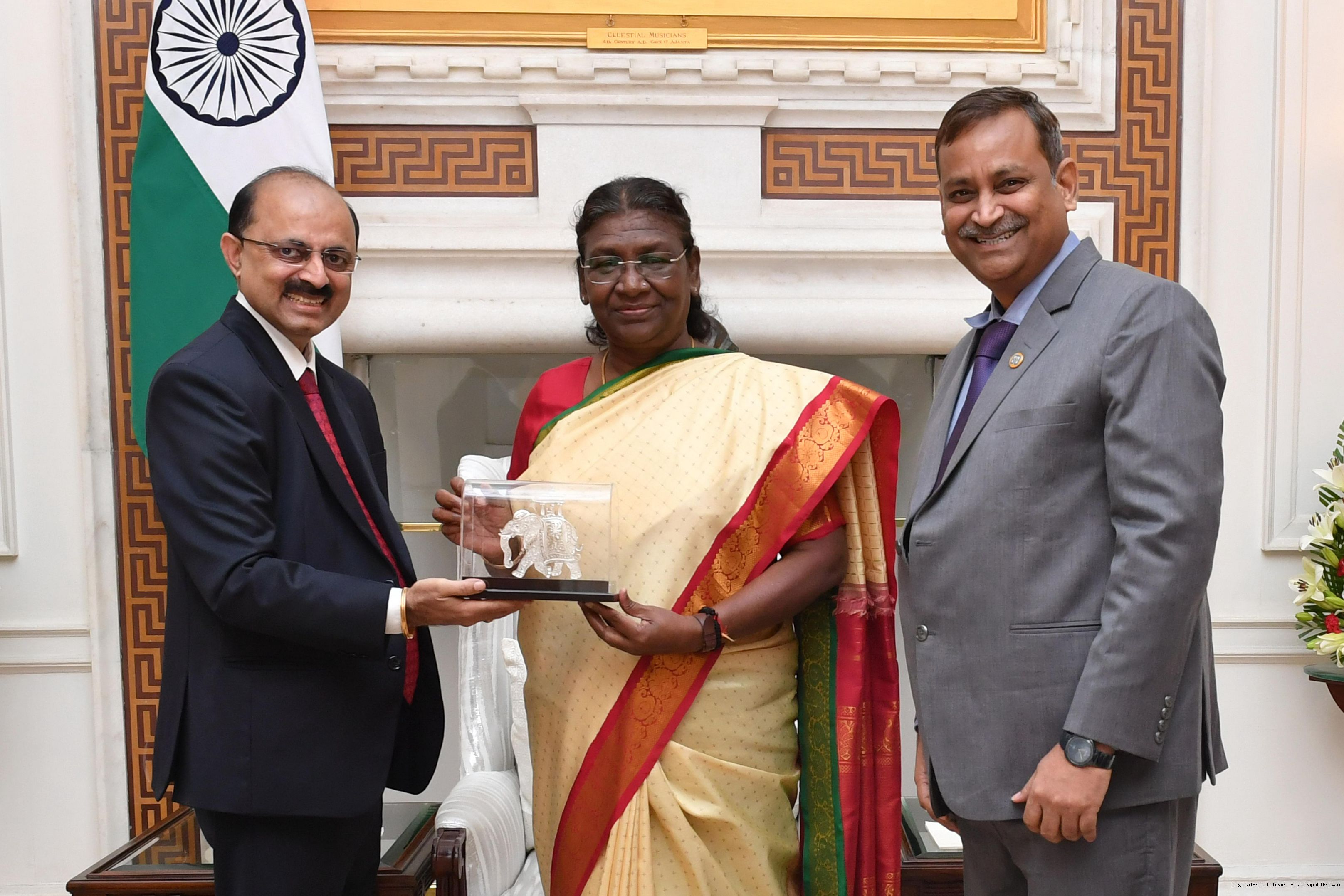| Caption: | Shri Ashwani Kumar, MD CEO, UCO Bank along with Shri Abhimannu Rajak, General Manager UCO Bank meeting with the President of India, Smt. Droupadi Murmu at Rashtrapati Bhavan on June 28, 2023. |