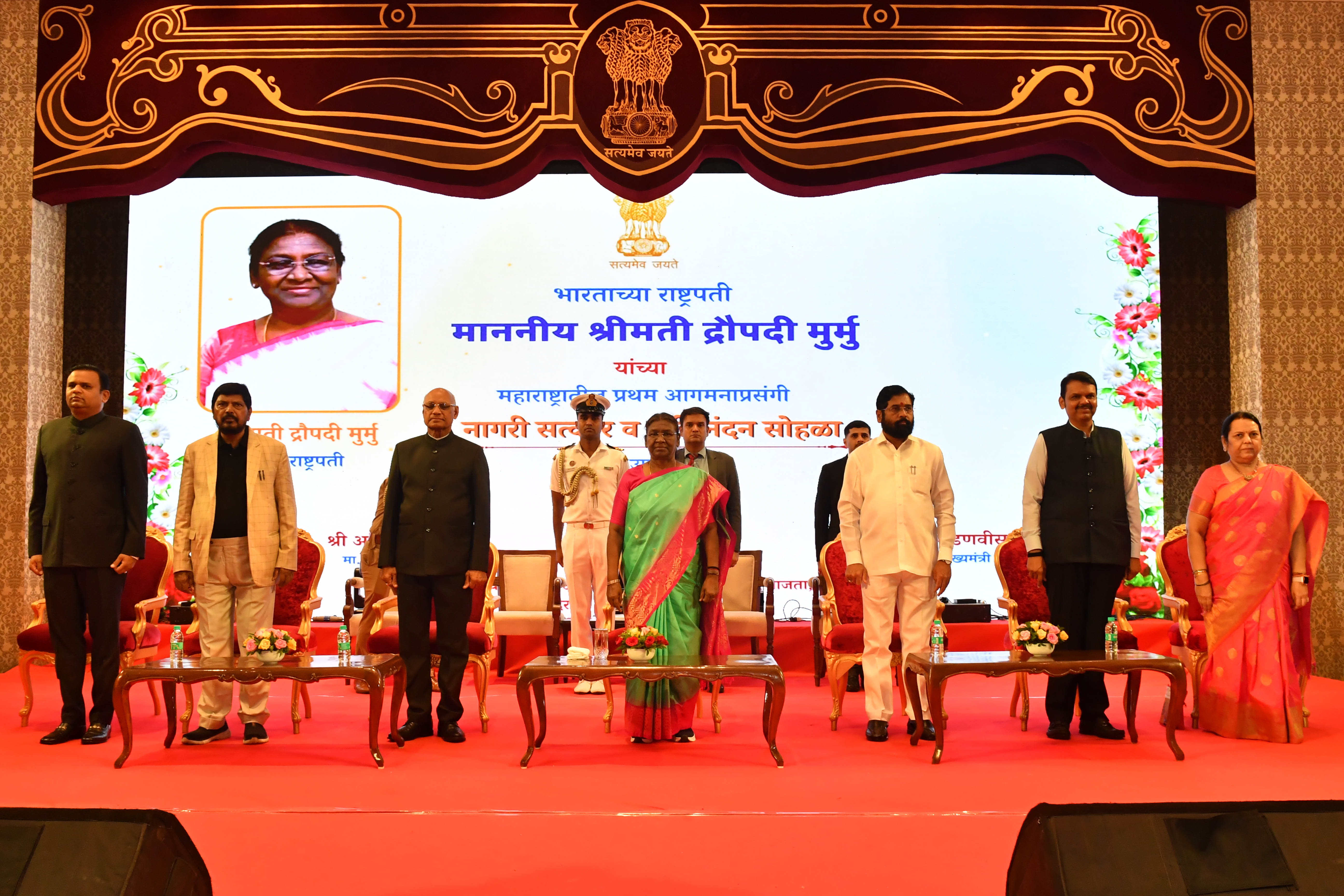 | Caption: | The President of India, Smt Droupadi Murmu attended a civic reception hosted in her honour by the Government of Maharashtra at Raj Bhavan, Mumbai on July 6, 2023. |