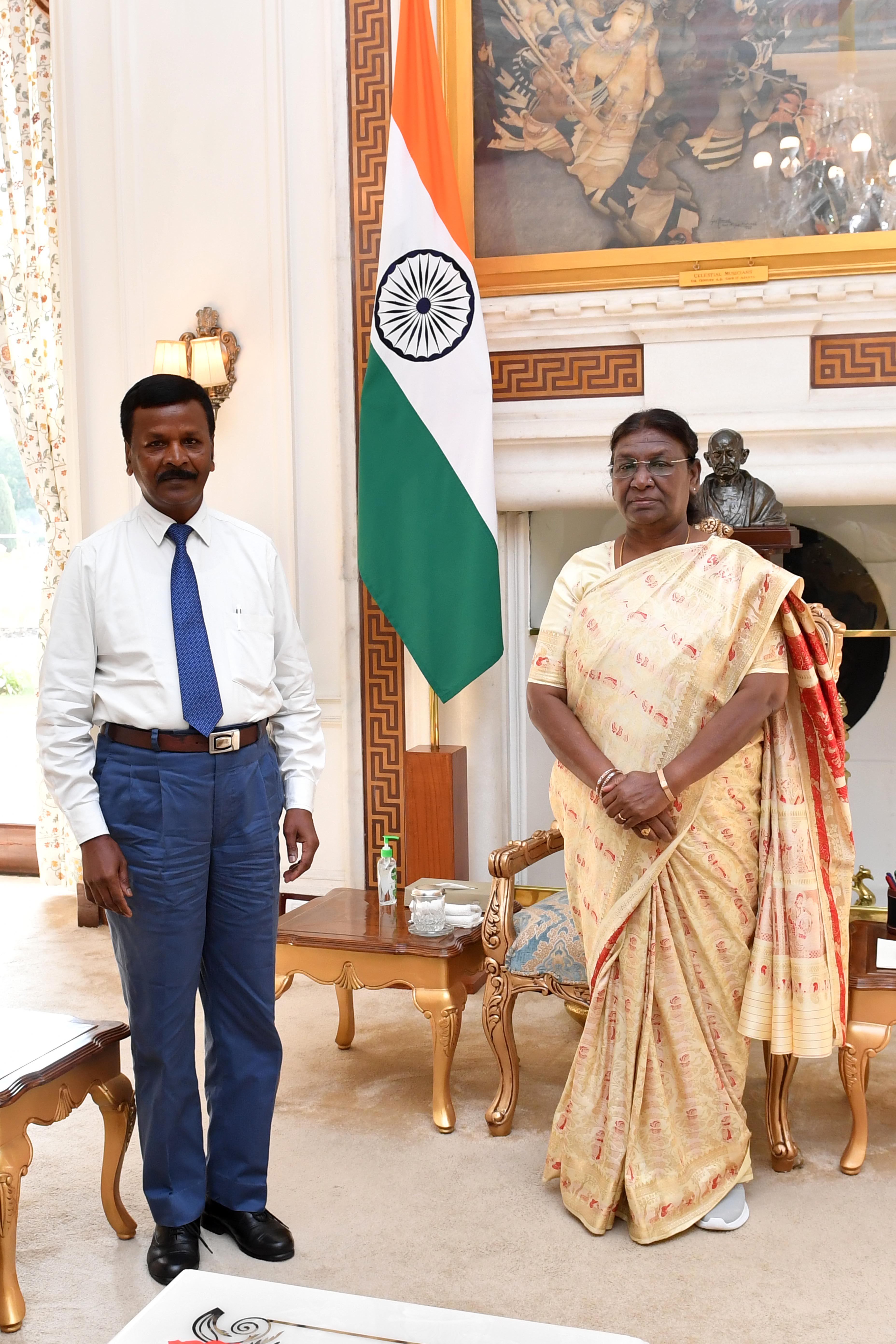 | Caption: | Dr. Jagarnath Oraon, University Professor cum Chief Scientist, Department of Veterinary Animal Hunbandry Extension Education, Ranchi Veterinary College, Ranchi meeting with the President of India, Smt. Droupadi Murmu at Rashtrapati Bhavan on August 16, 2023. |