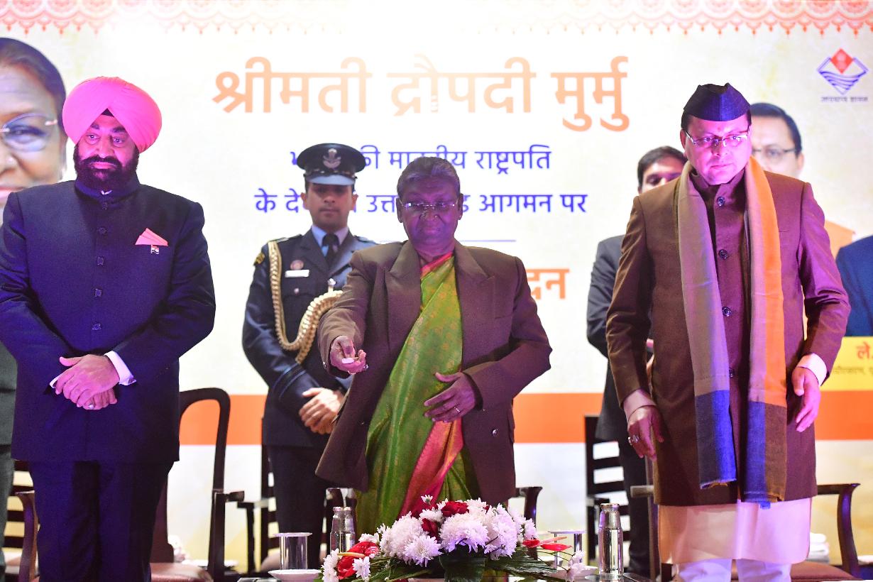 | Caption: | The President of India, Smt. Droupadi Murmu attended the civic reception hosted in her honour by the Government of Uttarakhand, at Dehradun on December 08, 2022. The President also virtually inaugurated and laid the foundation stones for various projects related to healthcare, power generation and supply, technical education and transport on the occasion. |