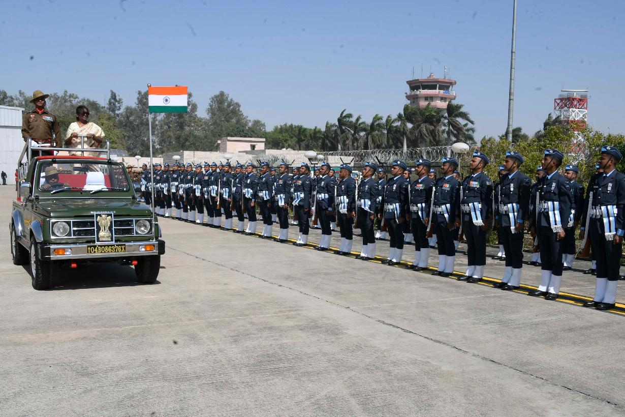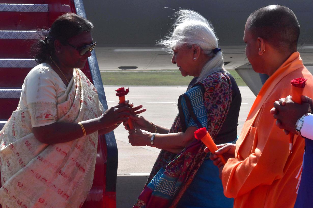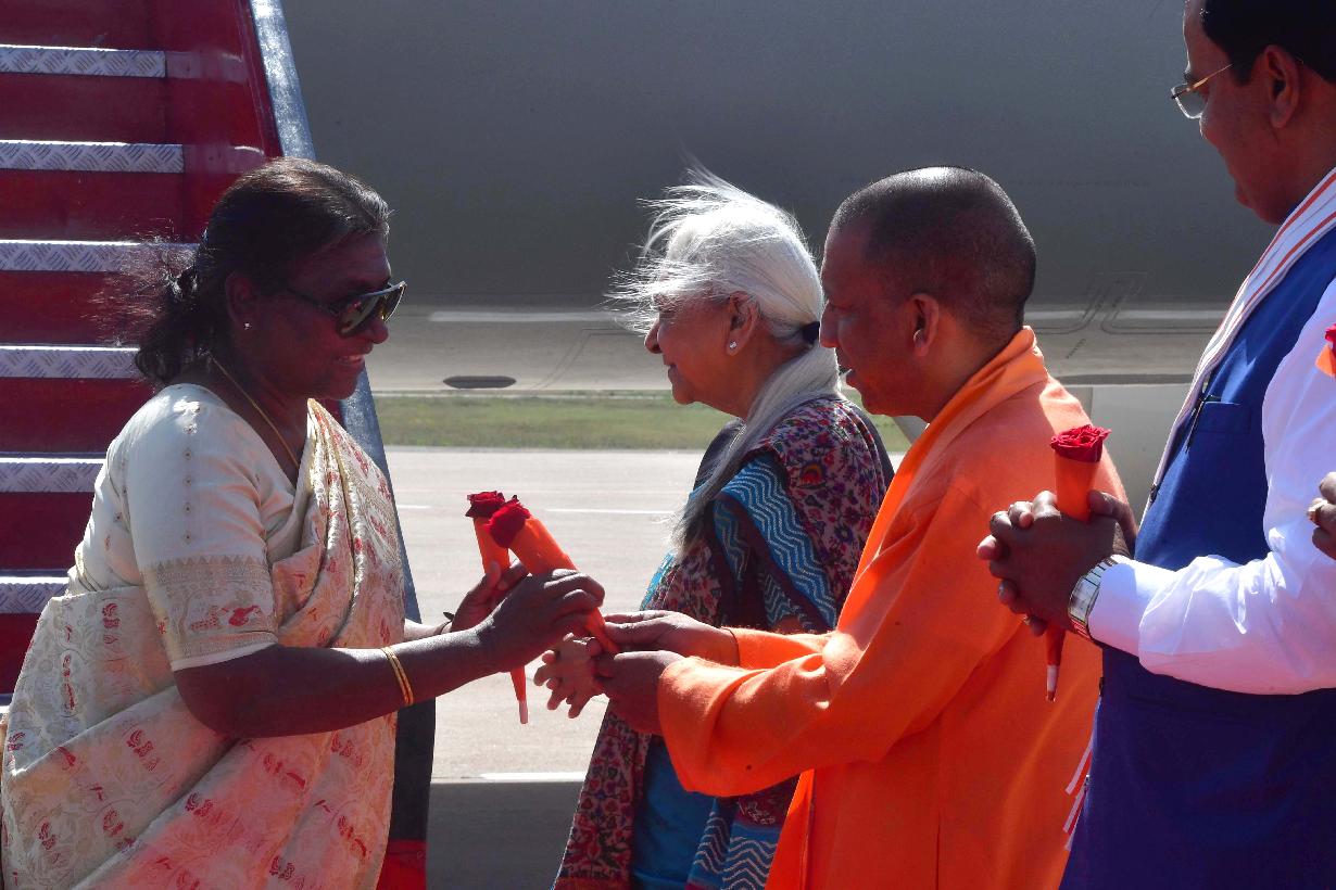 | Caption: | The Governor of Uttar Pradesh, Smt. Anandiben Patel and the Chief Minister, Shri Yogi Adityanath received the President of India, Smt. Droupadi Murmu on her arrival, at Lucknow on February 12, 2023. The President was accorded a guard of honour on her first visit to Uttar Pradesh. |