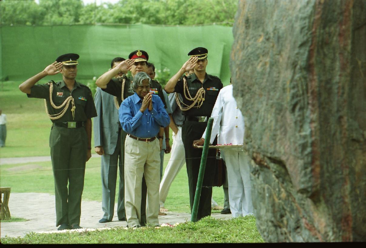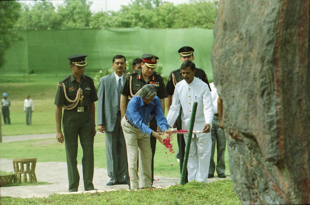 | Caption: | The President of India, Dr A P J Abdul Kalam paying homage to the Prime Minister of India, Late Smt Indira Gandhi at Shakti Sthal in New Delhi on July 26, 2002 |