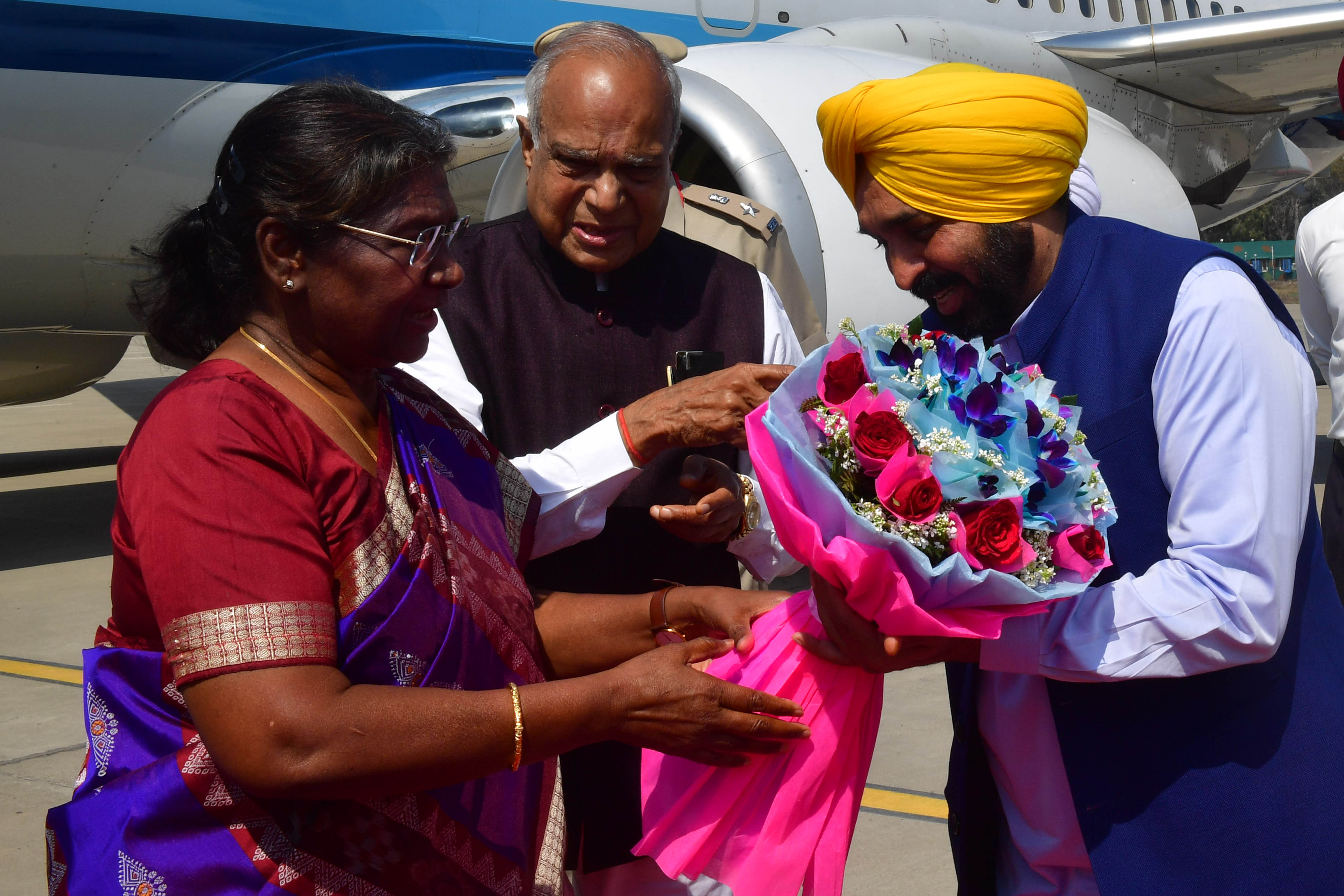 | Caption: | The Governor of Punjab, Shri Banwarilal Purohit and the Chief Minister, Shri Bhagwant Mann received the President of India, Smt. Droupadi Murmu, on her arrival, at Amritsar March 9, 2023 |