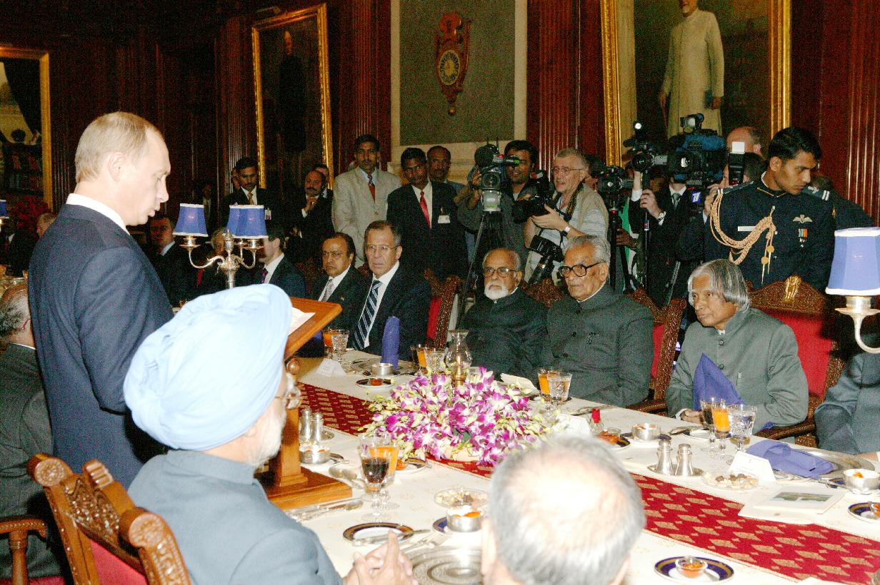 | Caption: | The President of India, Dr A P J Abdul Kalam at the Banquet Hosted in Honour of the President of Russia, HE Mr Vladimir V Putin and various Distinguished Guest at the Banquet Hall of Rashtrapati Bhavan in New Delhi on Jan 25, 2007 |