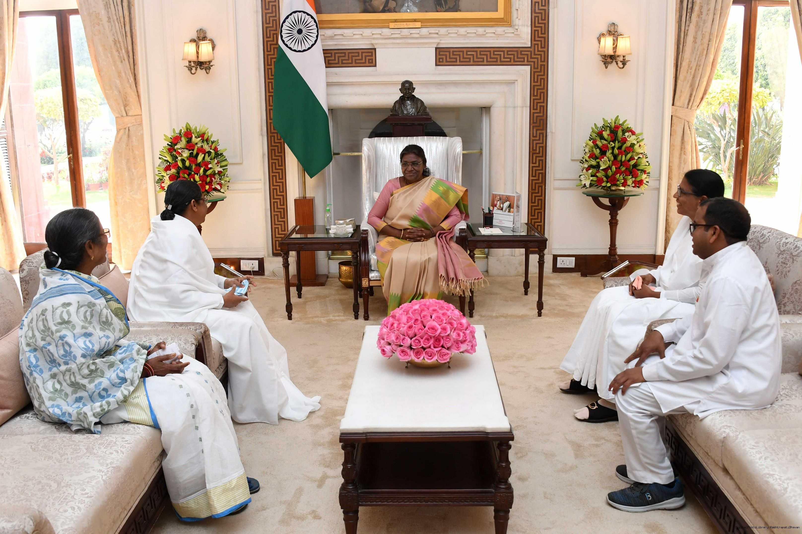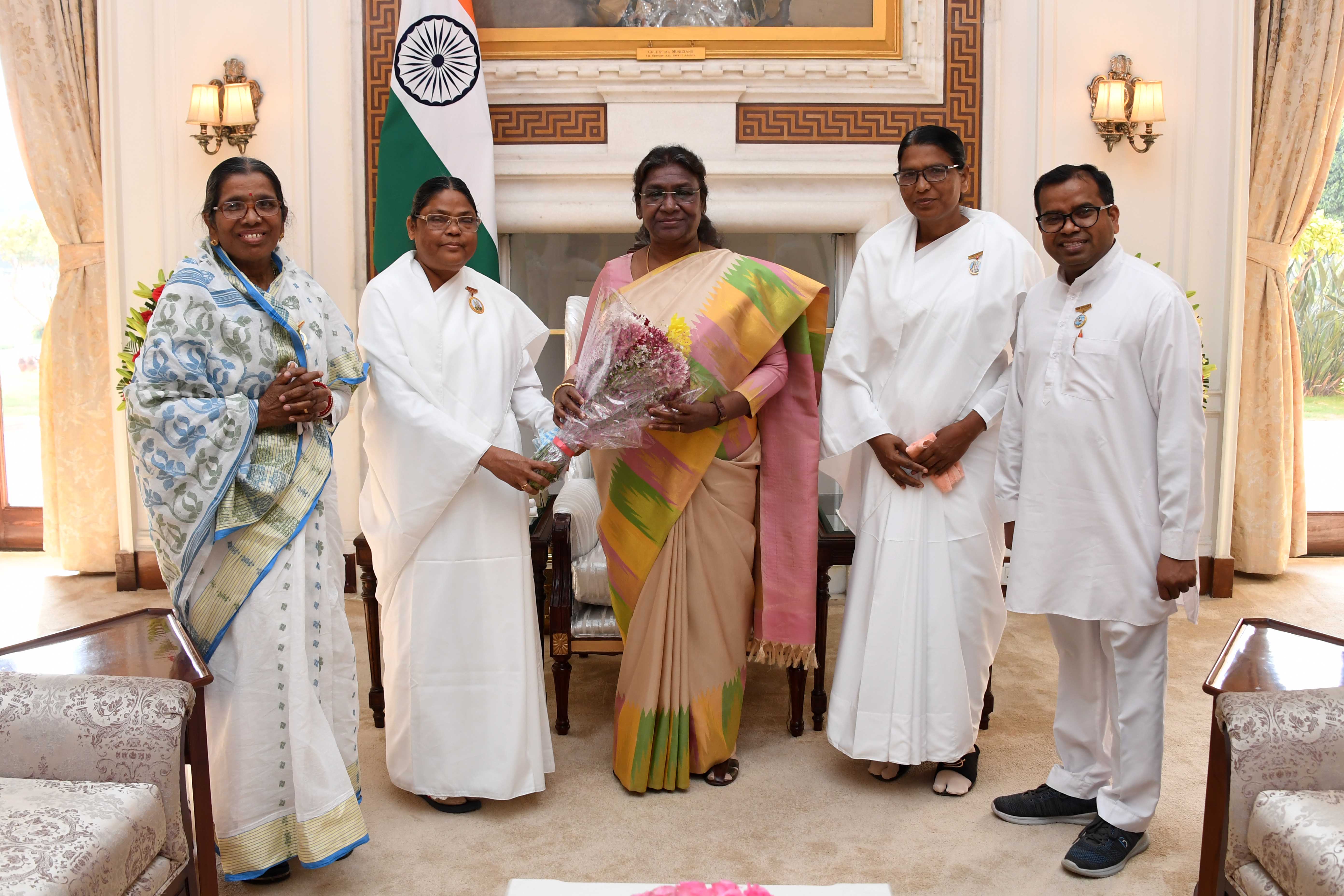 | Caption: | BK Uma, Centre Incharge, Brahma Kumaris, Baripada, Mayurbhanj, Odisha along with BK Geeta Rani Swain, BK Sarojini Sur and BK Bikash meeting with the President of India, Smt. Droupadi Murmu at Rashtrapati Bhavan on March 14, 2023 |