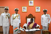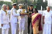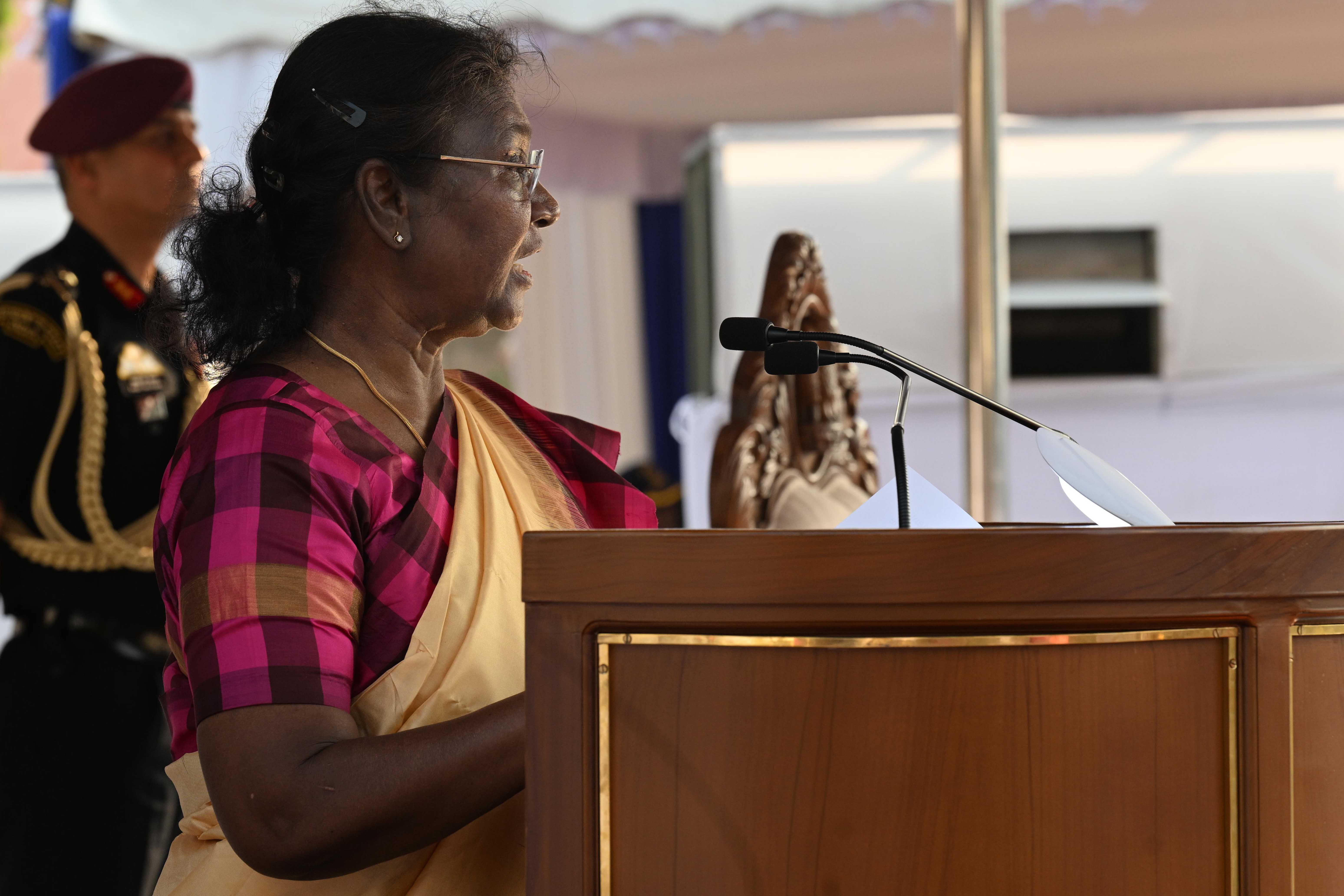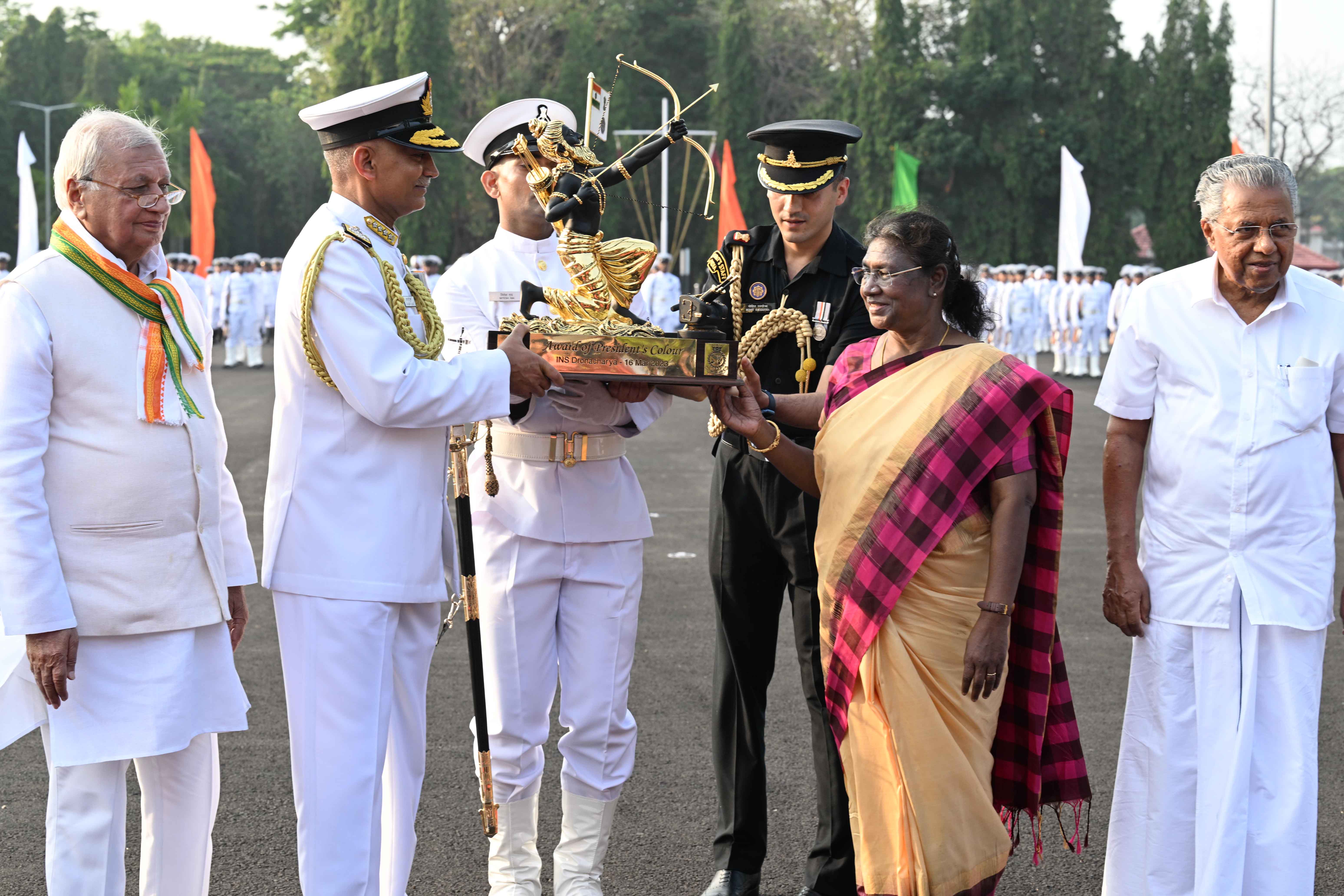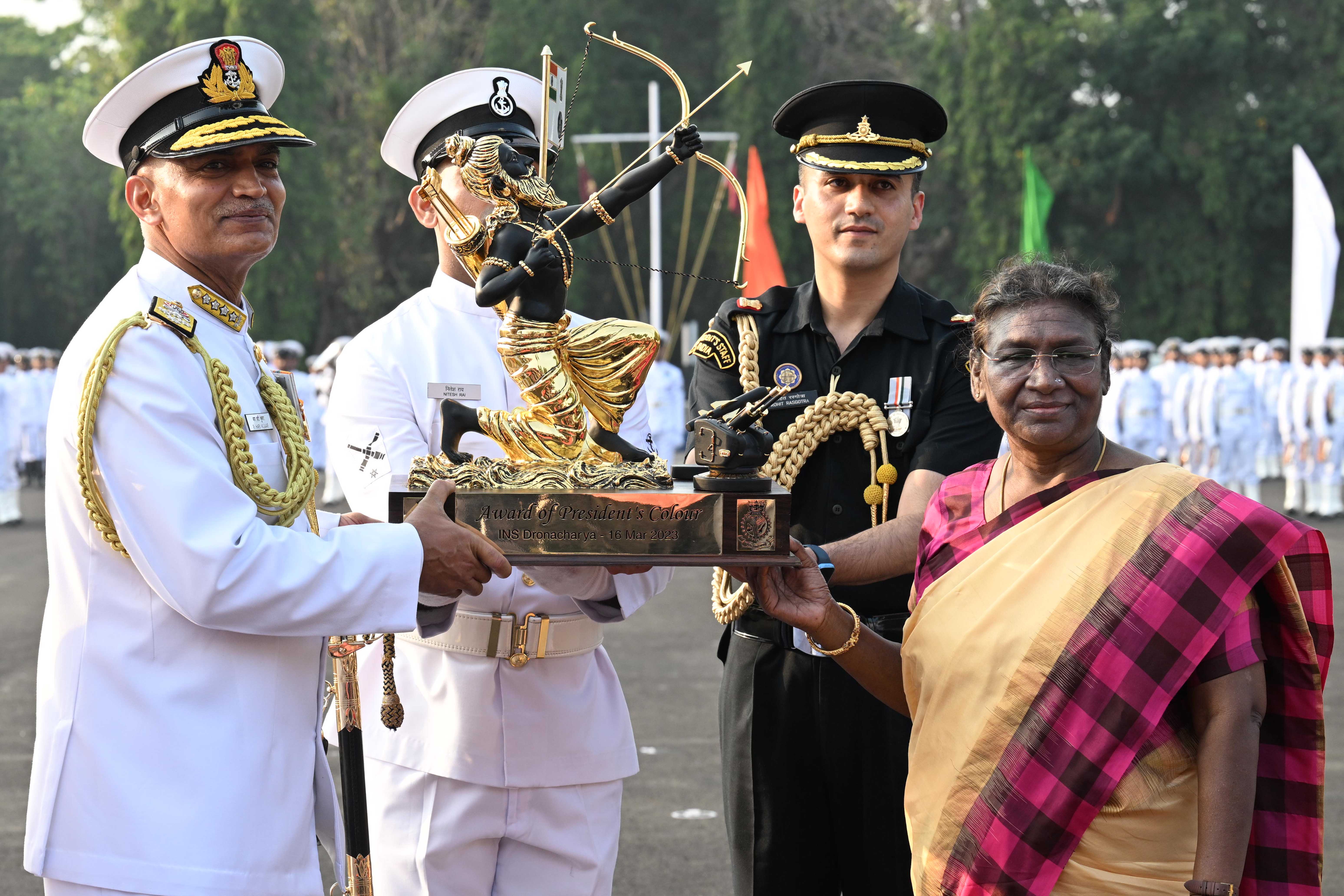 | Caption: | The President of India, Smt Droupadi Murmu presented the President's Colour to INS Dronacharya in Kochi on March 16, 2023. |