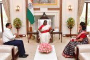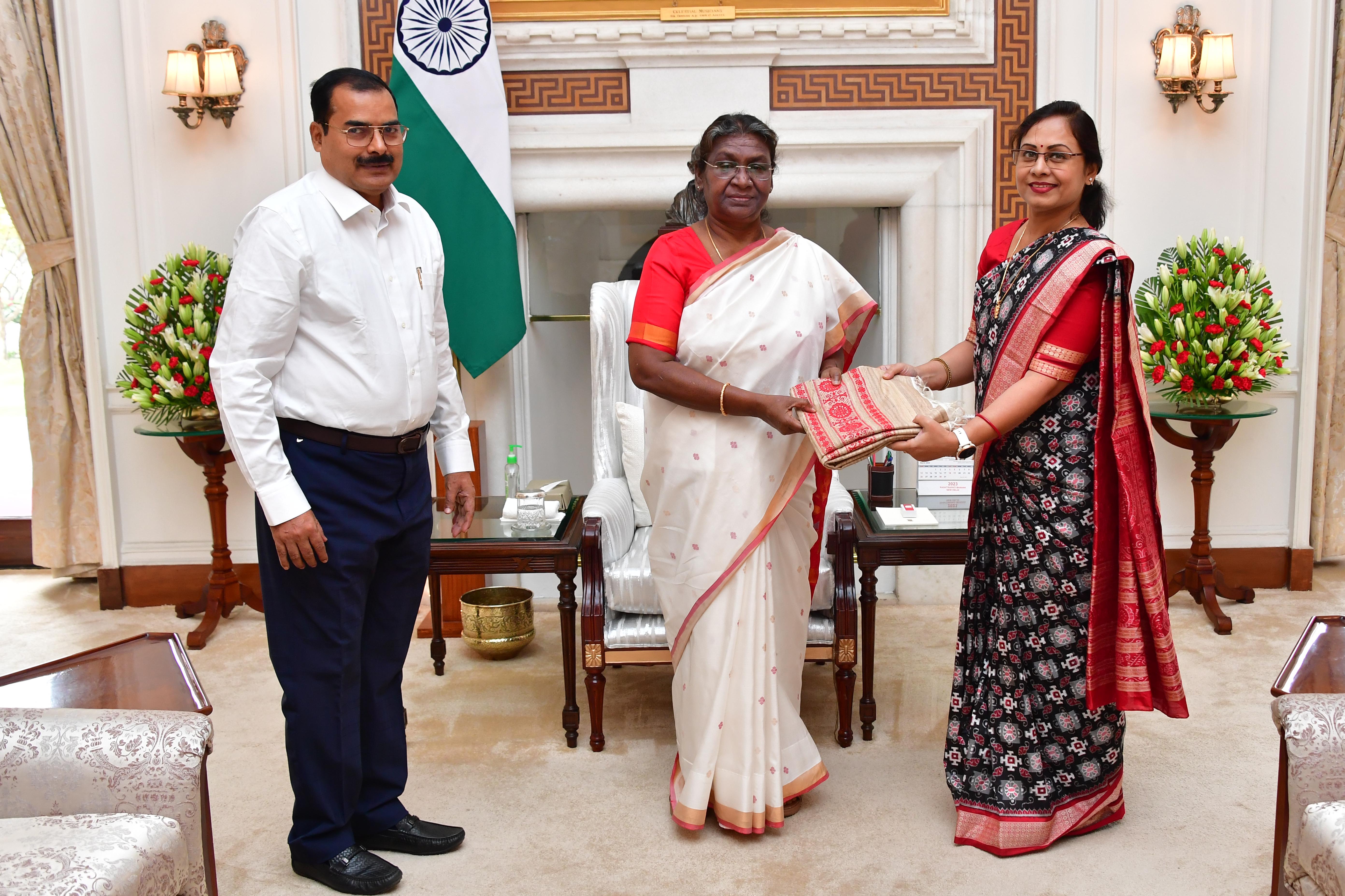 | Caption: | Smt. Subhashree Lenka, executive member, Odisha Sahitya Academy along with her husband Shri Sanjaya Kumar Patra meeting with the President of India, Smt. Droupadi Murmu on March 22,2023 |