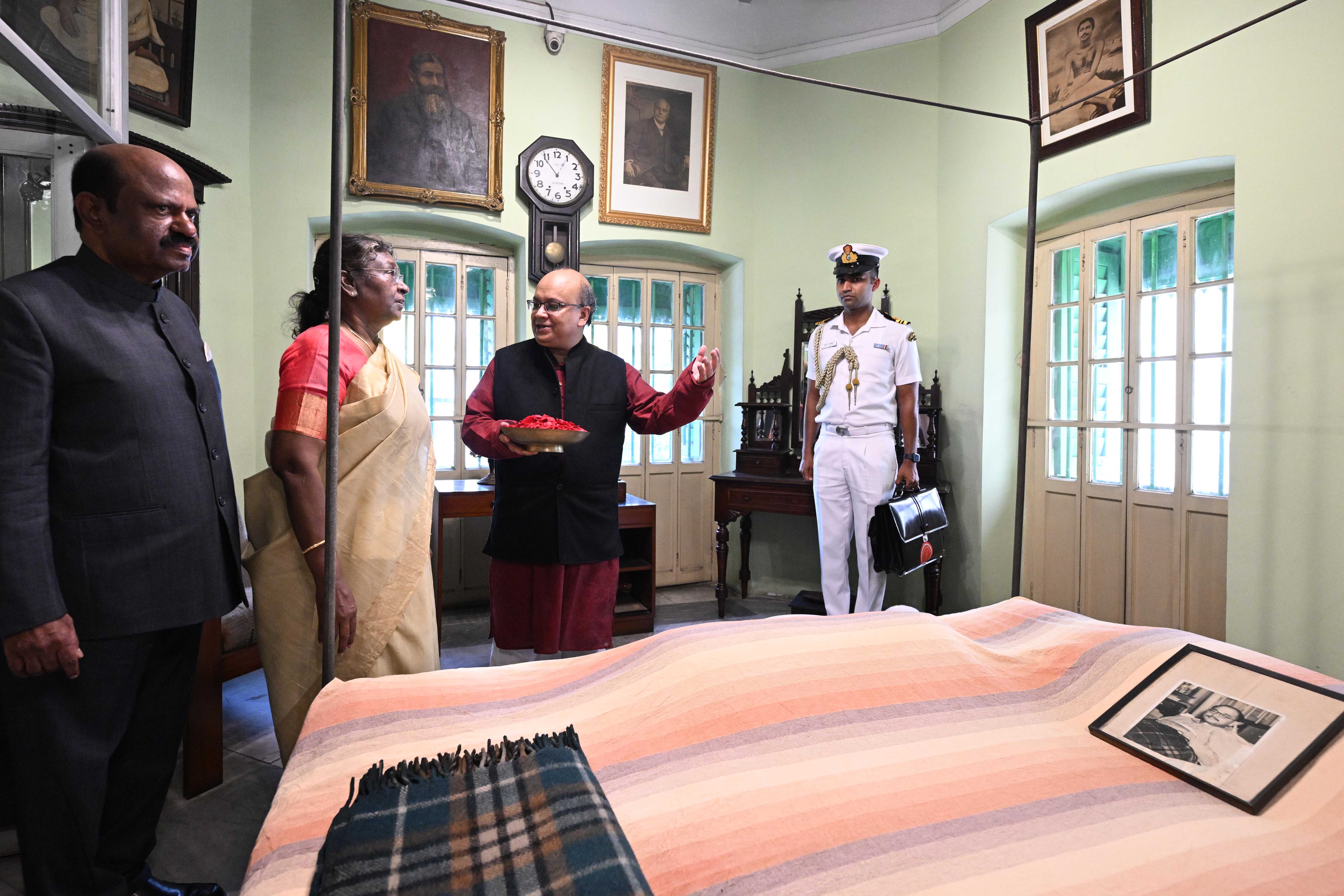| Caption: | The President of India, Smt. Droupadi Murmu Paying Homage to Netaji Subhash Chandra Bose at Netaji Bhawan at Kolkata in West Bengal on March 27 , 2023 |