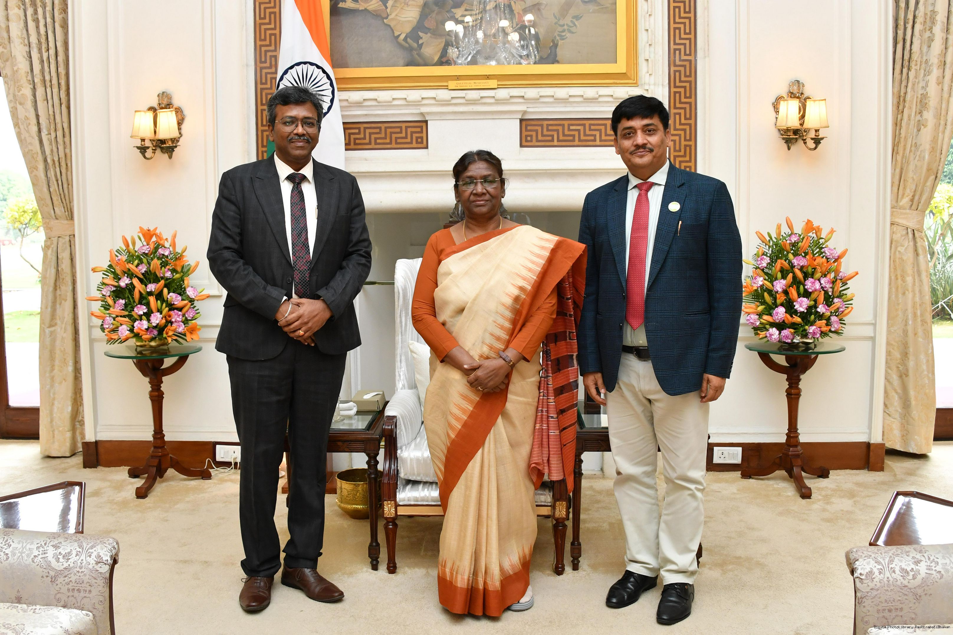 | Caption: | Shri Bhaskar Sarkar, CEO along with Dushyant Kumar Tyagi, Chief Commercial Services, Tata Power Northern Odisha Distribution Limited meeting with the President of India, Smt. Droupadi Murmu at Rashtrapati Bhavan on May 01, 2023. |