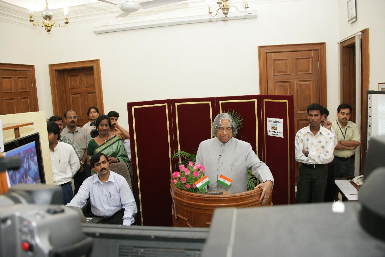 | Caption: | The President of India, Dr A P J Abdul Kalam addressing to the University of Madras, University of Mumbai, University of Calcutta, Anna University and Madurai Kamraj University through EDUSAT at Rashtrapati Bhavan in New Delhi on Oct 03, 2005 |