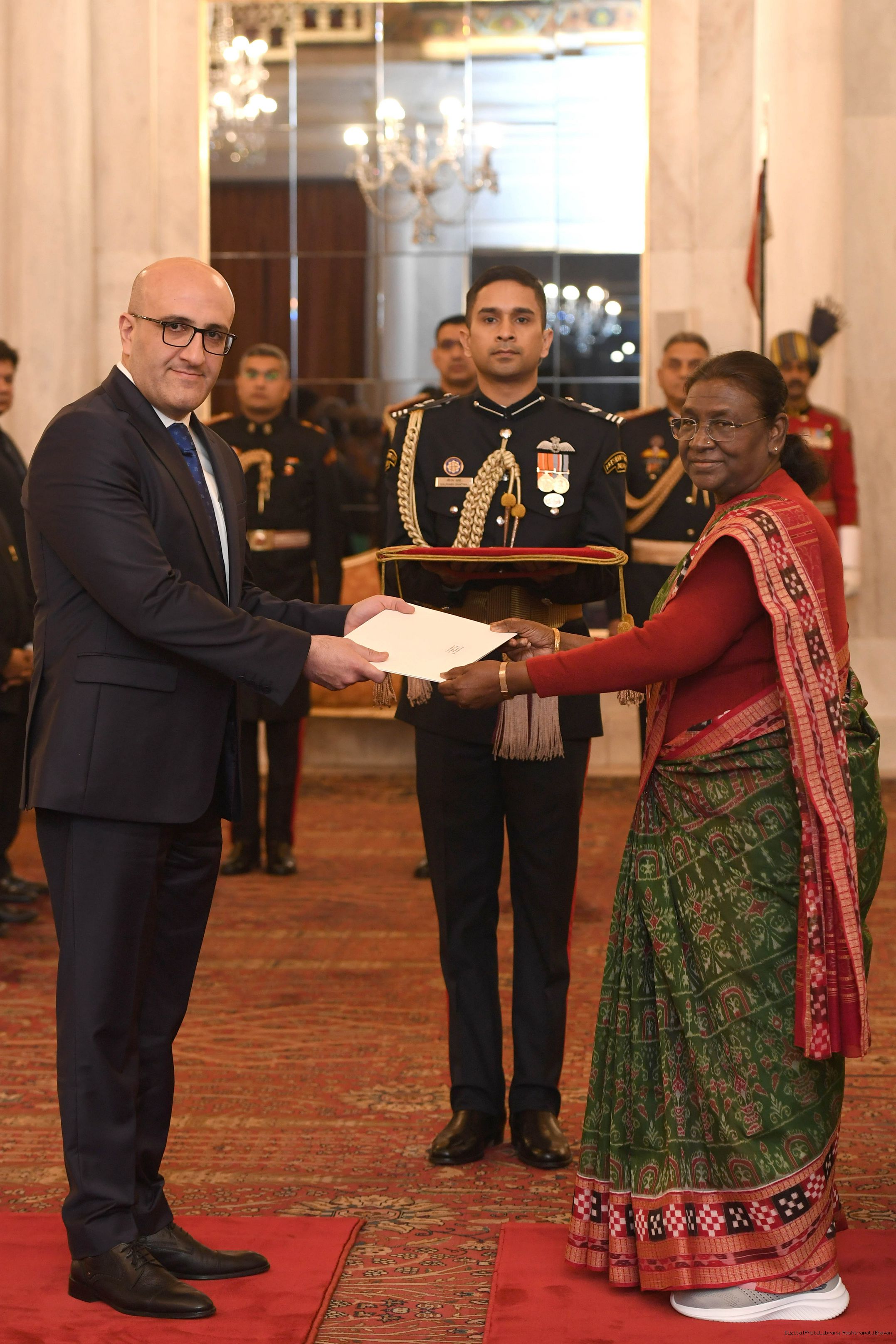 | Caption: | The Ambassador-designate of the Republic of Azerbaijan, H.E. Mr. Elchin Nariman Oglu Huseynli presenting his credentials to the President of India, Smt Droupadi Murmu at Rashtrapati Bhavan on January 5, 2024. |