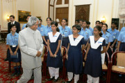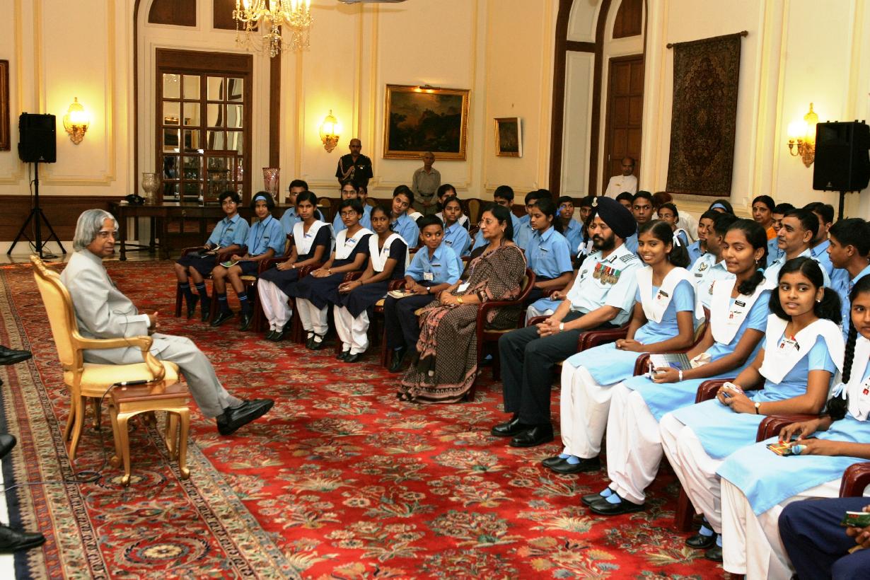 | Caption: | The Students from School at Air Force Stations under HQ Central Air Command, Allahabad calling on the President of India, Dr A P J Abdul Kalam at the Yellow Drawing Room of Rashtrapati Bhavan in New Delhi on Oct 24, 2005 |