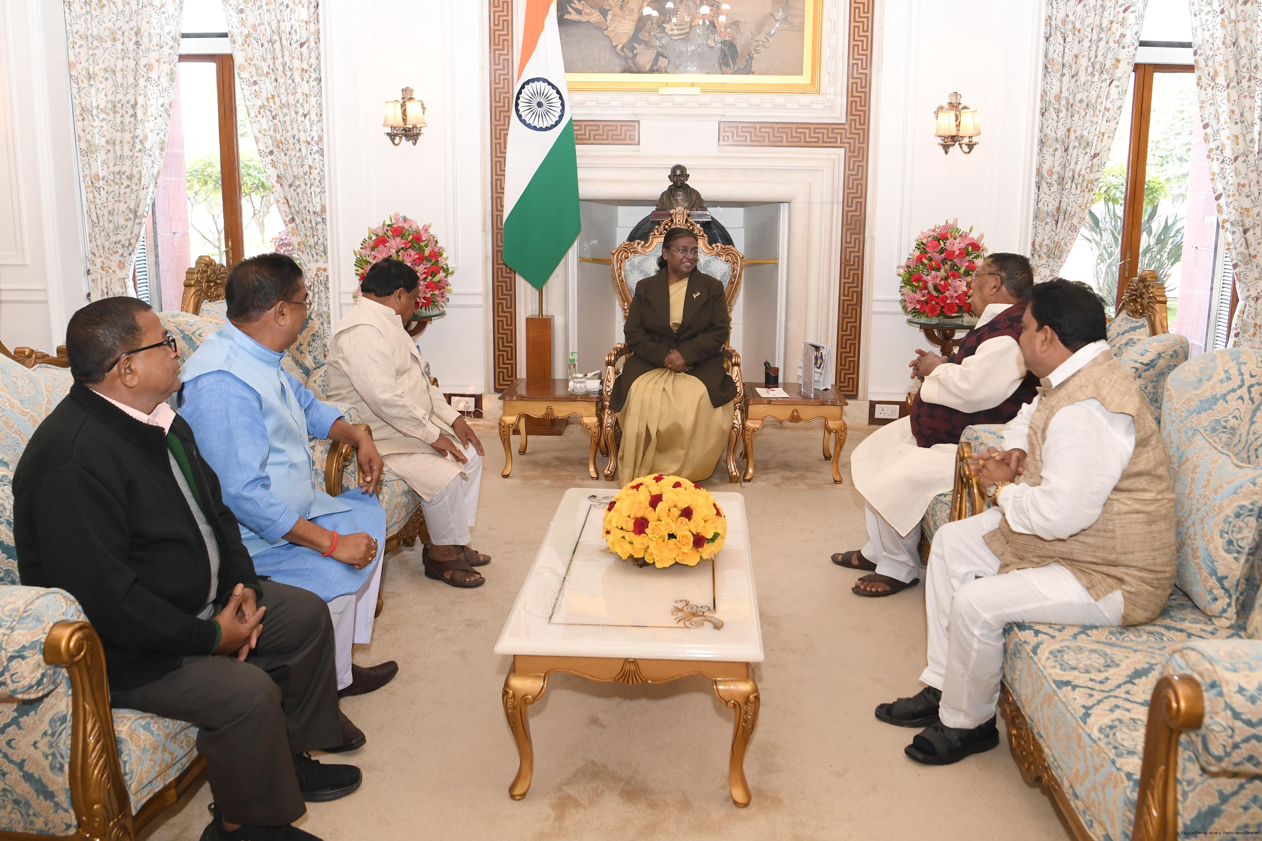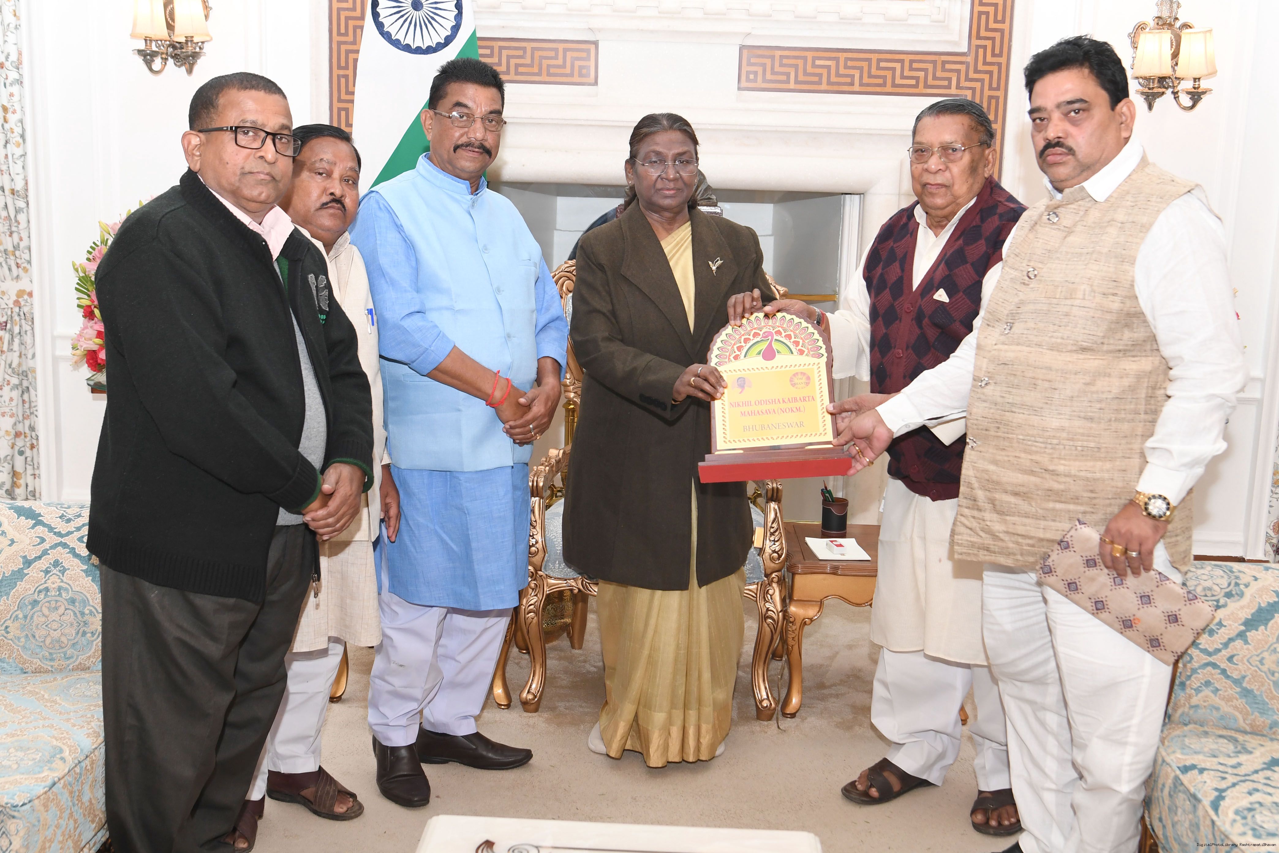 | Caption: | Shri Jogendra Behera, State President, Nikhila Odisha Kaibarta Mahasava, Bhubaneswar along with others meething with the President of India Smt. Droupadi Murmu at Rashtrapati Bhavan on February 6, 2024. |