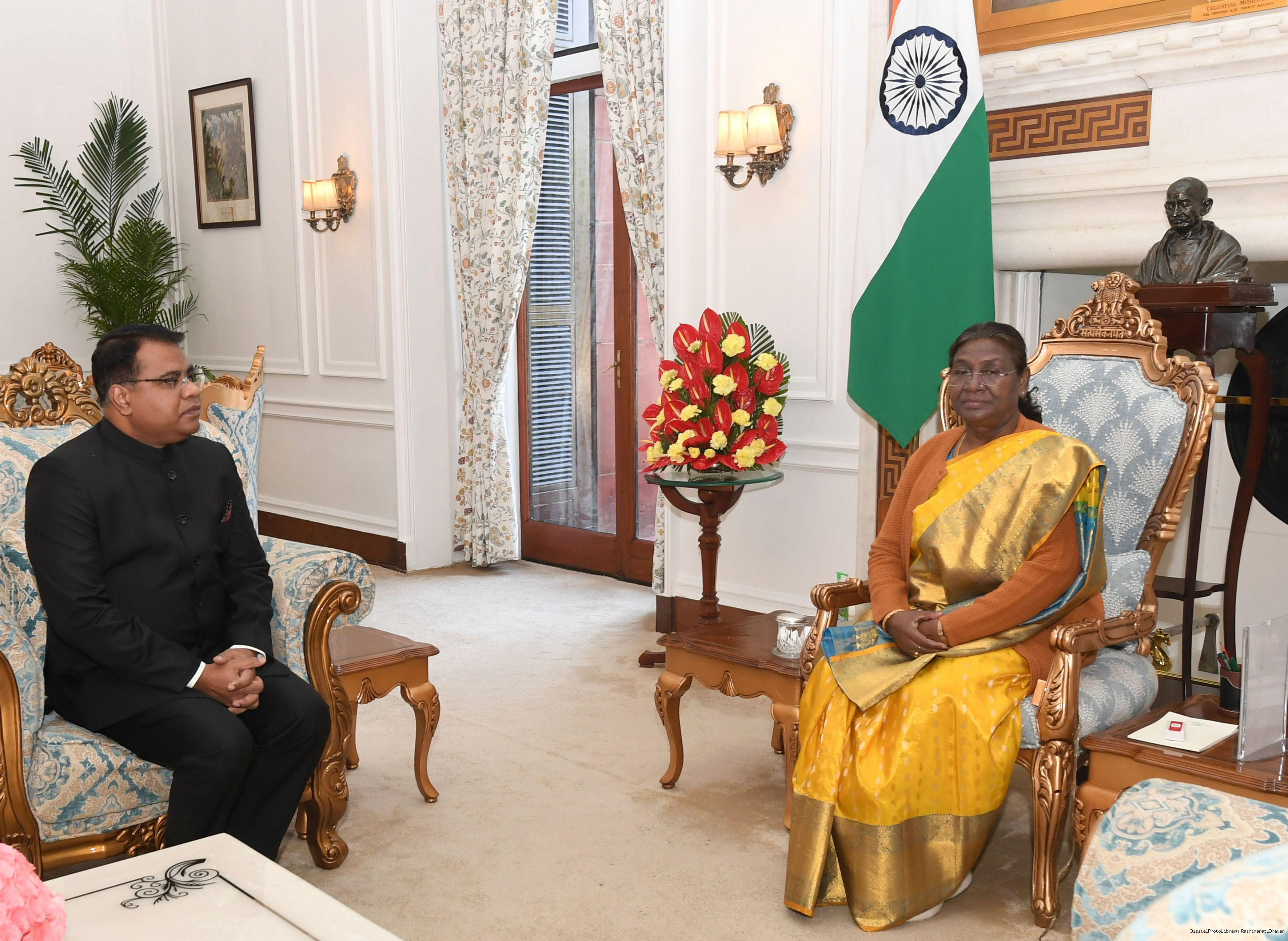 | Caption: | The Ambassador-designate of India to the Republic of Tajikistan, Shri Rajesh Uike meething with the President of India Smt. Droupadi Murmu at Rashtrapati Bhavan on February 7, 2024. |