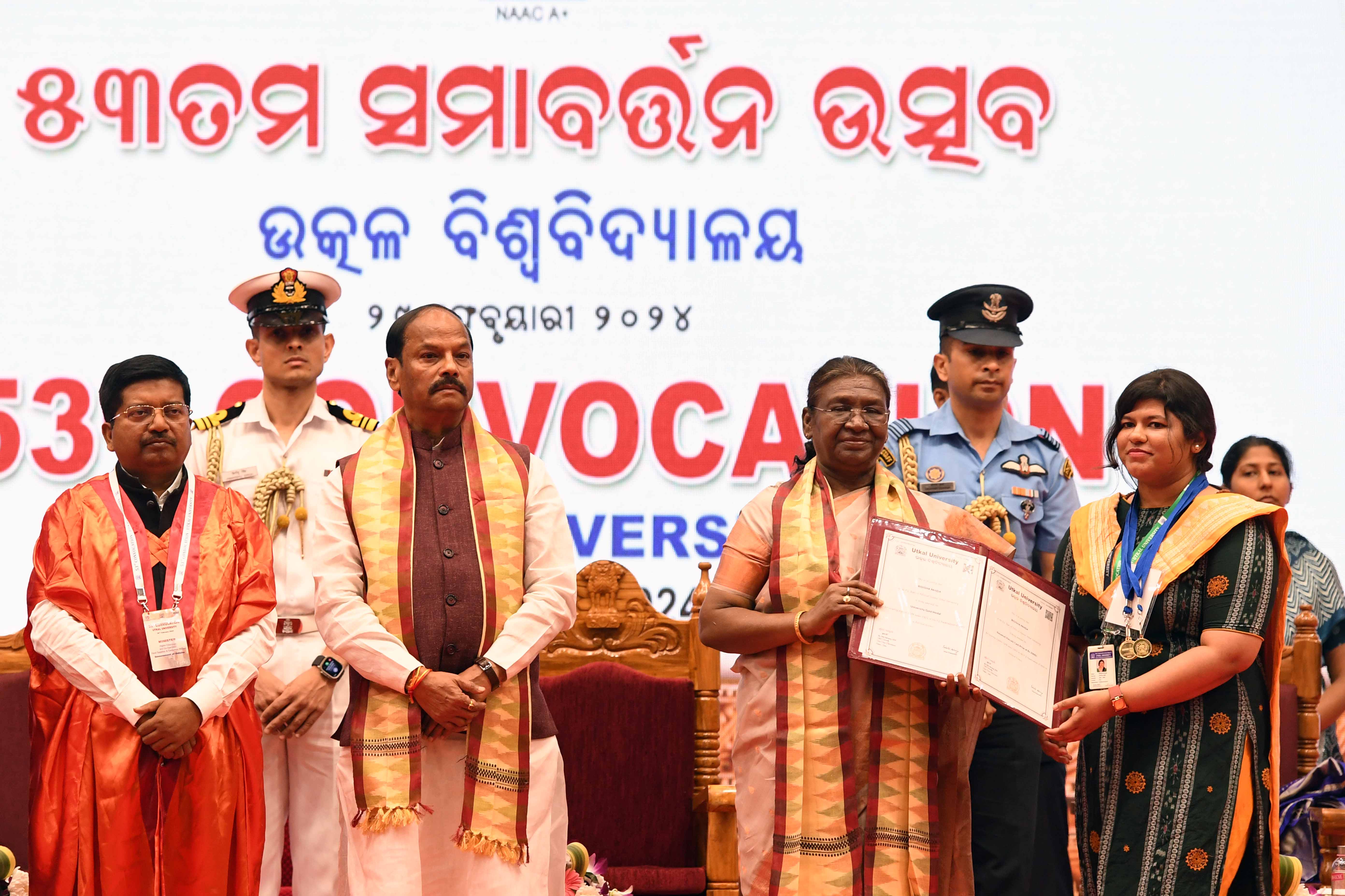 | Caption: | The President of India, Smt Droupadi Murmu graced and addressed 53rd convocation of Utkal University at Bhubaneswar on February 29, 2024. |