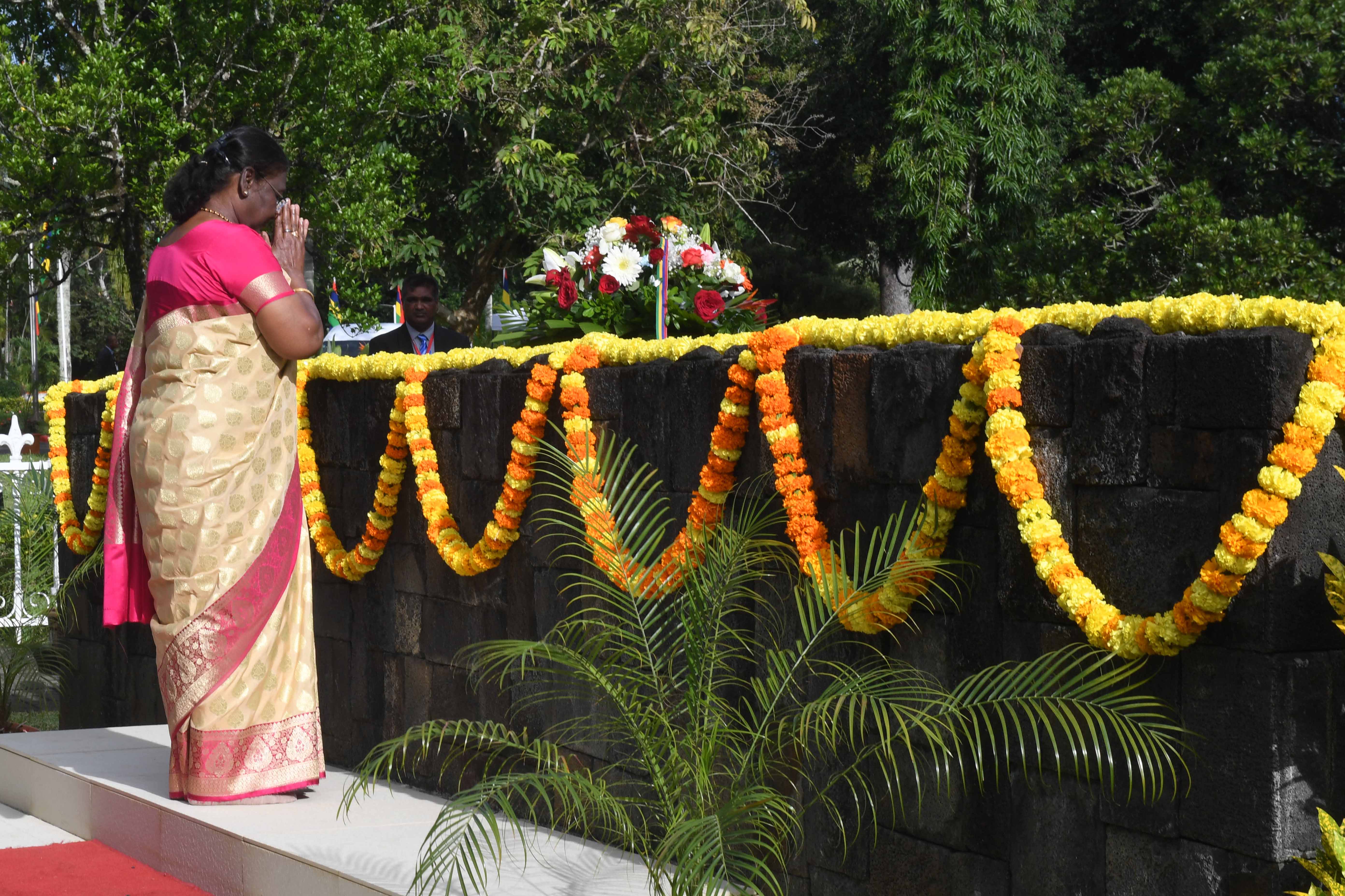 | Caption: | The President of India Smt Droupadi Murmu paid tribute to Sir Seewoosagur Ramgoolam and Sir Anerood Jugnauth, two great sons of Mauritius, at the Botanical Gardens in Pamplemousses, Mauritius on March 11, 2024. |