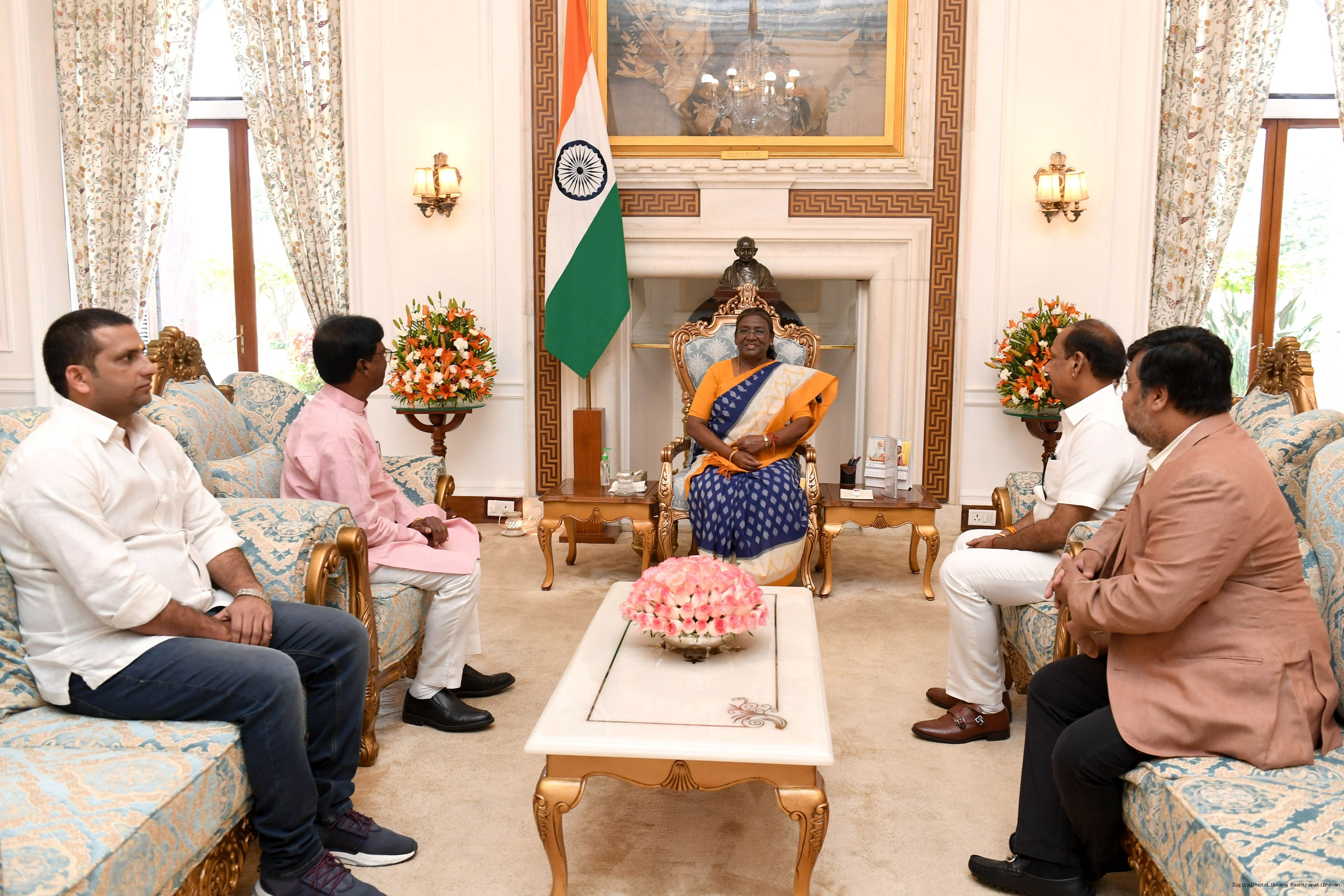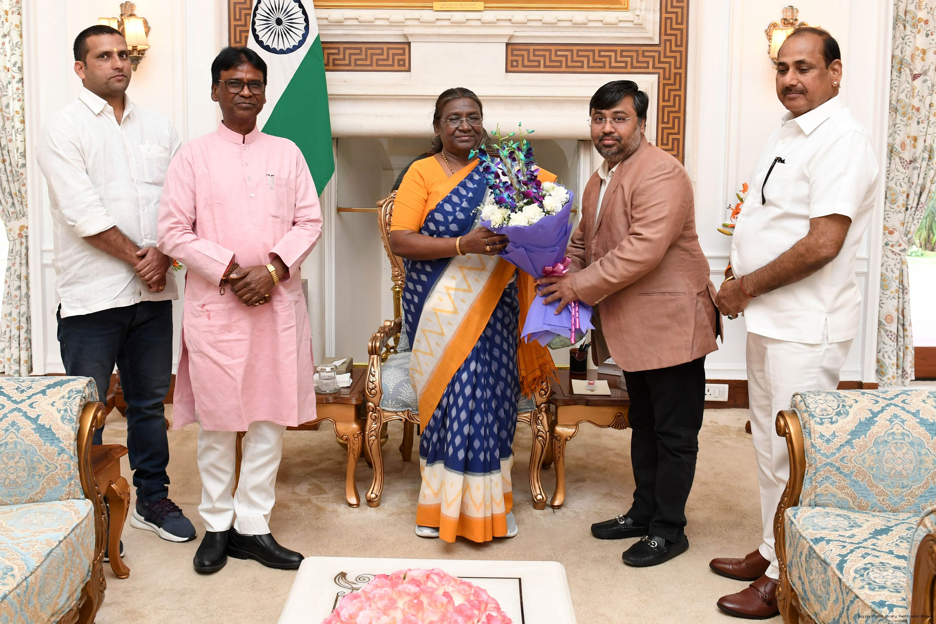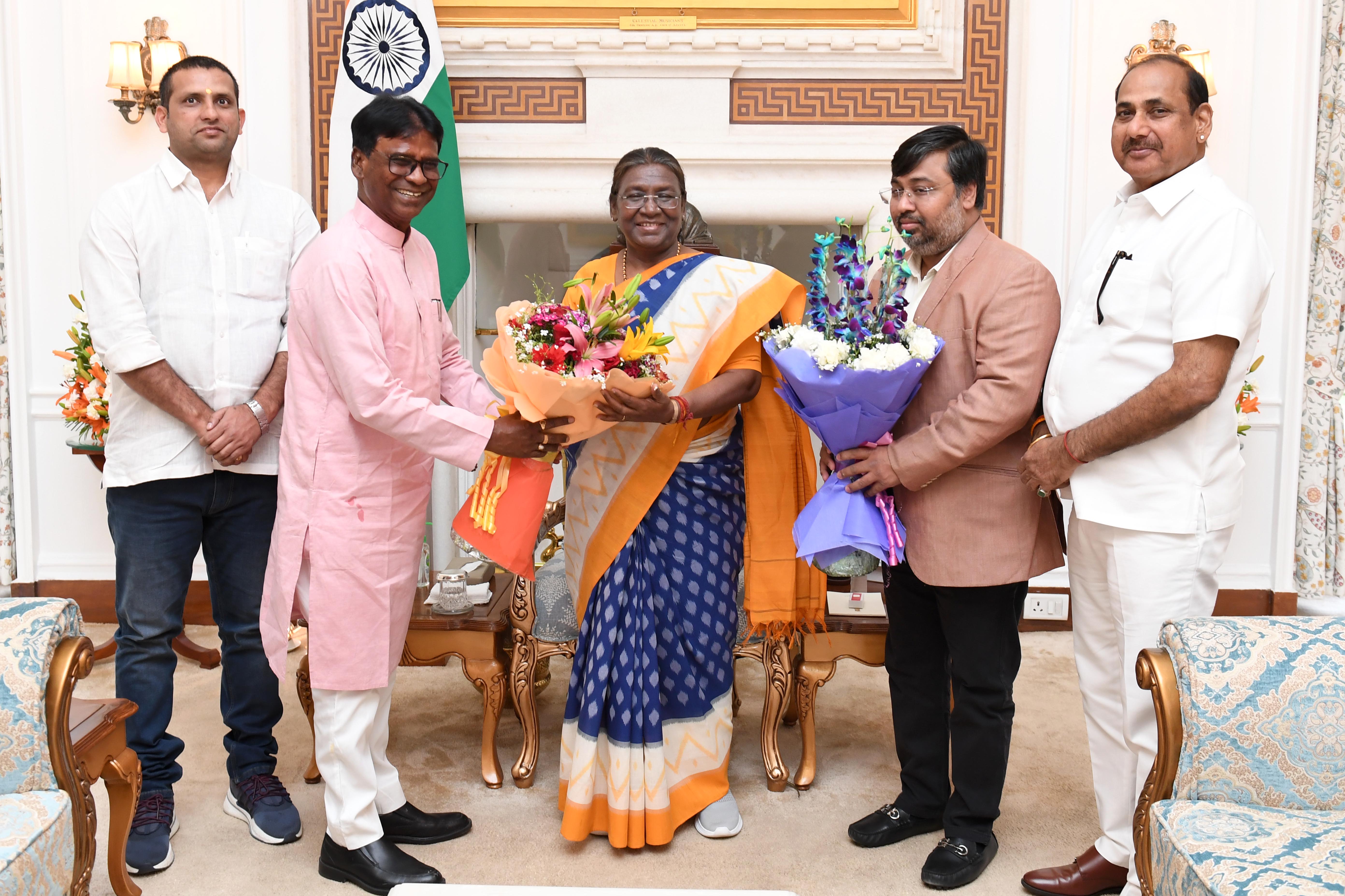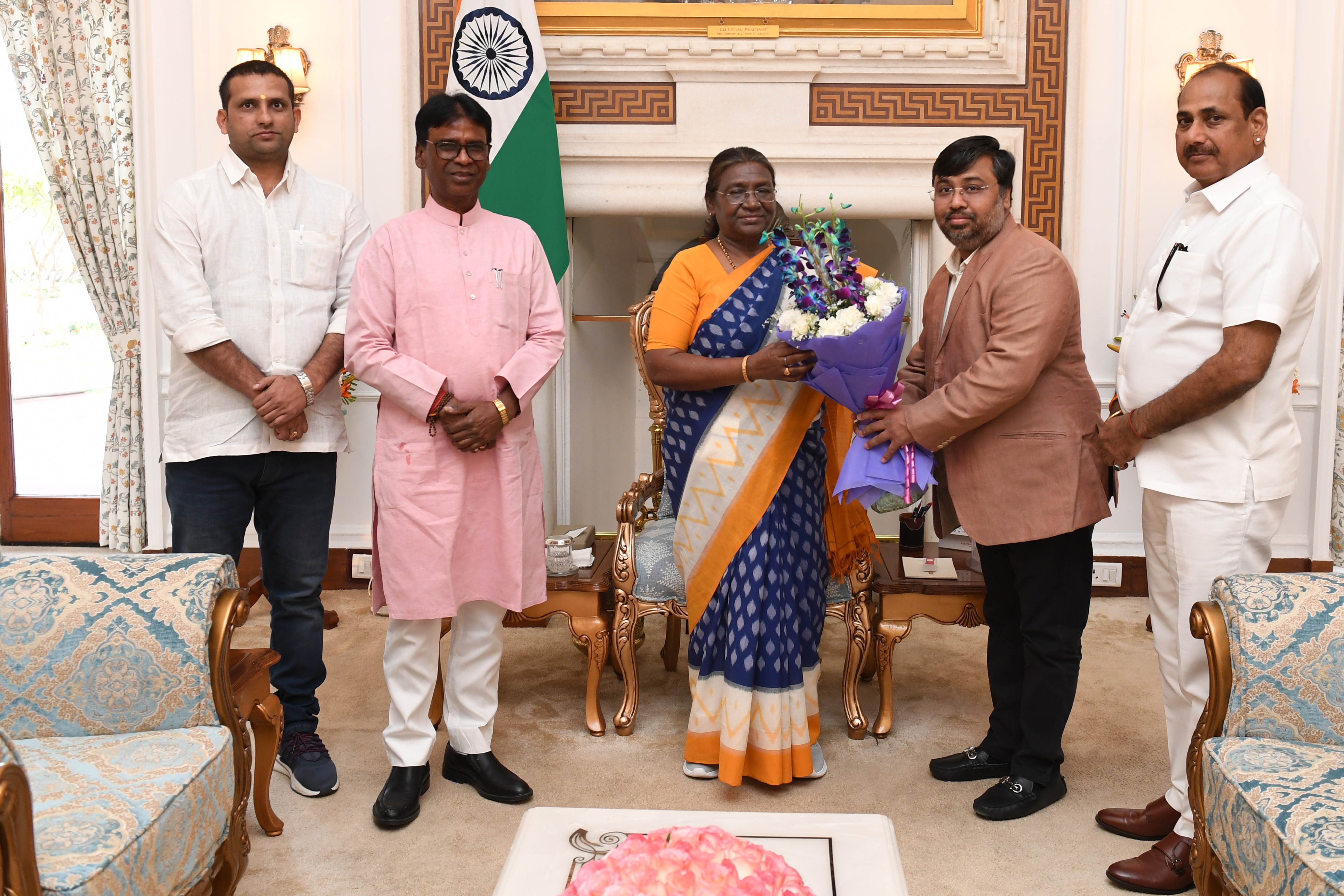 | Caption: | Shri Khagen Murmu, MP (Lok Sabha) along with others meeting with the President of India Smt Droupadi Murmu at Rashtrapati Bhavan on March 21, 2024. |