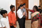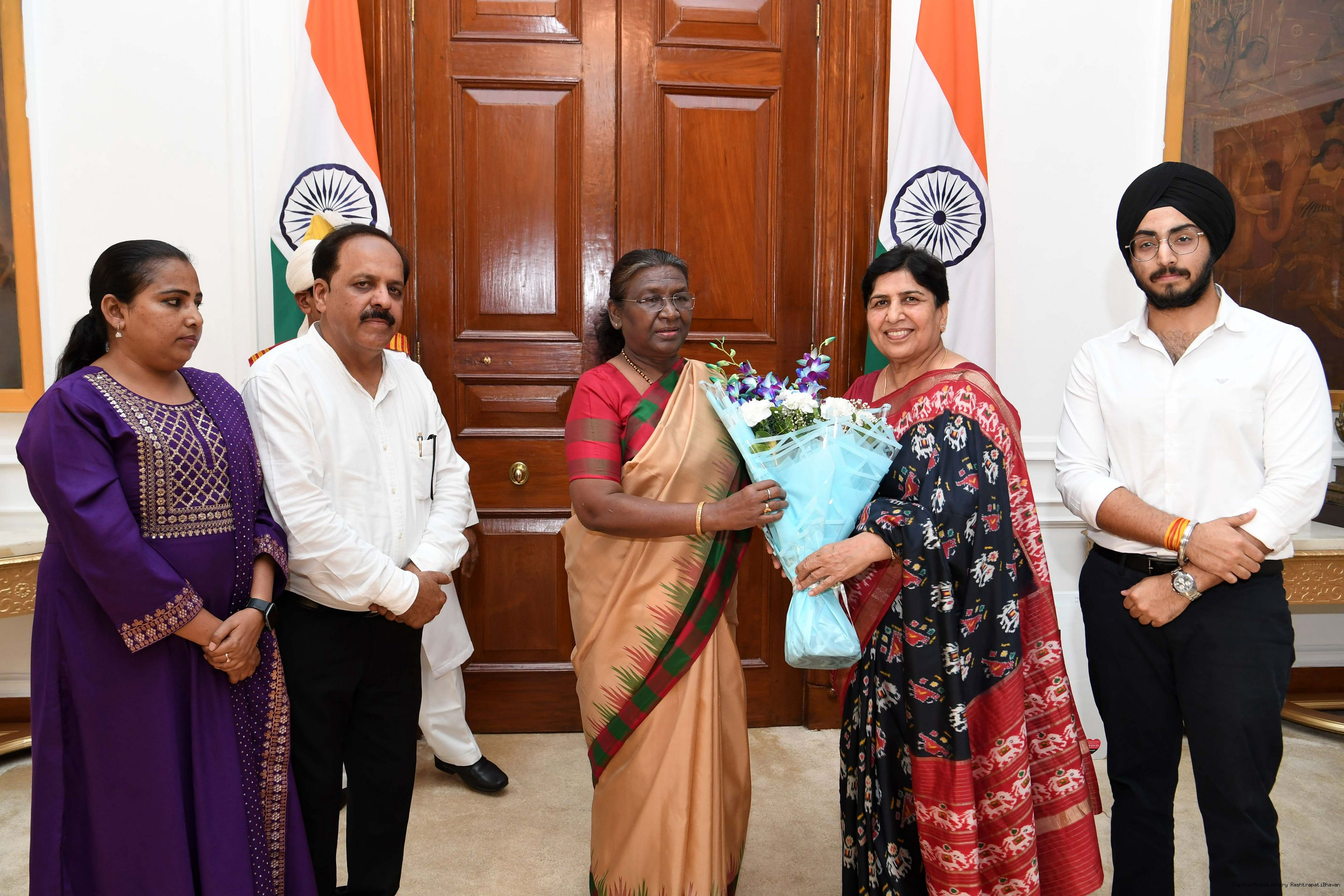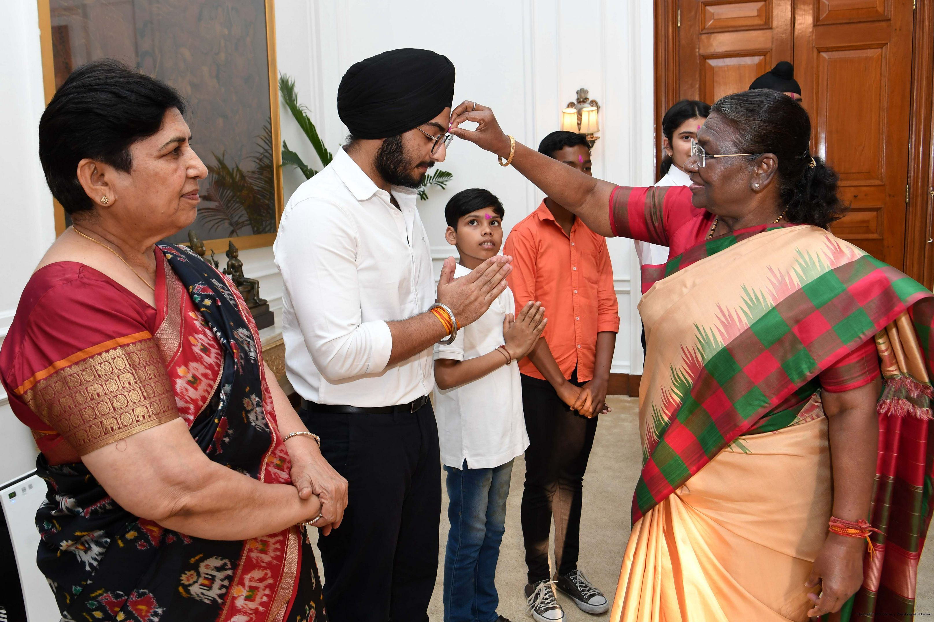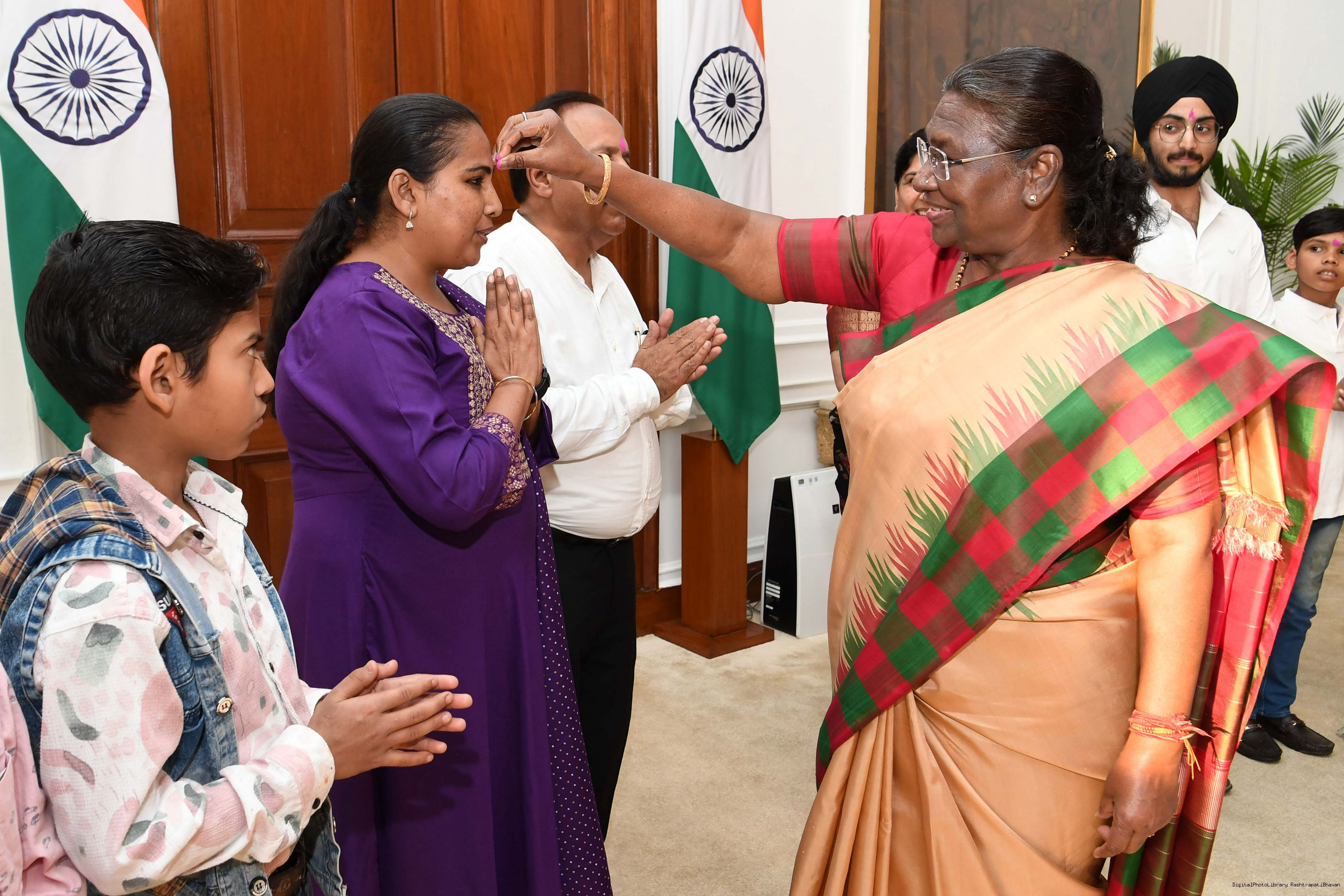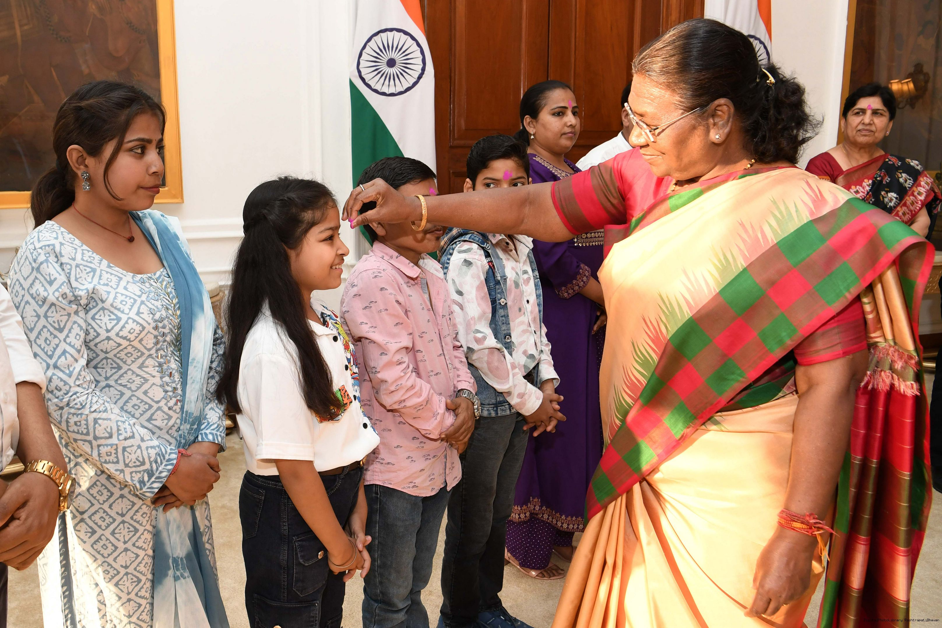 | Caption: | The President of India Smt Droupadi Murmu receiving the Holi greetings from 10 students, 3 staff from Care for Thalassaemia, Faridabad at Rashtrapati Bhavan on March 22, 2024. |