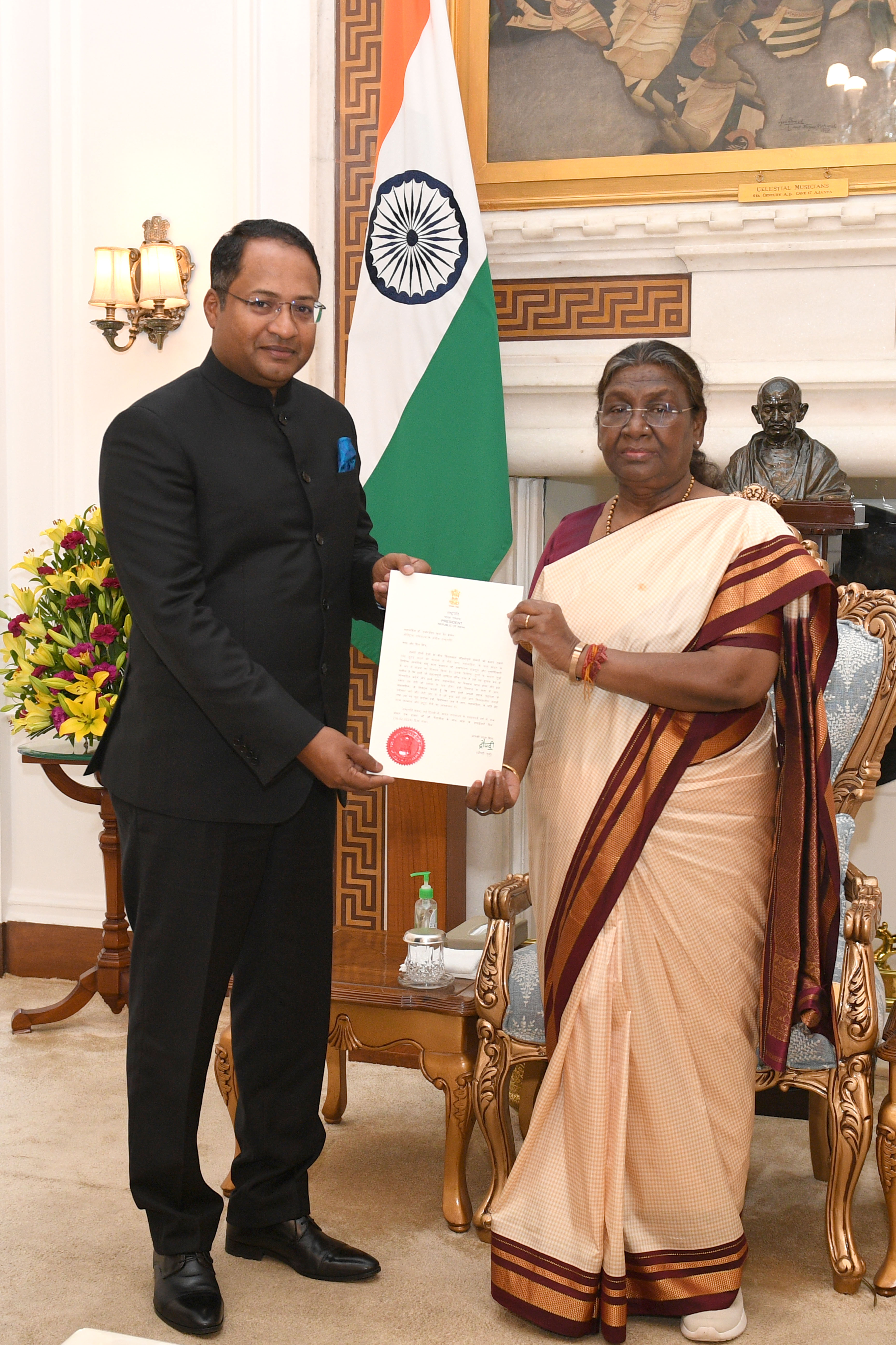 | Caption: | The Ambassador-designate of India to the Republic of Austria, Shri Shambhu Kumaran meeting with the President of India Smt Droupadi Murmu at Rashtrapati Bhavan on April 3, 2024. |
