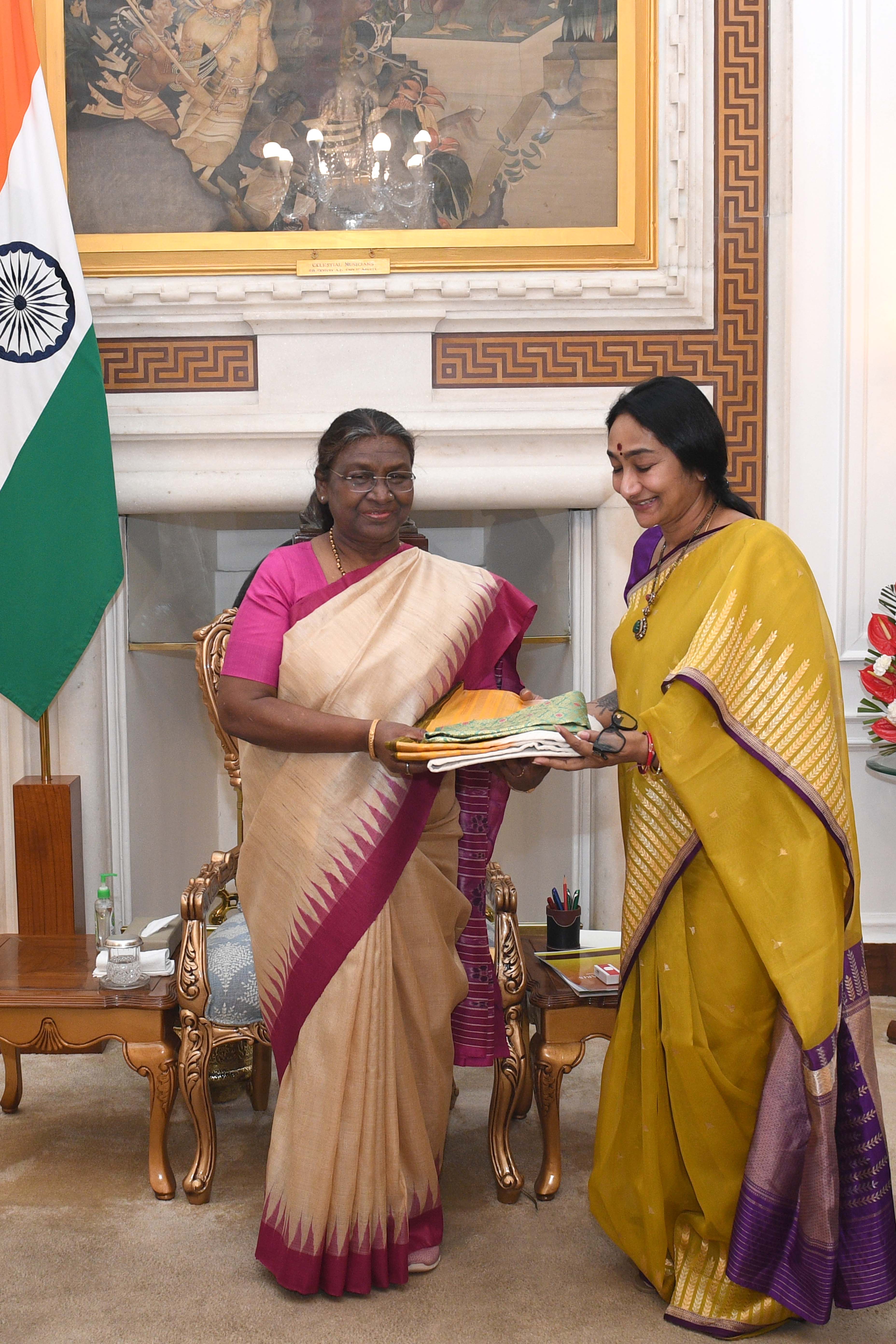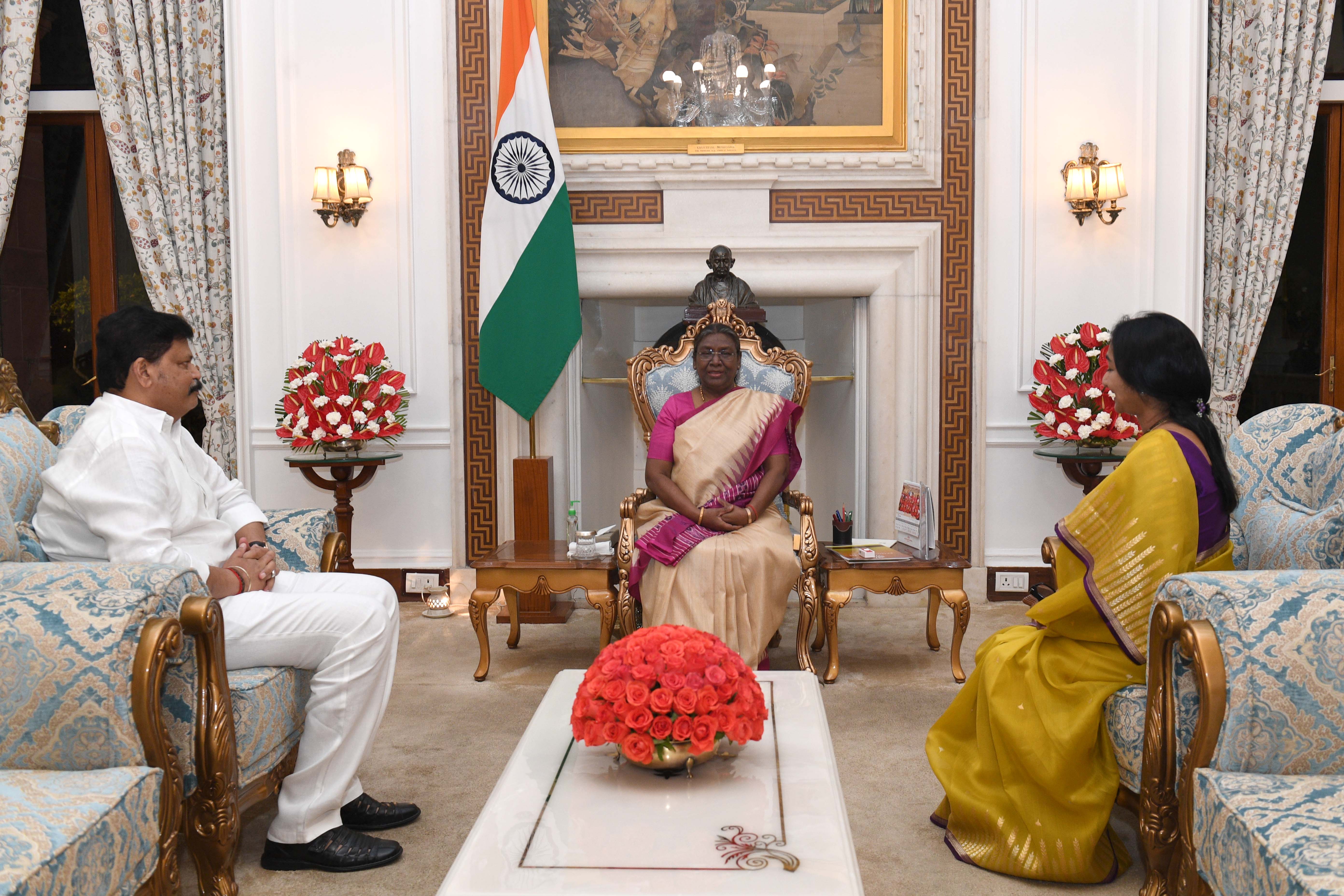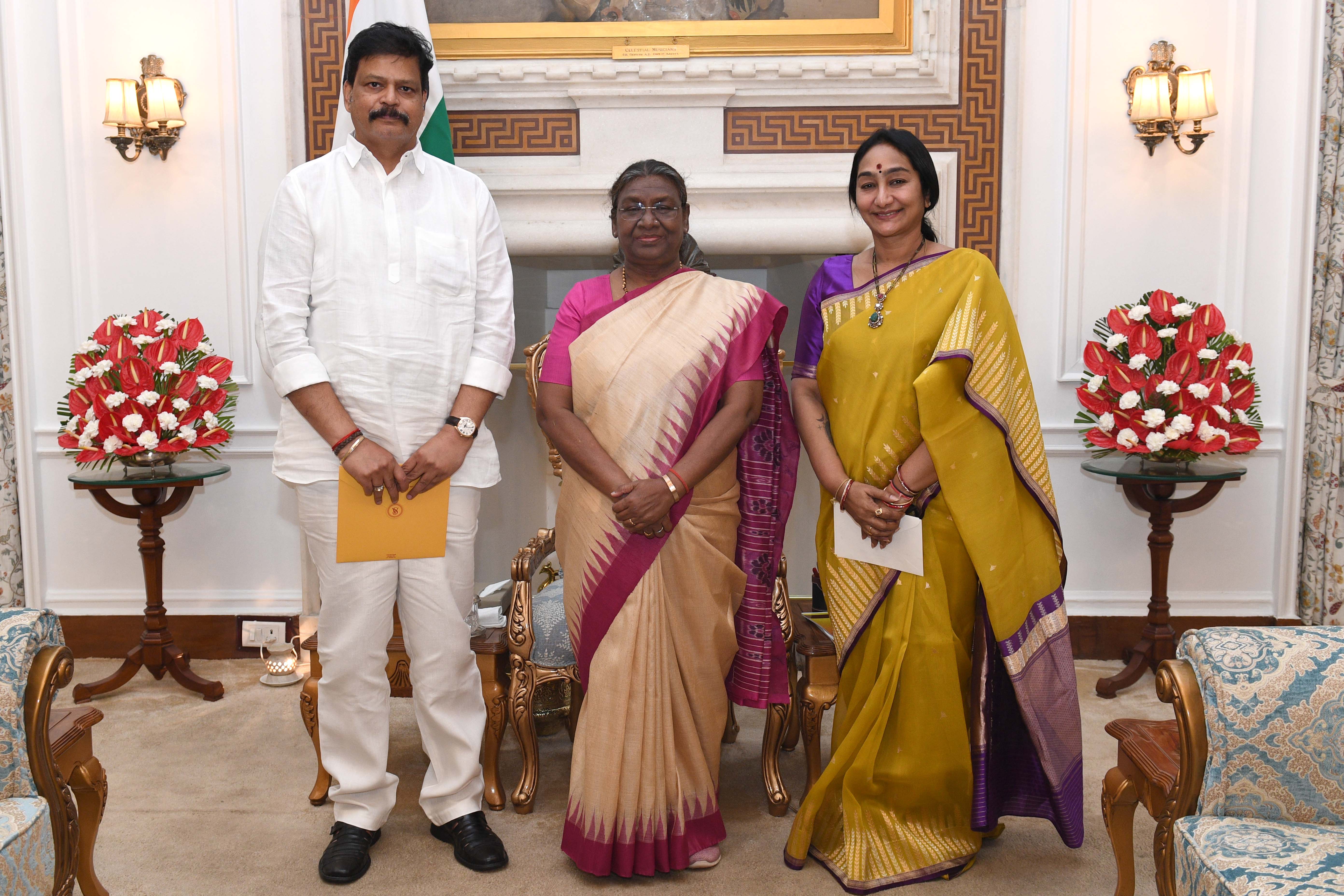 | Caption: | Shri Muppavarapu Harshavardhan and Smt. Radha Muppavarapu meeting with the President of India Smt Droupadi Murmu at Rashtrapati Bhavan on April 22, 2024. |