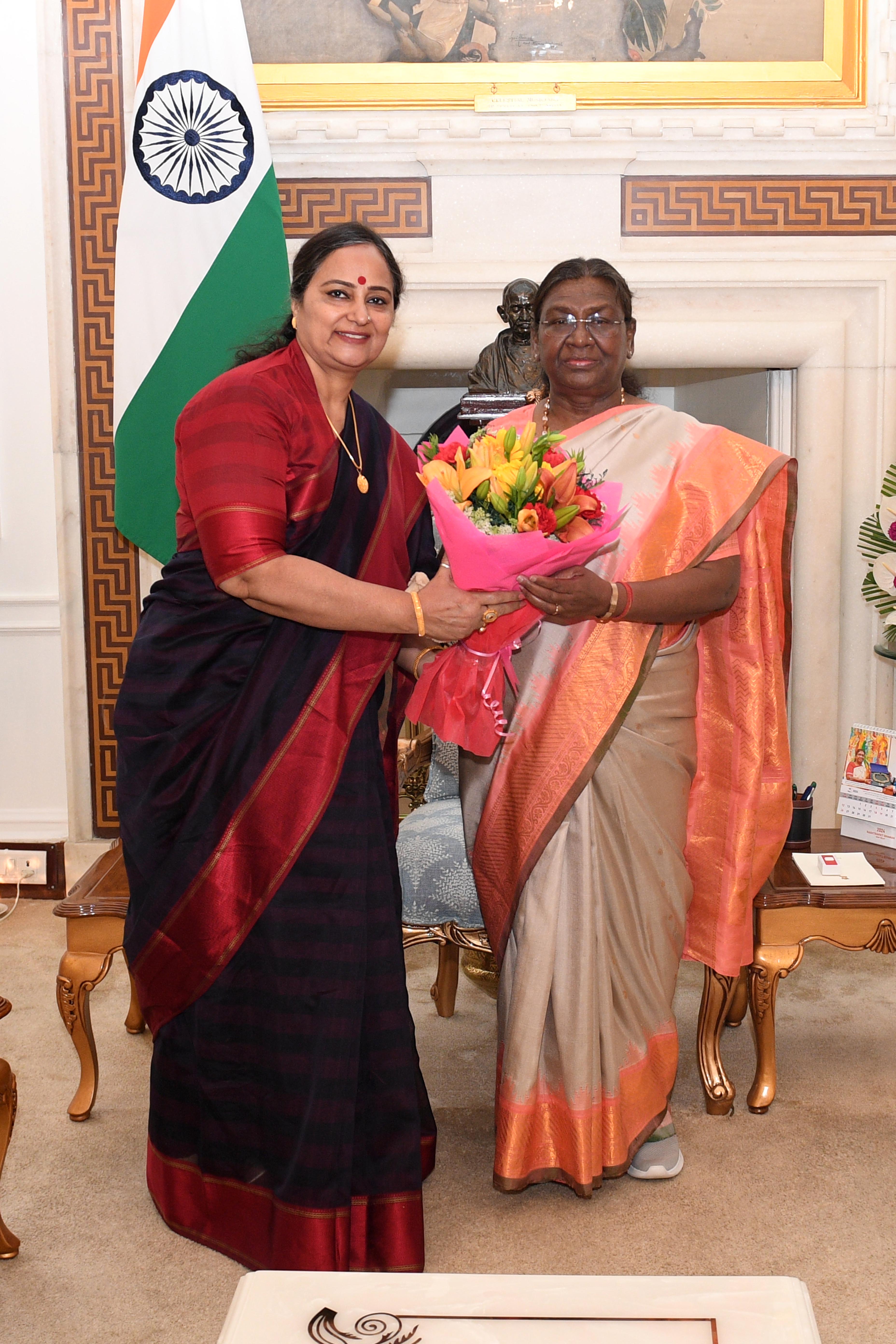 | Caption: | Prof. Alpana Kateja, Vice Chancellor, University of Rajasthan, Jaipur meeting with the President of India Smt Droupadi Murmu at Rashtrapati Bhavan on May 15, 2024. |