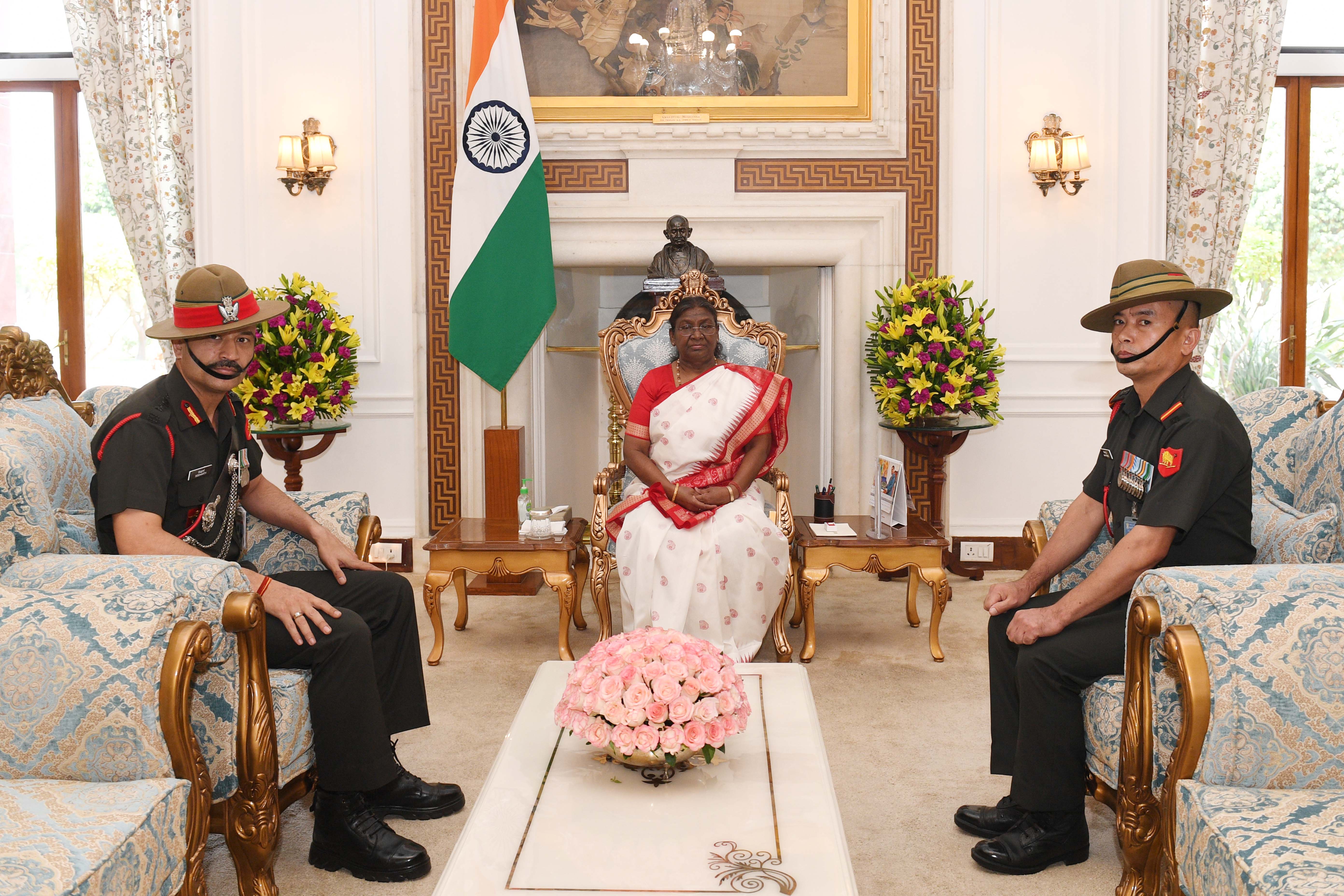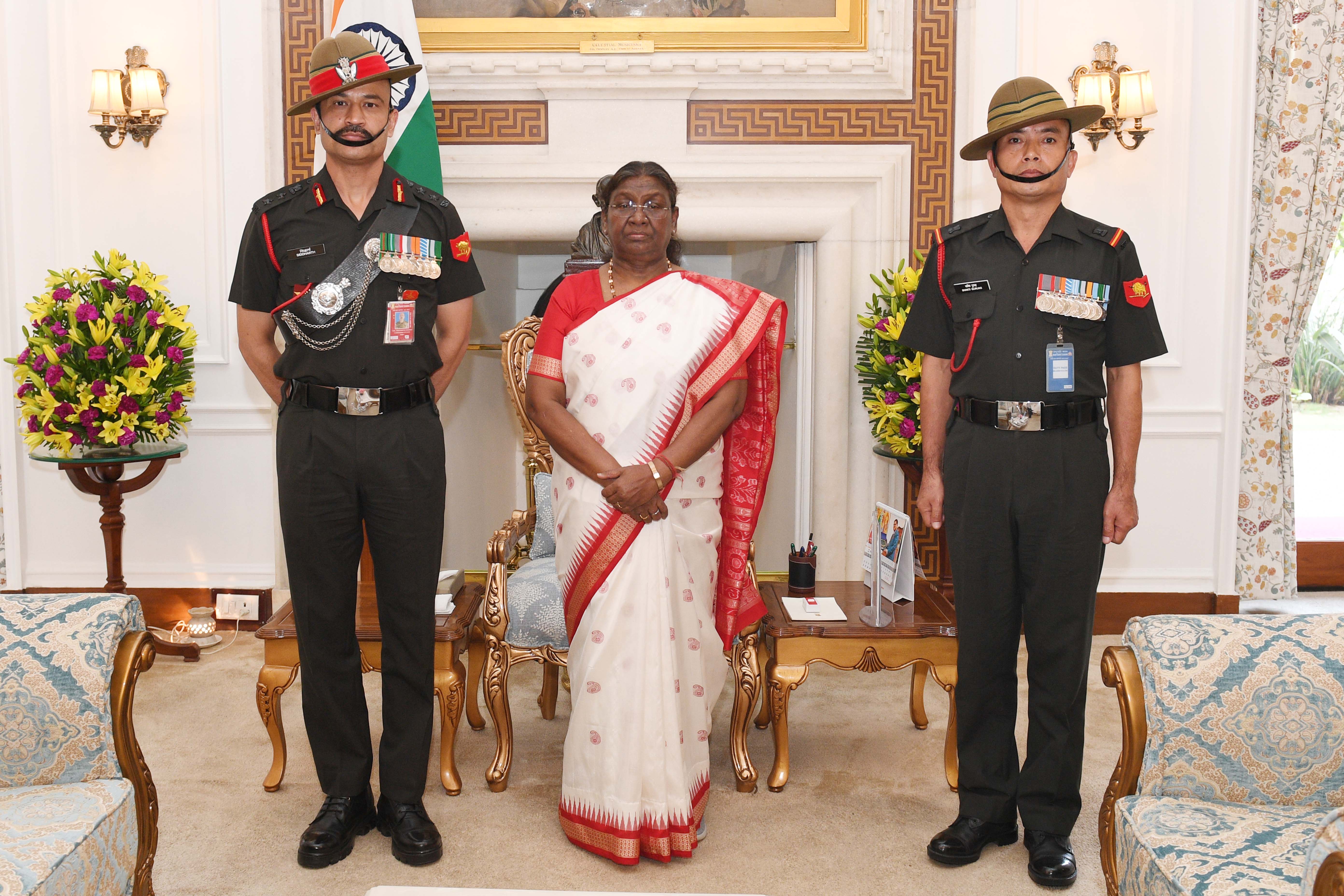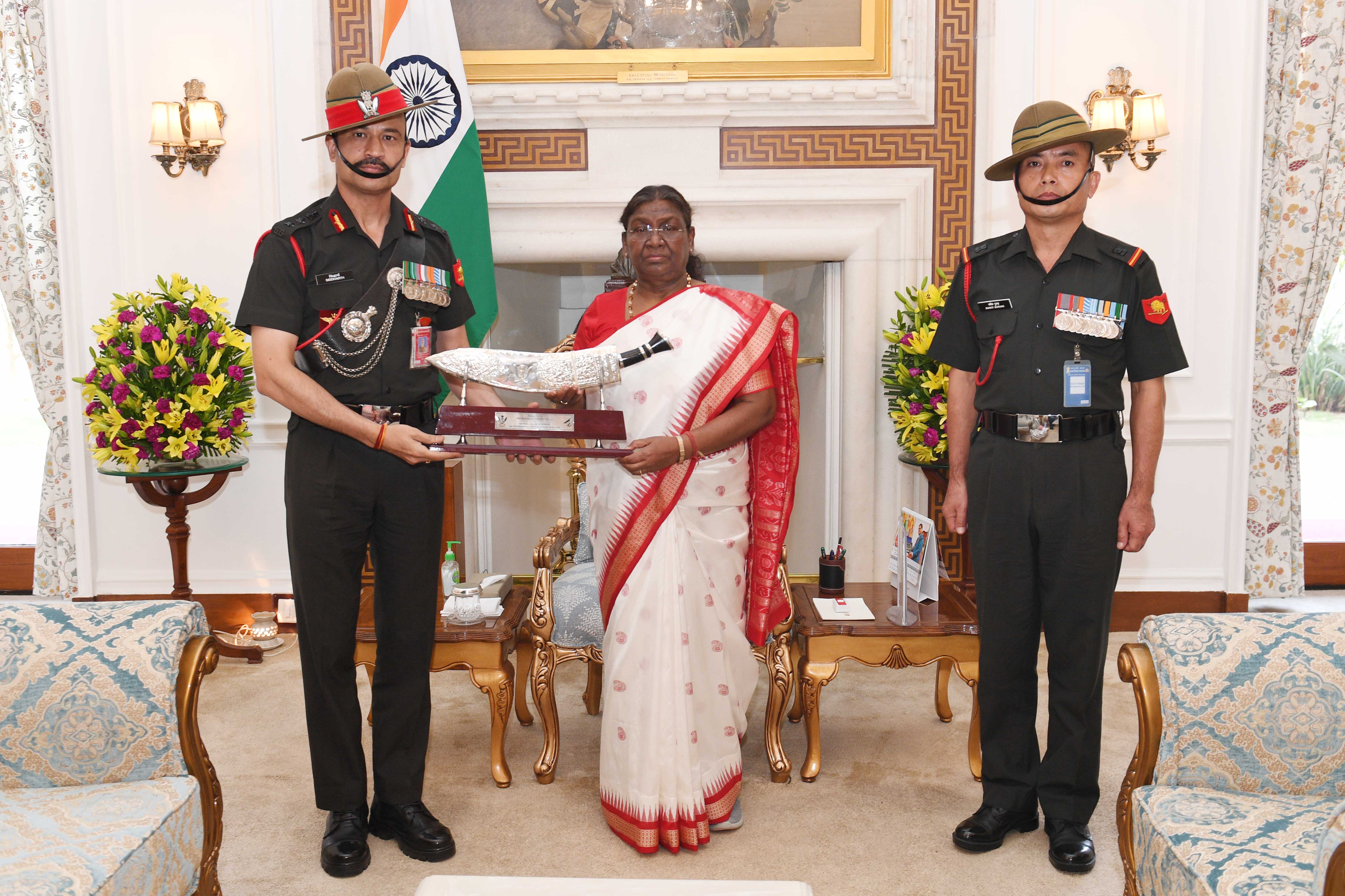| Caption: | Col Siddharath Dhukia, CO 15 GR (FF) and Sub Maj Shakti Gurung meeting with the President of India Smt Droupadi Murmu at Rashtrapati Bhavan on May 20, 2024. |