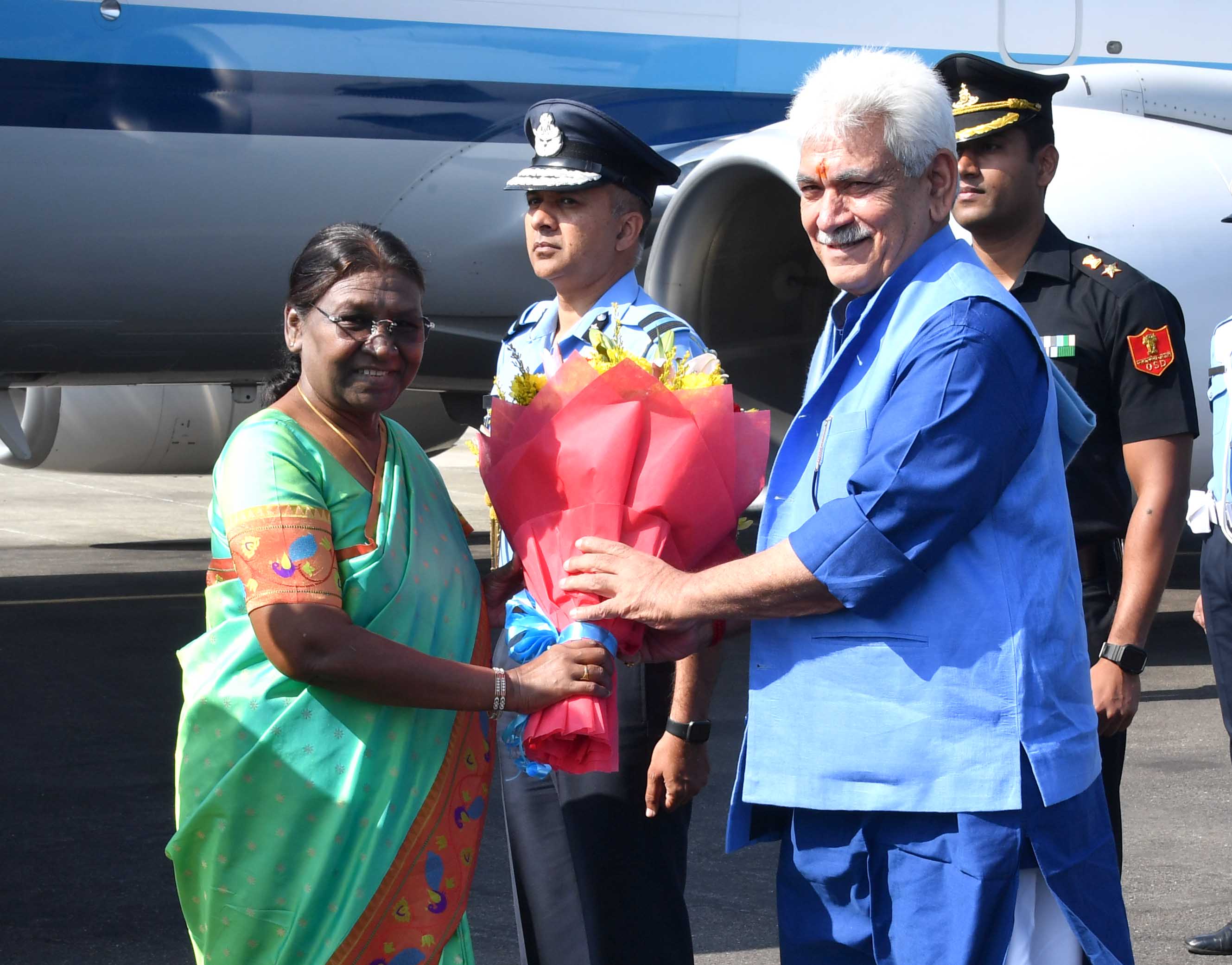 | Caption: | The Lt Governor of Jammu Kashmir, Shri Manoj Sinha received the President of India Smt. Droupadi Murmu on her arrival at Srinagar, Jammu and Kashmir on October 11, 2023. |