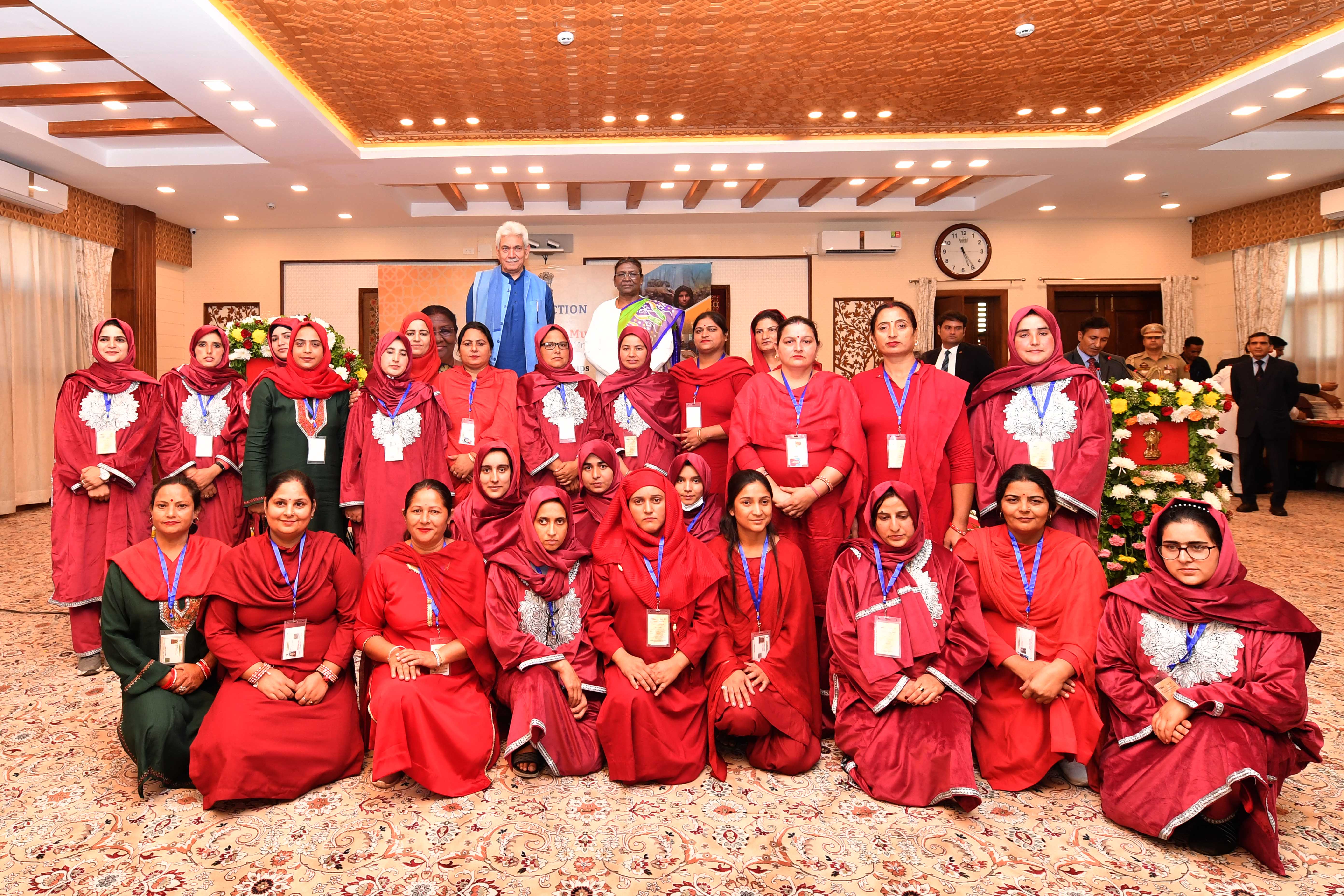 | Caption: | The President of India, Smt Droupadi Murmu interacted with the members of local tribal groups and women Self Help Groups at Raj Bhavan, Srinagar, Jammu and Kashmir on October 11, 2023. |