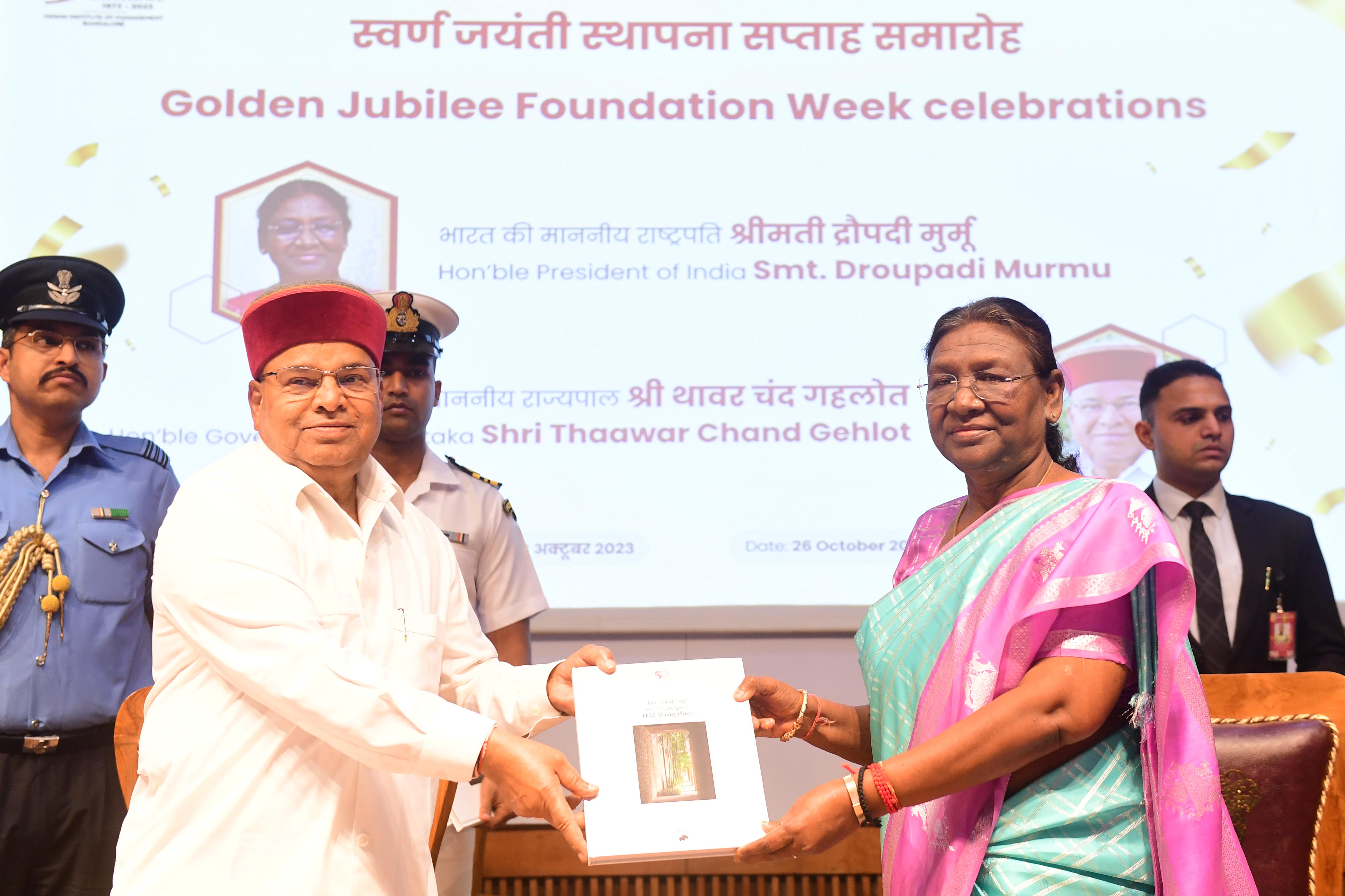 | Caption: | The President of India, Smt Droupadi Murmu inaugurating the Foundation Week of Indian Institute of Management Bangalore as part of its golden jubilee celebrations at Bengaluru, Karnataka on October 26, 2023. |