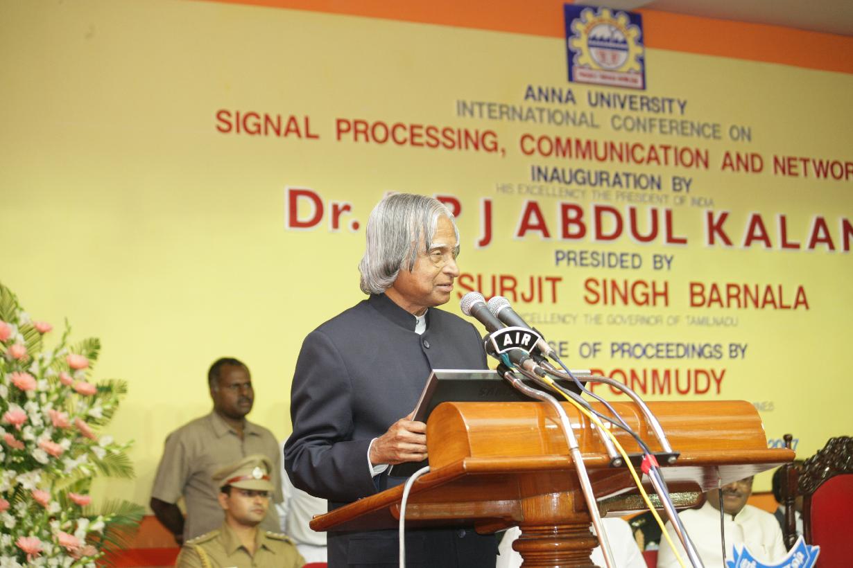 | Caption: | The President of India, Dr A P J Abdul Kalam at the Inaugural Function of International Conference on Signal Processing Communications and Networking (ICSCN) at Chennai in Tamil Nadu on Feb 23, 2007 |