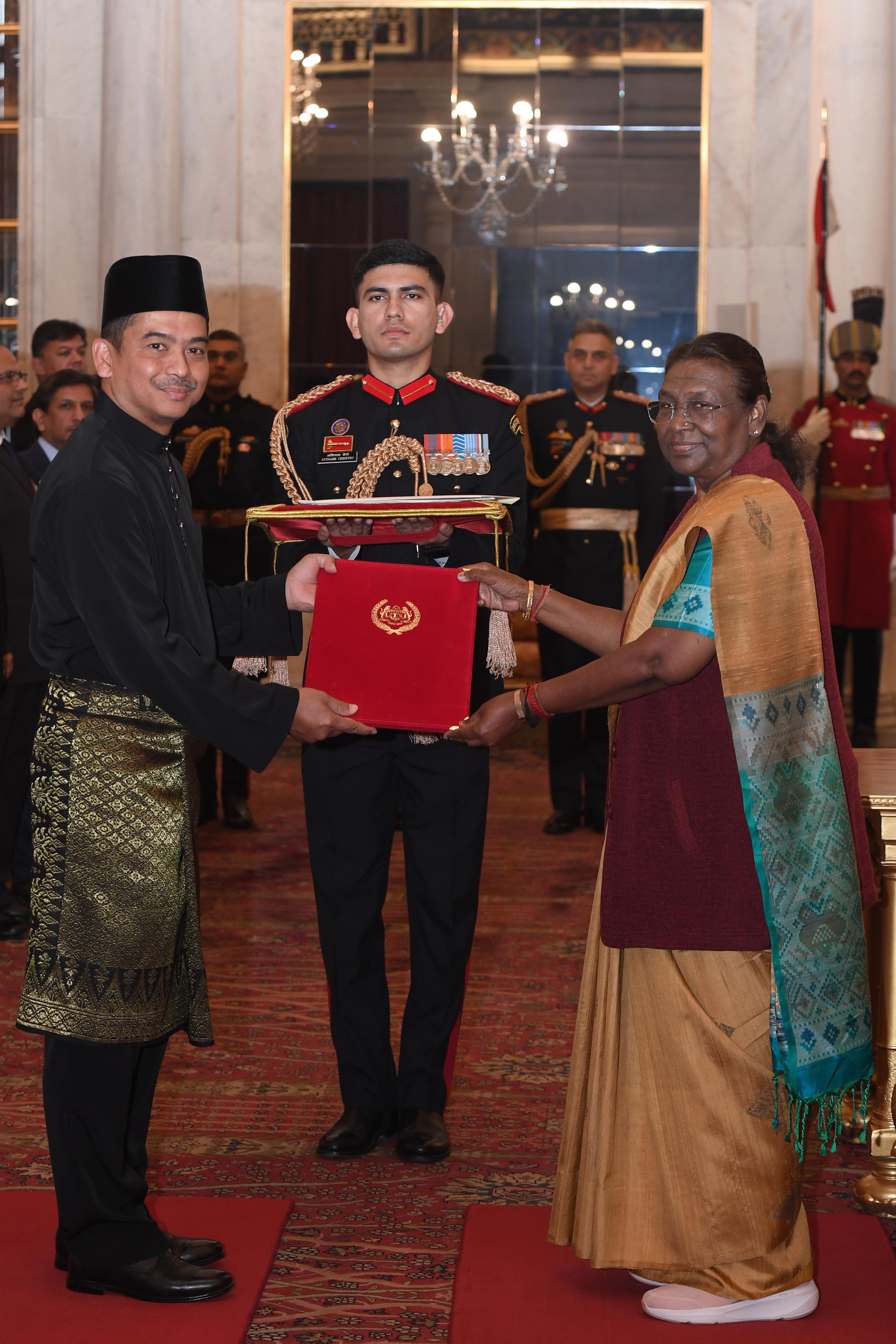 | Caption: | The High Commissioner-designate of Malaysia, H.E. Mr Muzafar Shah Bin Mustafa presenting his credentials to the President of India, Smt Droupadi Murmu at Rashtrapati Bhavan on November 28, 2023. |