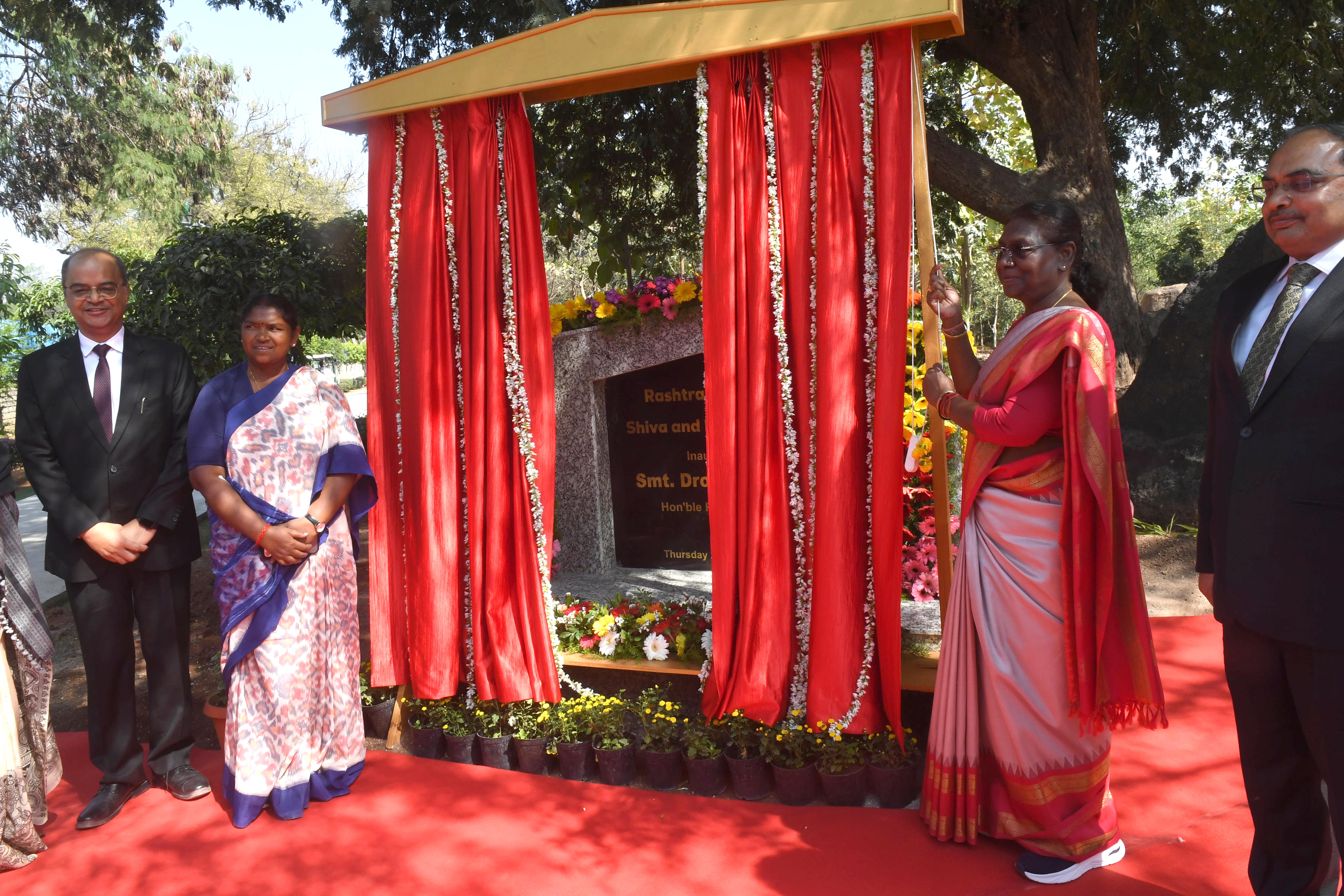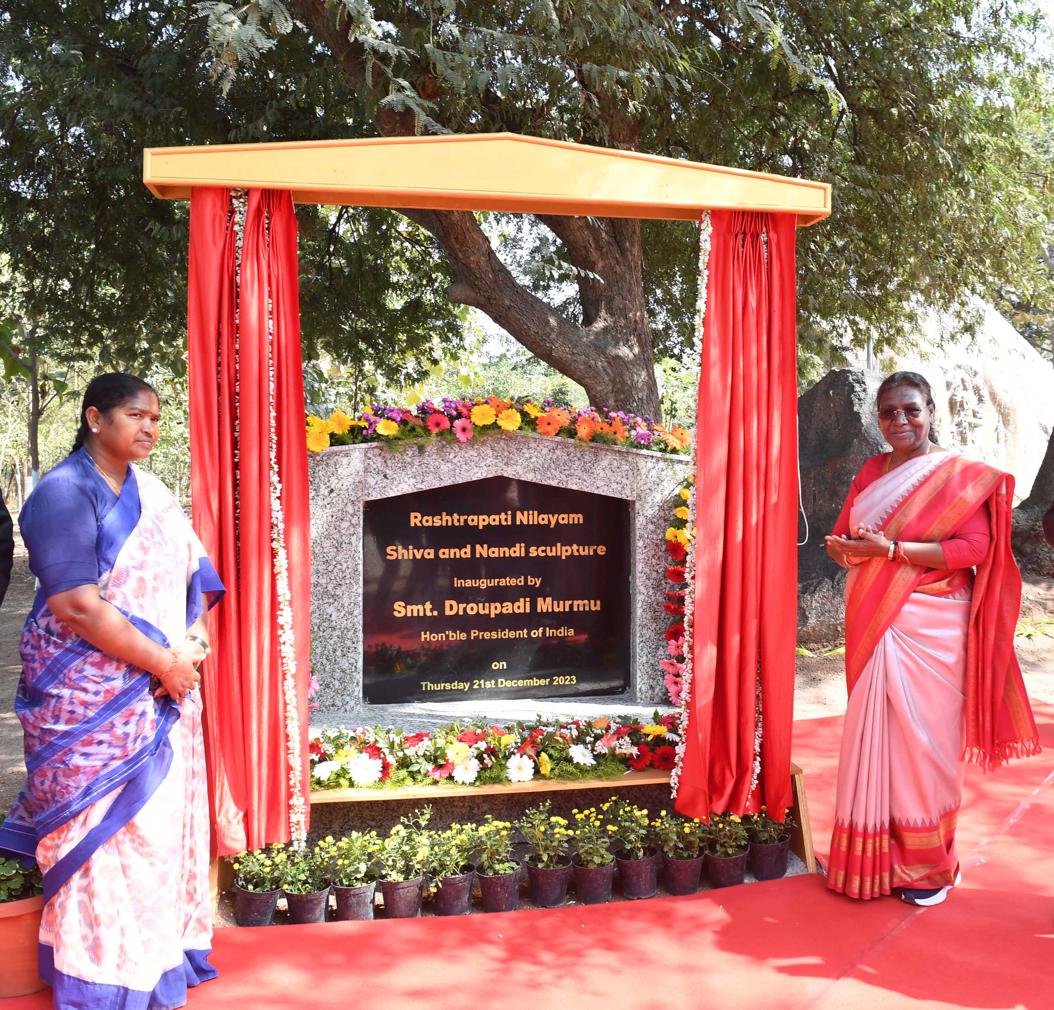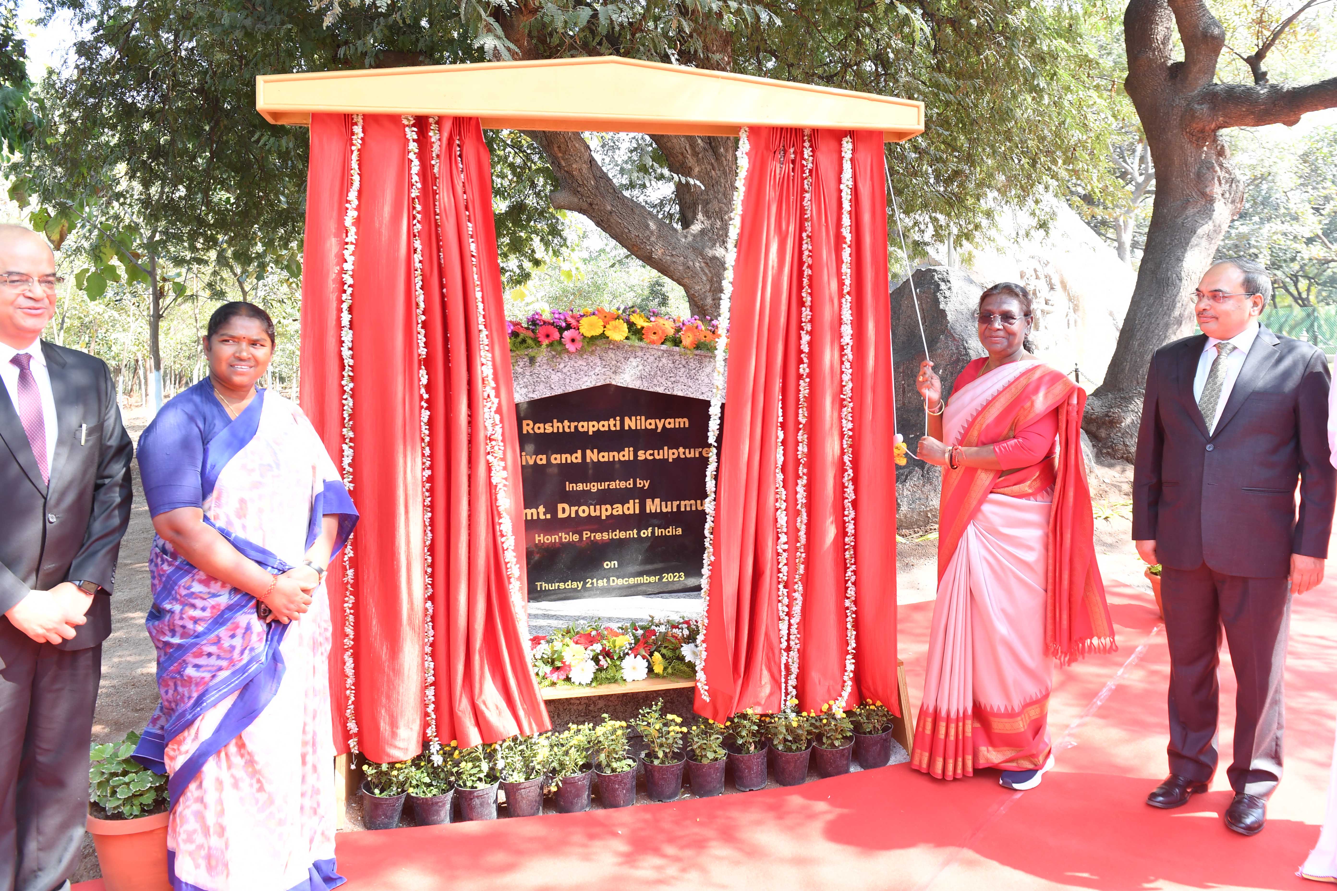 | Caption: | The President of India, Smt Droupadi Murmu inaugurated Shiva and Nandi sculptures on the rock water cascade at Rashtrapati Nilayam at Bolarum, Telangana on December 21, 2023. |