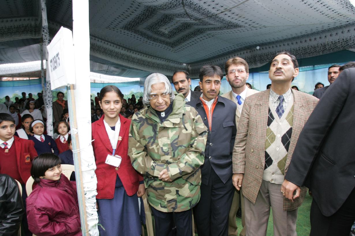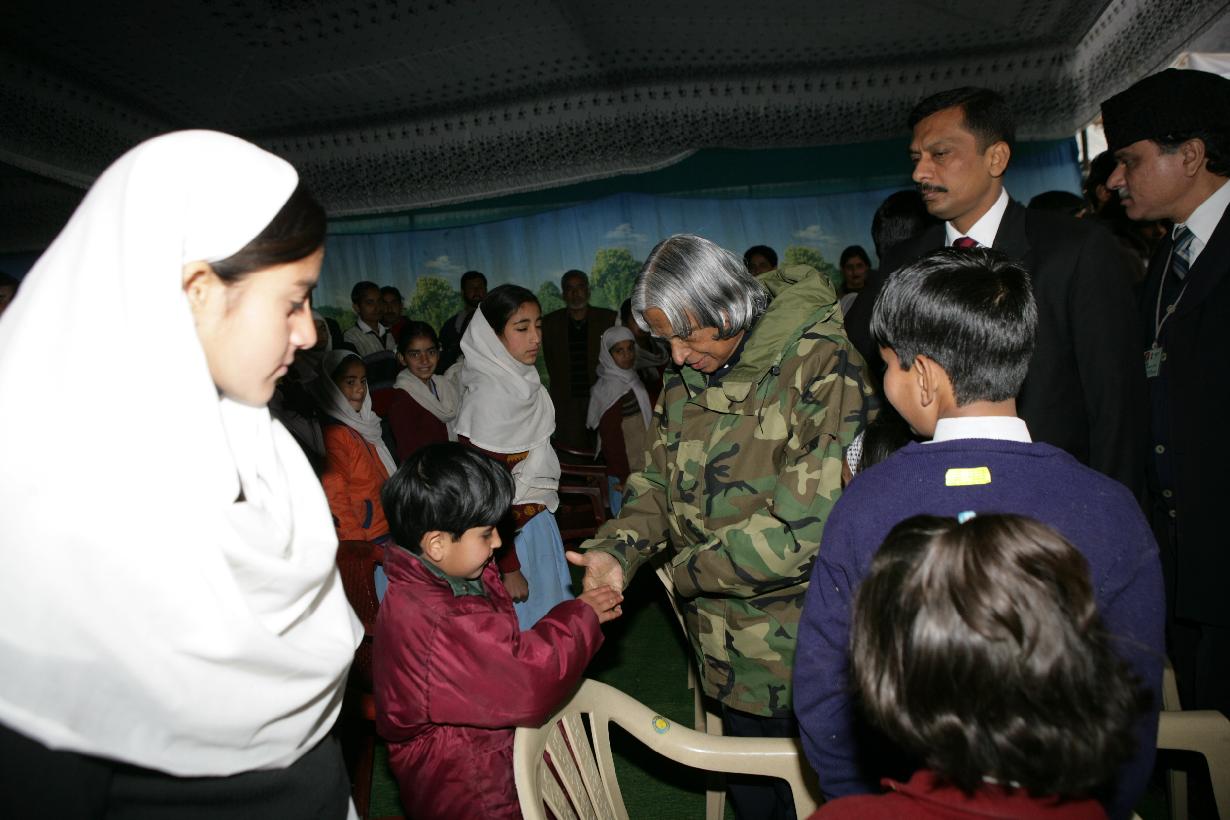 | Caption: | The President of India, Dr A P J Abdul Kalam visiting the Earthquake Affected School and interacting with the School Children at Uri in Jammu & Kashmir on Nov 27, 2005 |