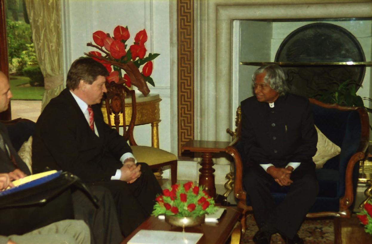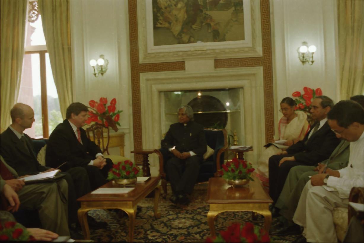 | Caption: | The President of India, Dr A P J Abdul Kalam meeting with the Minister of Foreign Affairs of the Republic of Belarus, HE Mr Mikhail M Khvostov at the Morning Room of Rashtrapati Bhavan in New Delhi on Aug 01, 2002 |