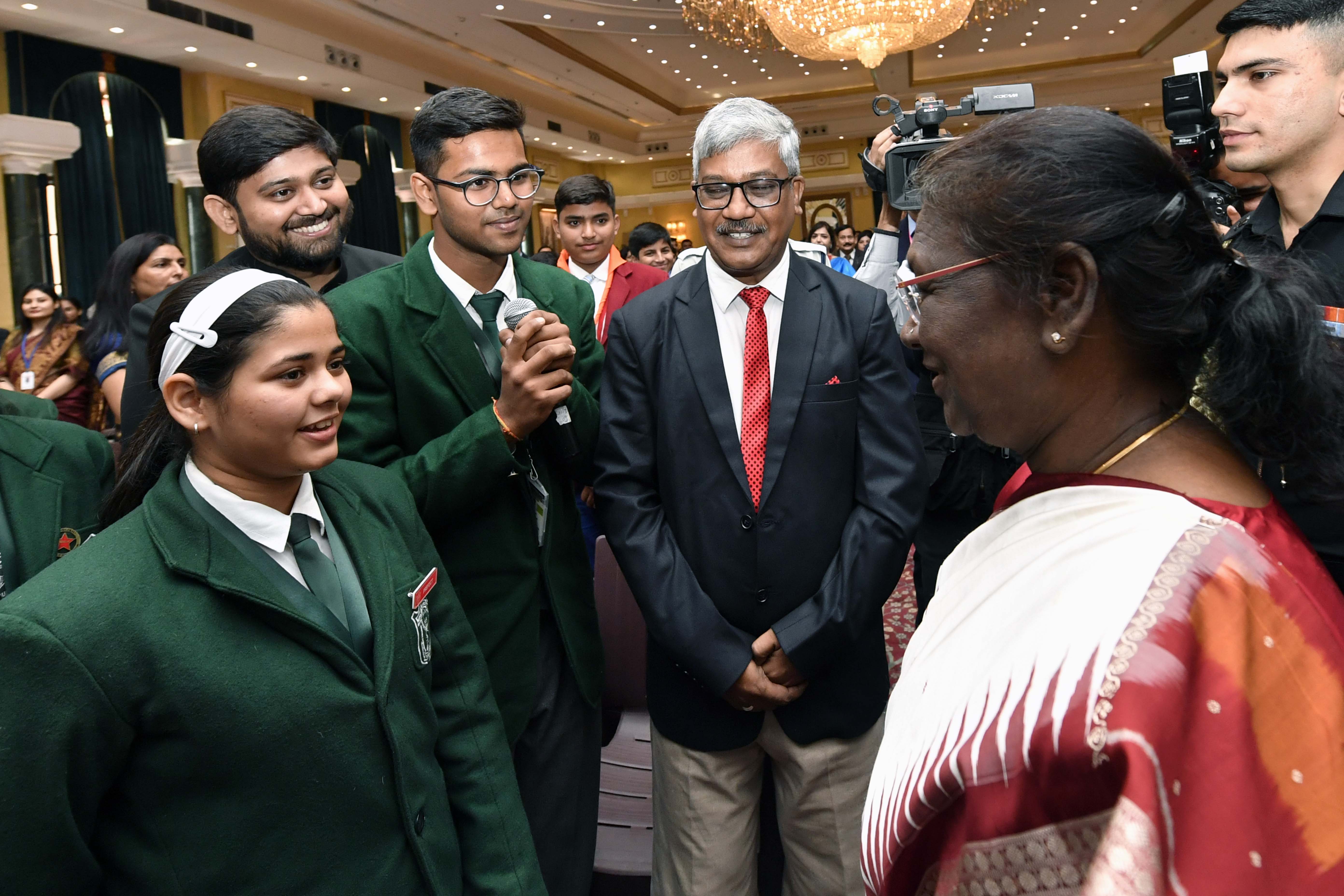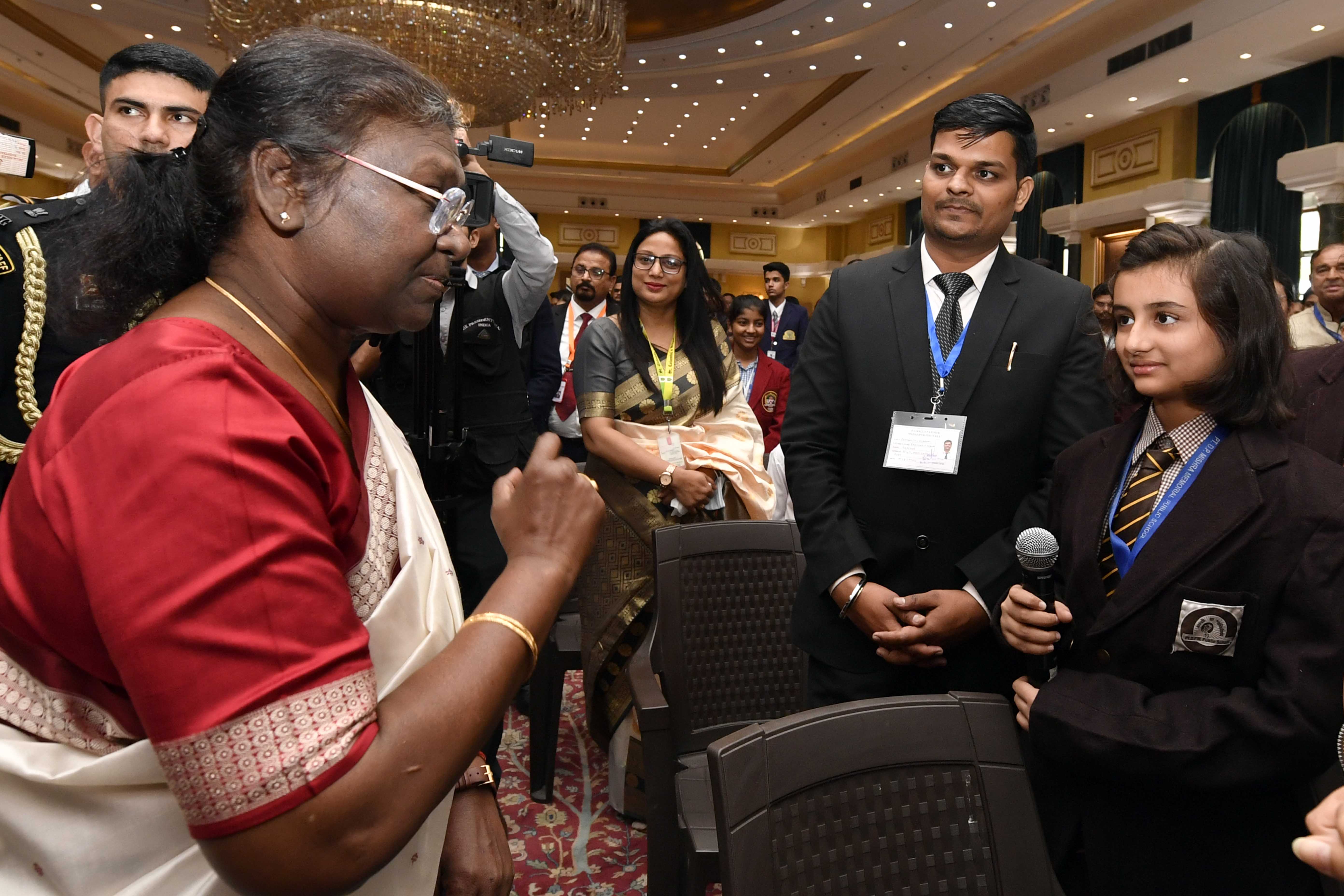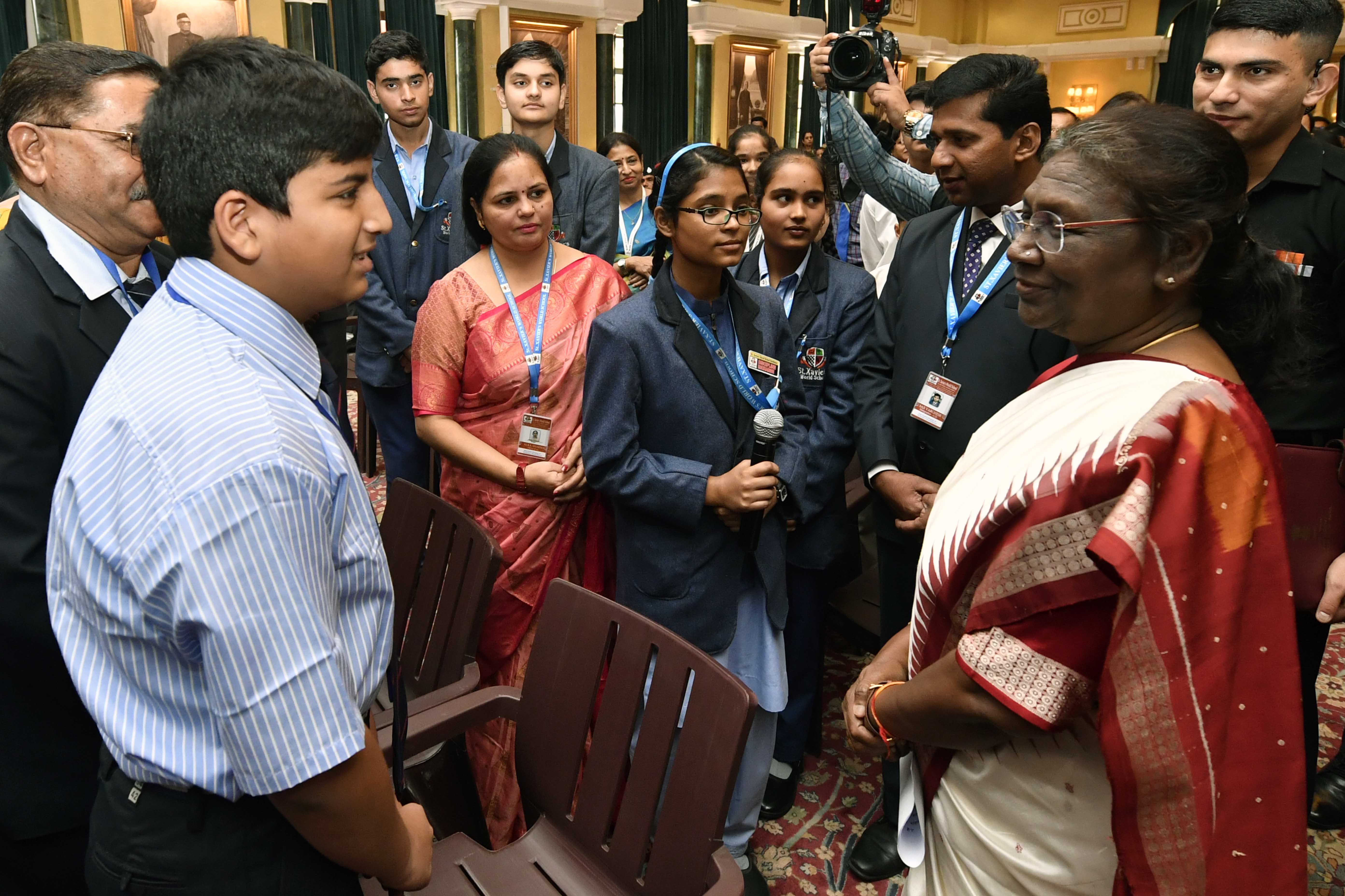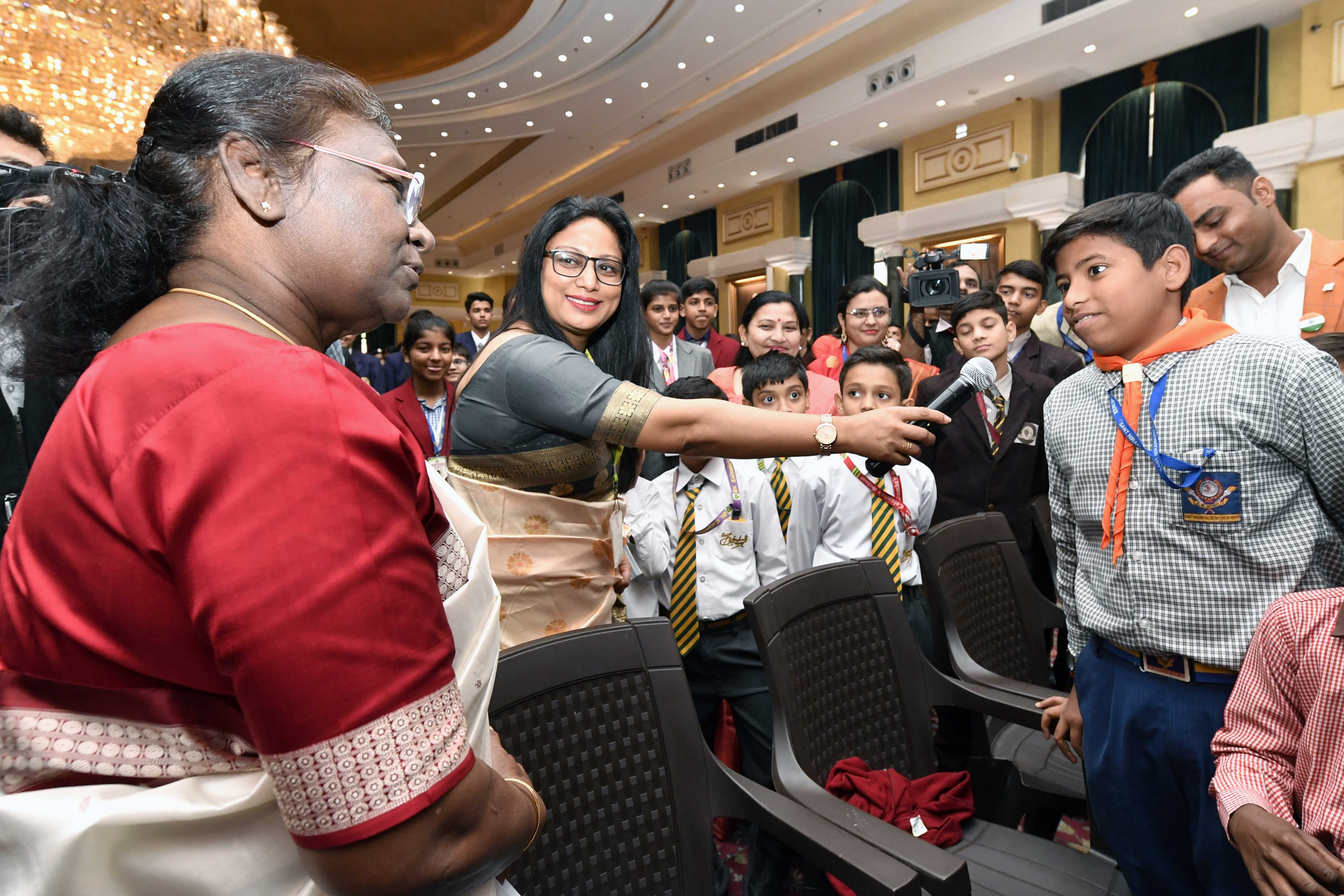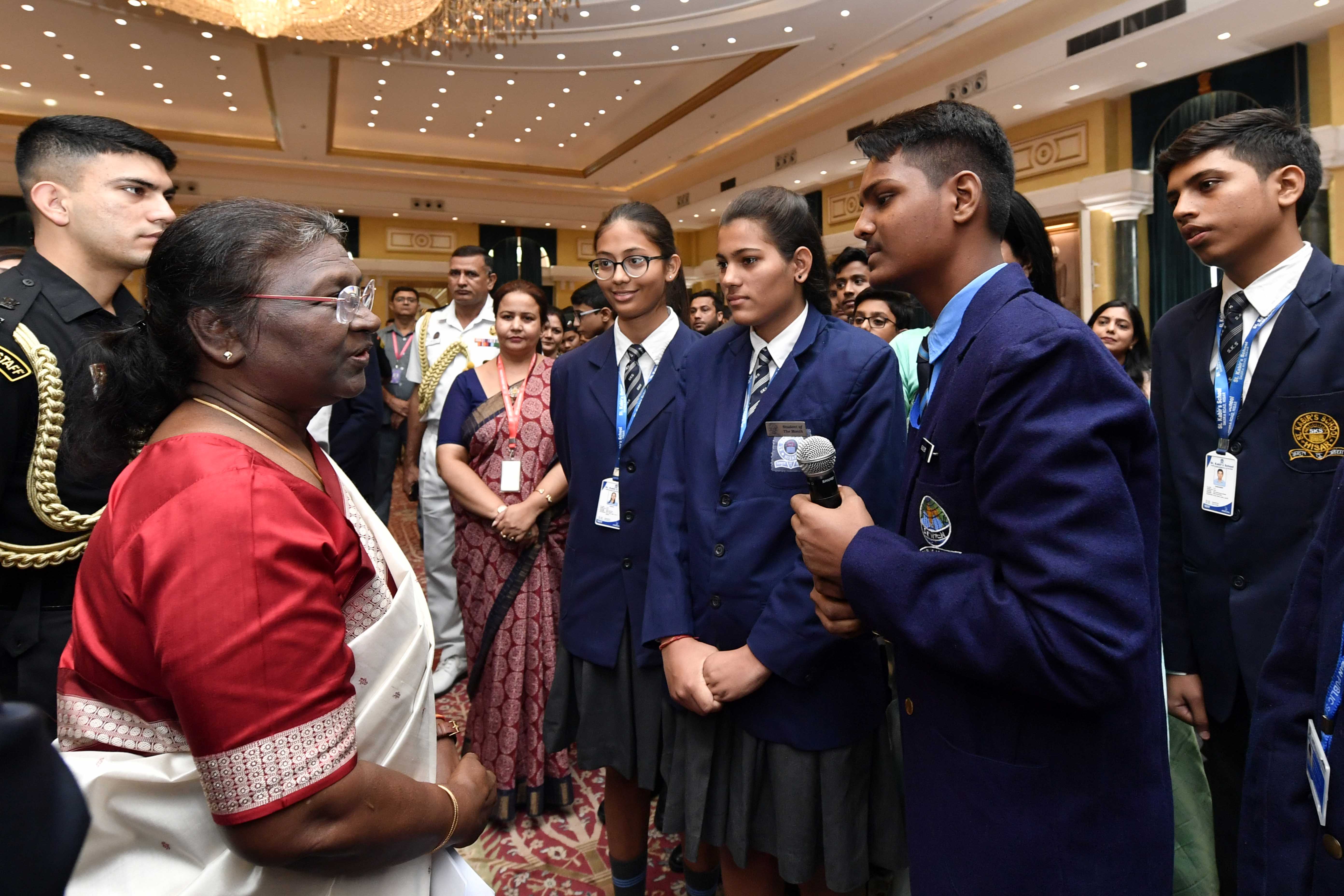 | Caption: | The President of India, Smt. Droupadi Murmu interacting with the students from various schools/organisations at Rashtrapati Bhavan Cultural Centre (RBCC) on November 14, 2022. |