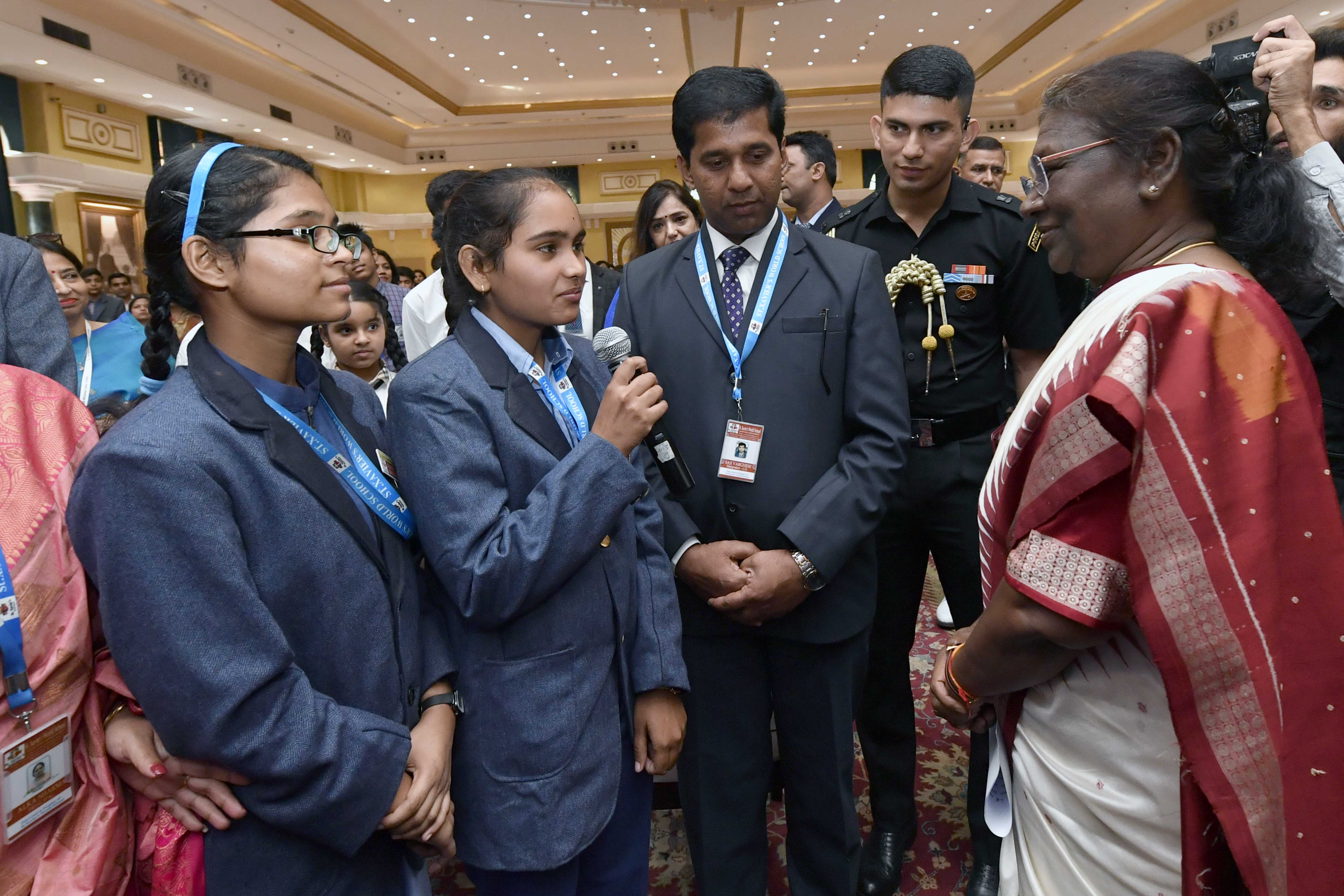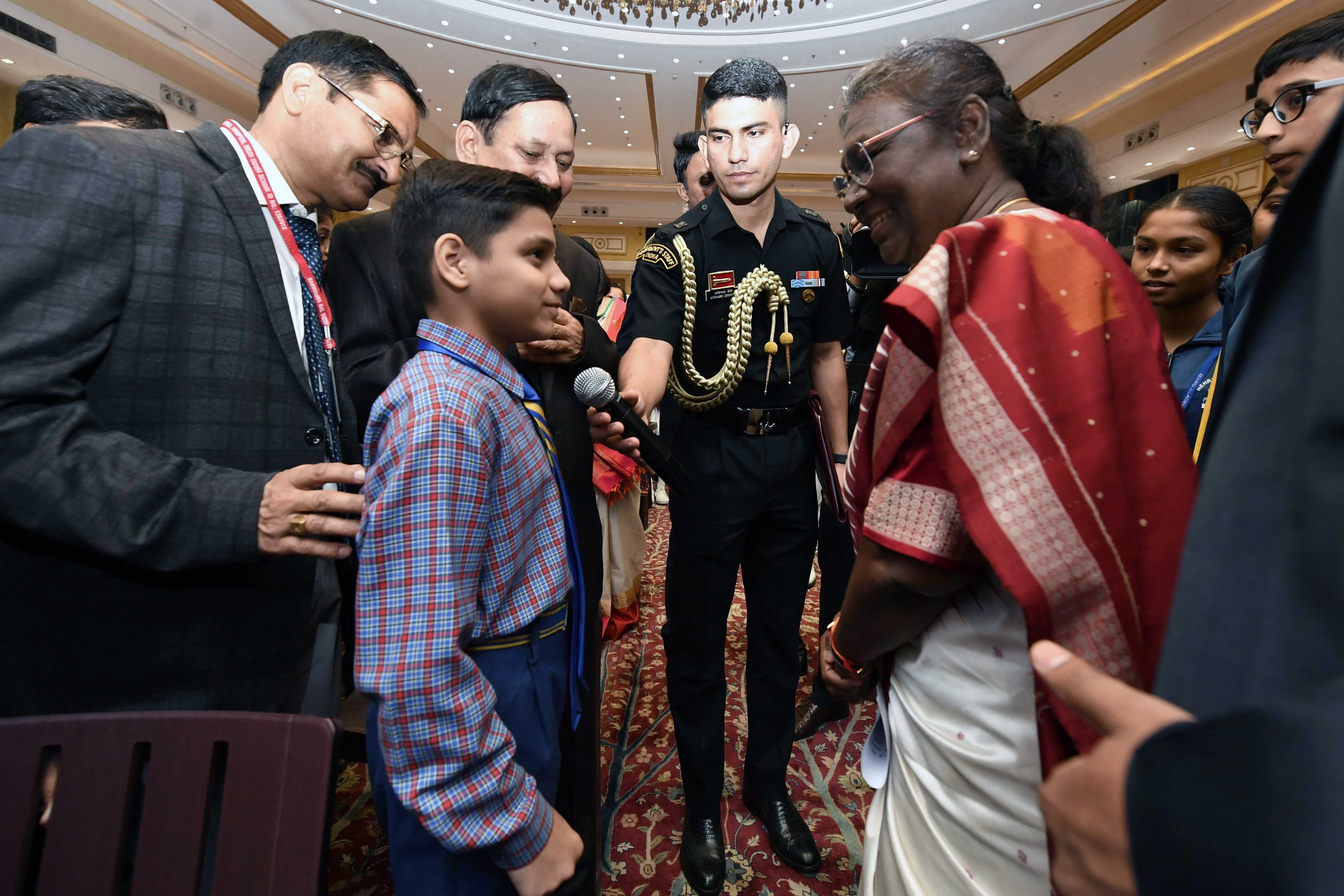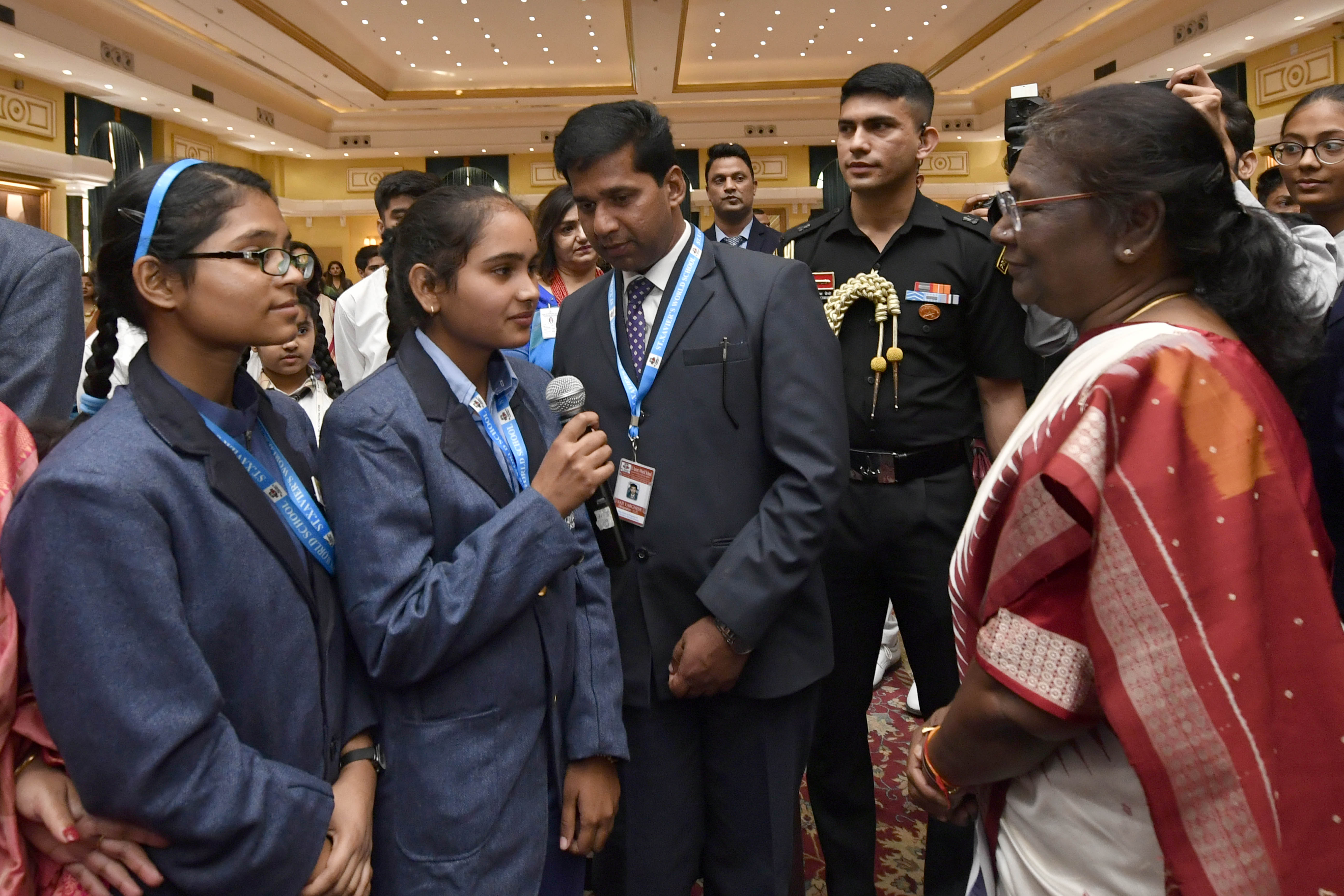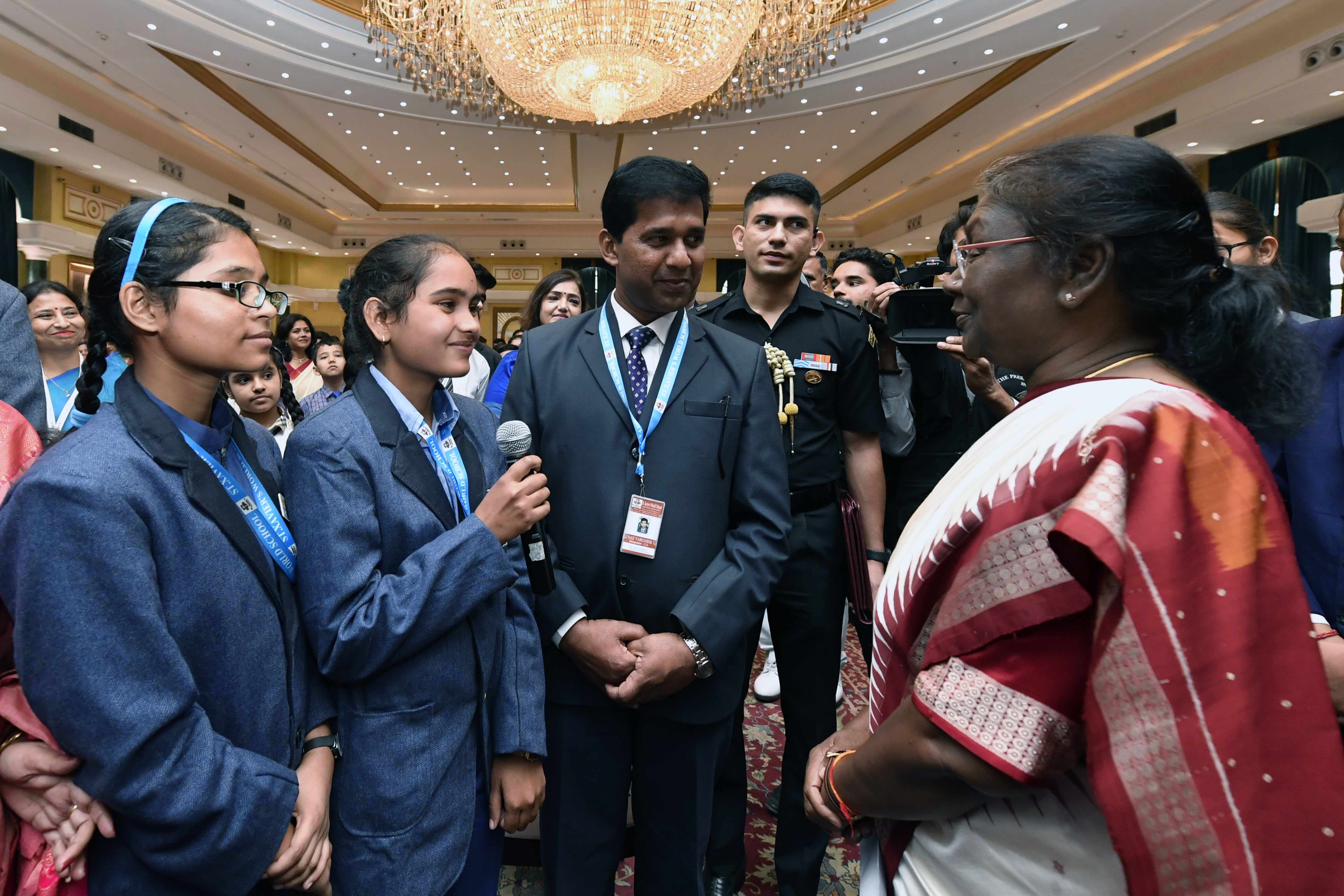 | Caption: | The President of India, Smt. Droupadi Murmu interacting with the students from various schools/organisations at Rashtrapati Bhavan Cultural Centre (RBCC) on November 14, 2022. |
