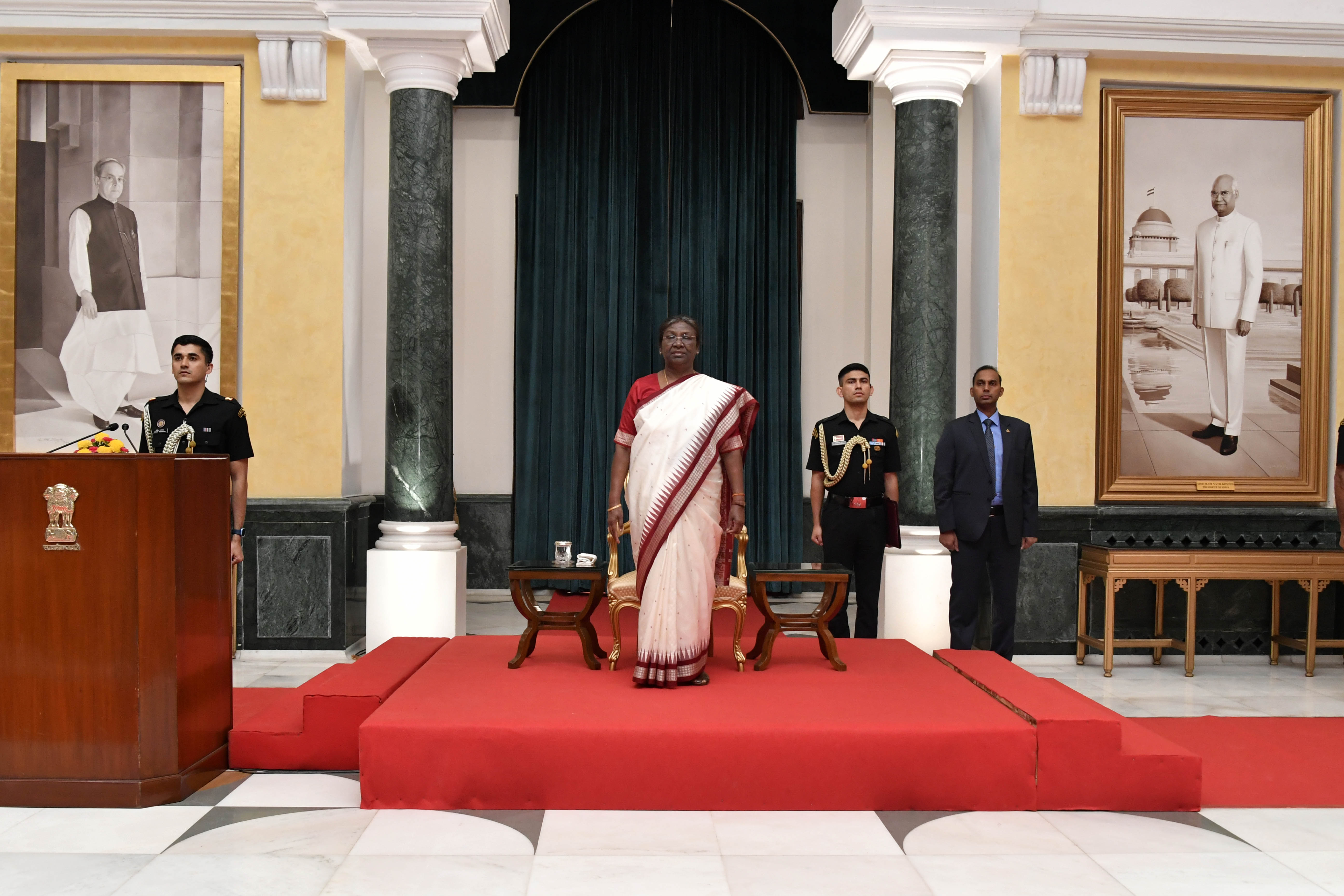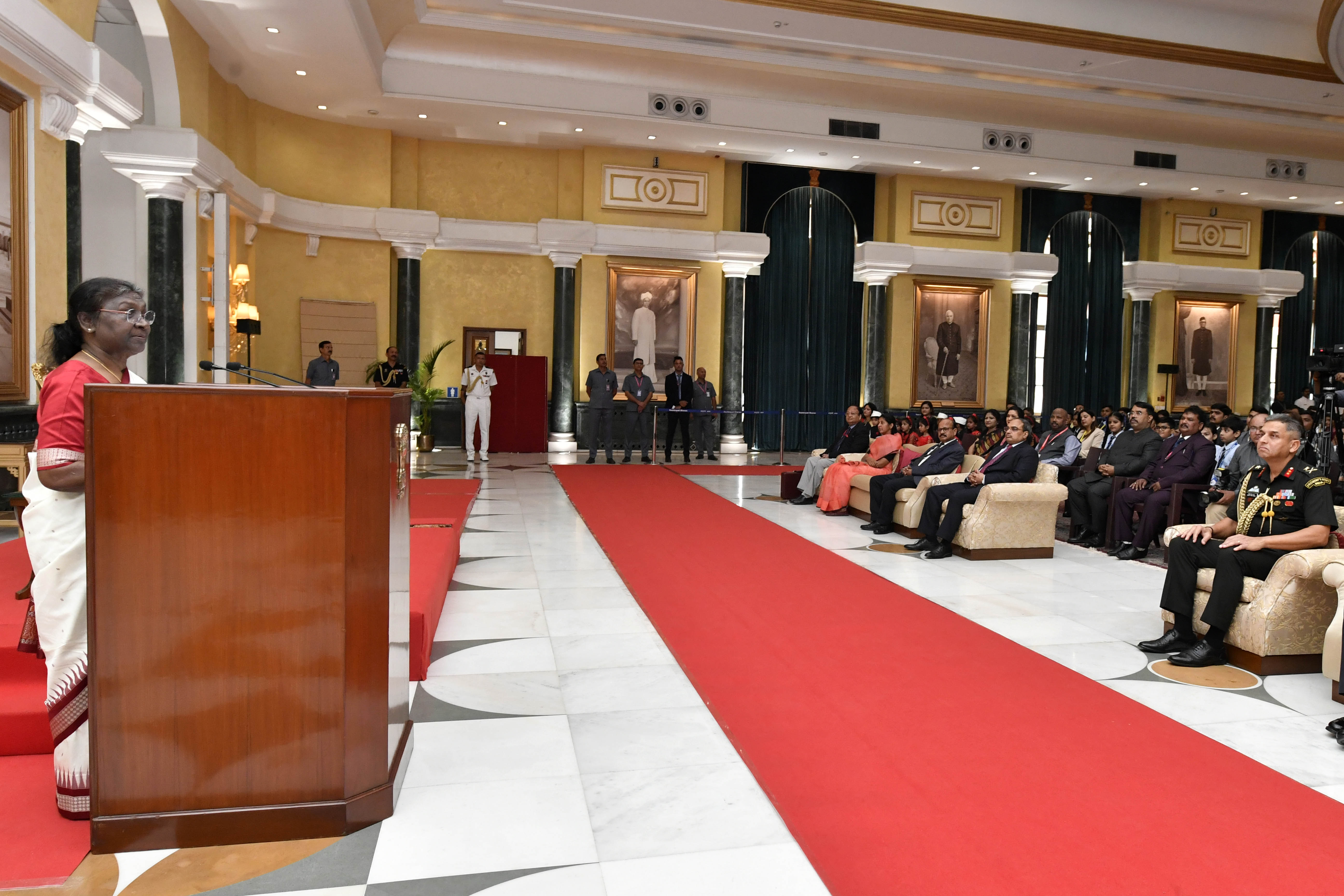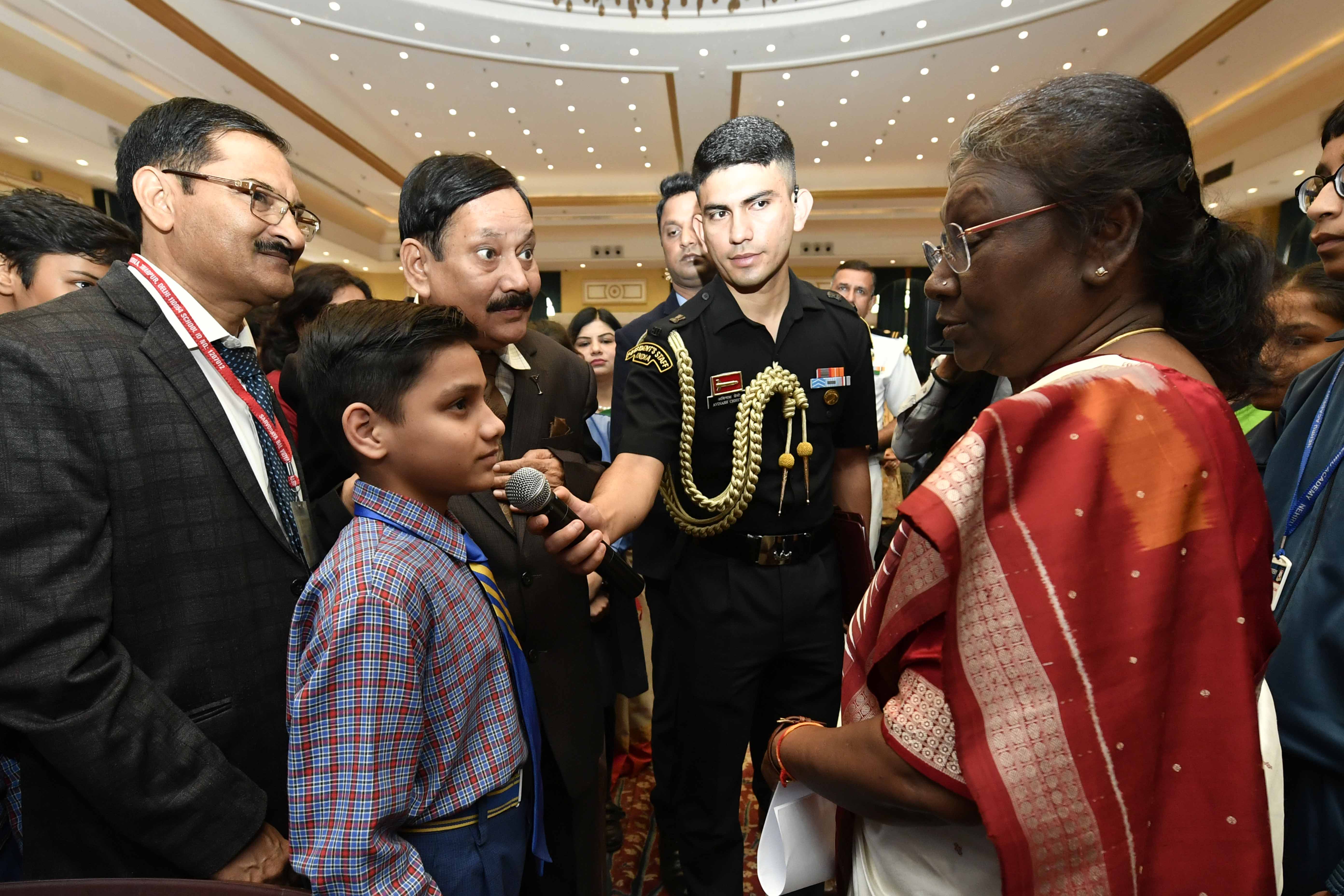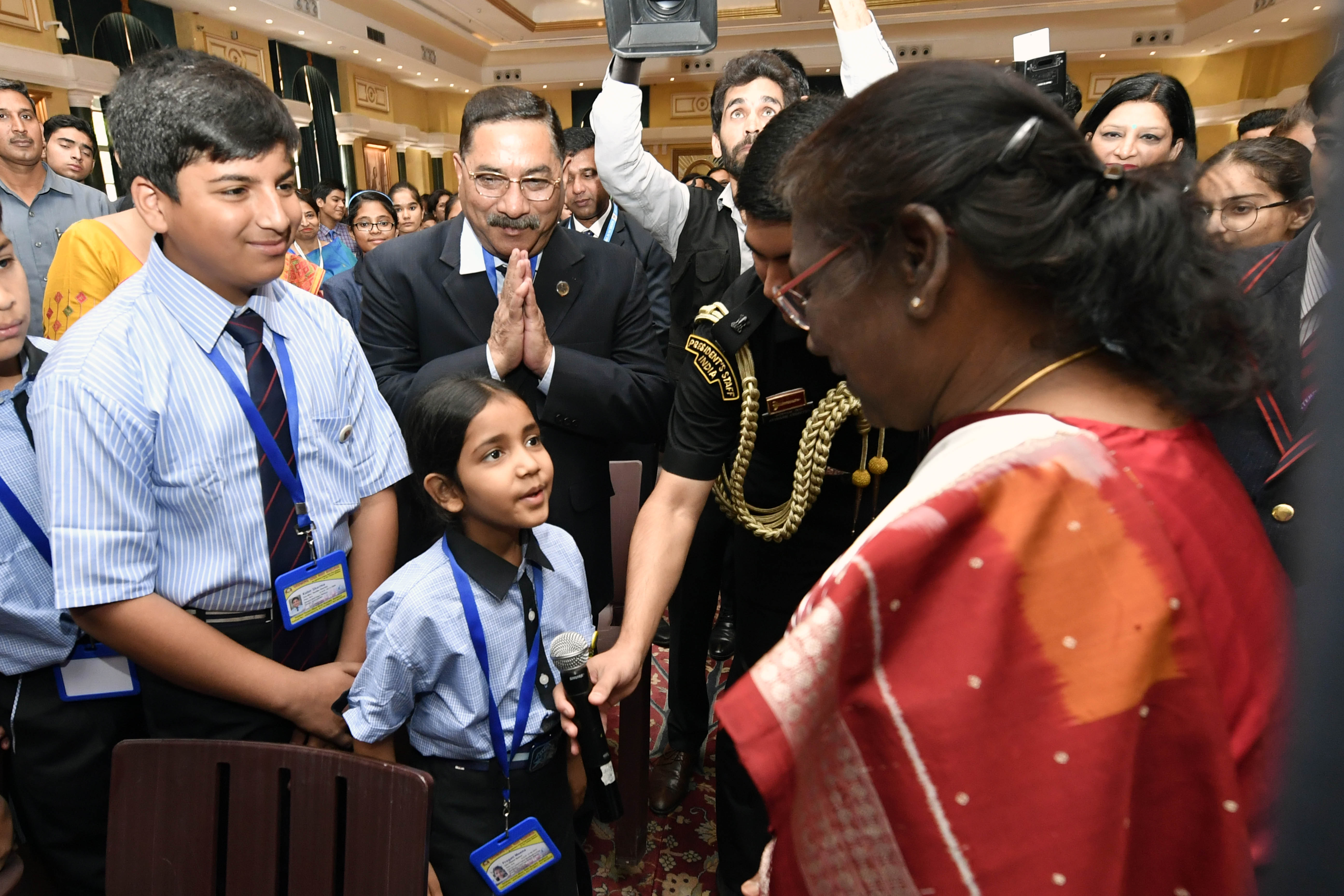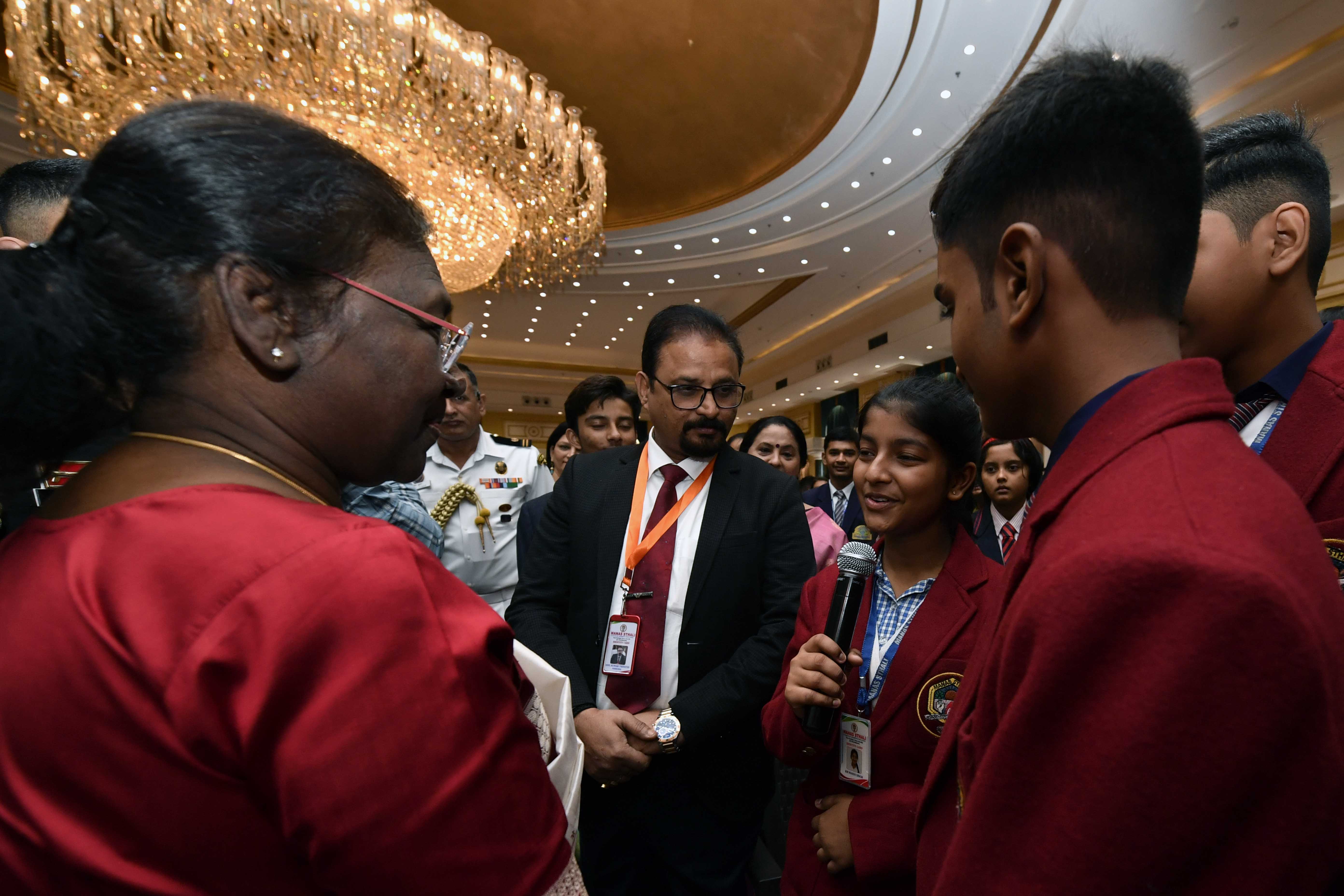 | Caption: | The President of India, Smt. Droupadi Murmu interacting with the students from various schools/organisations at Rashtrapati Bhavan Cultural Centre (RBCC) on November 14, 2022. |