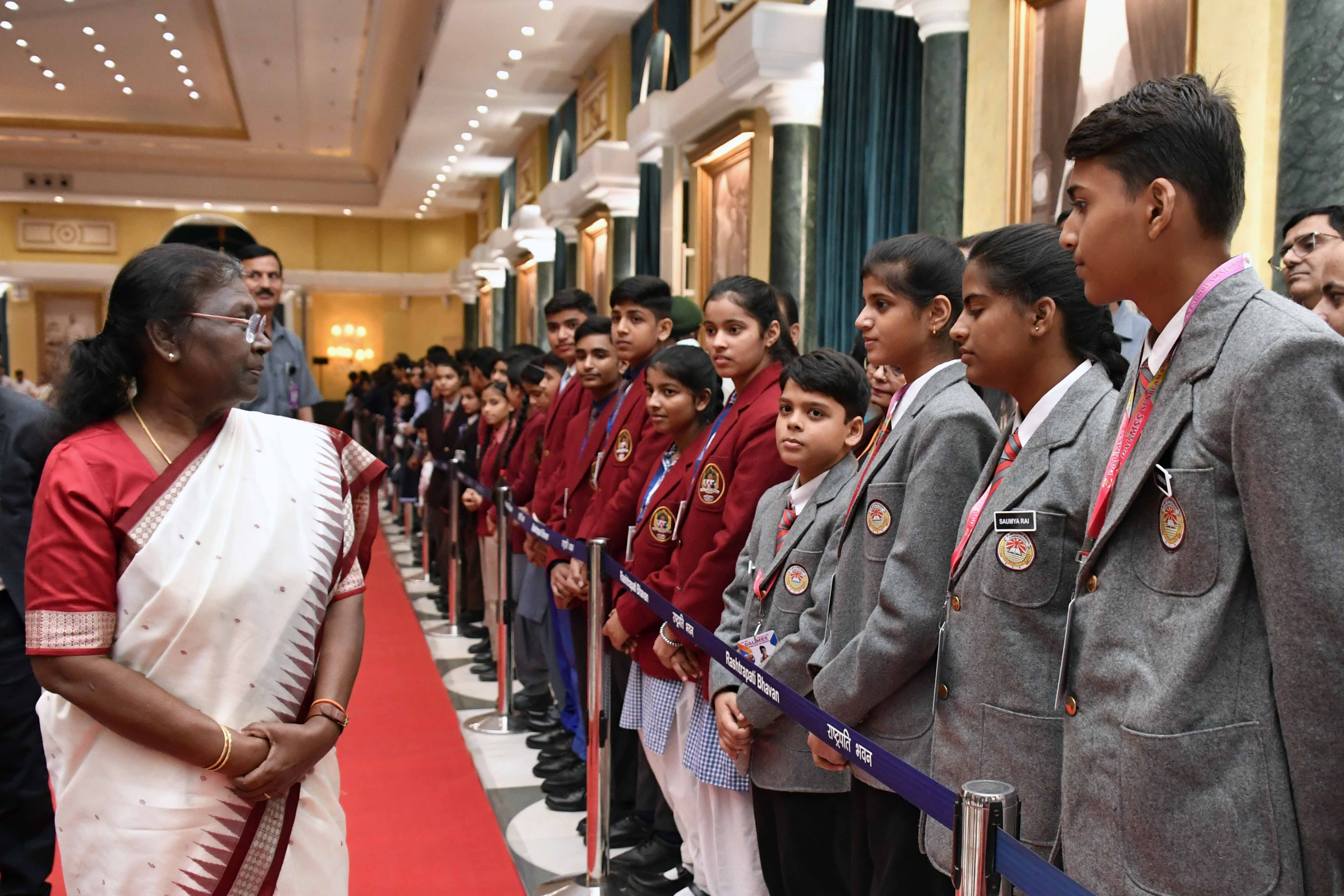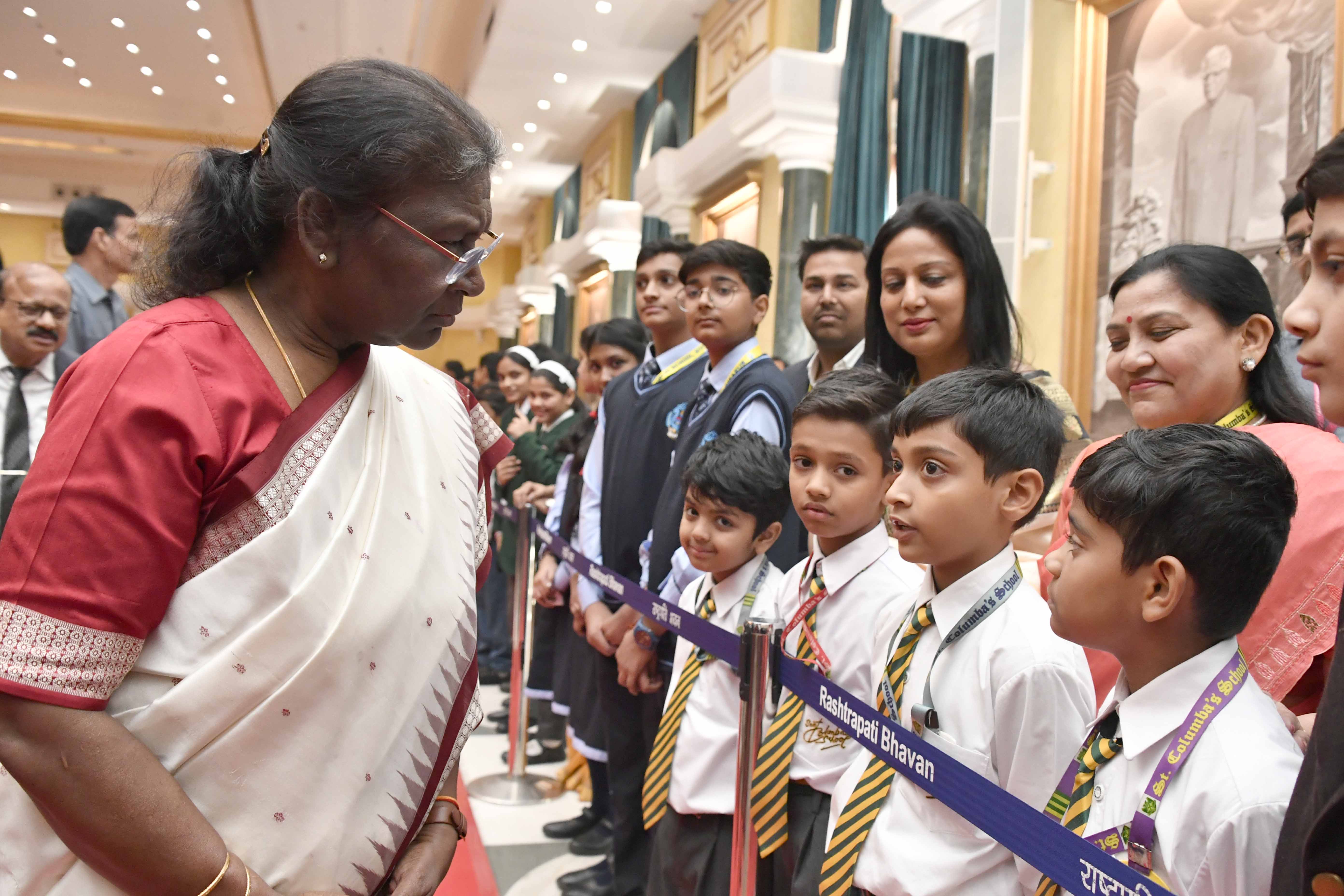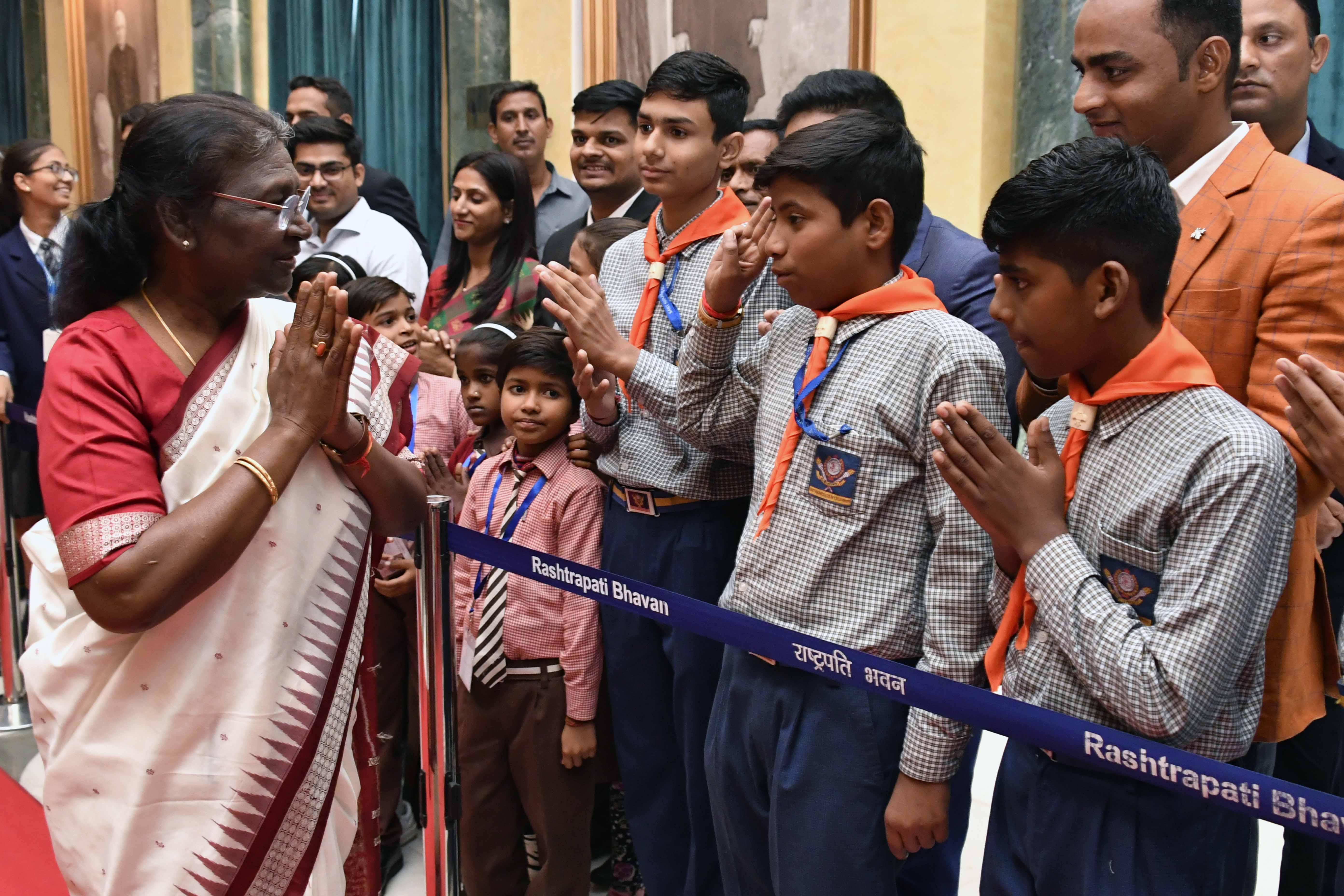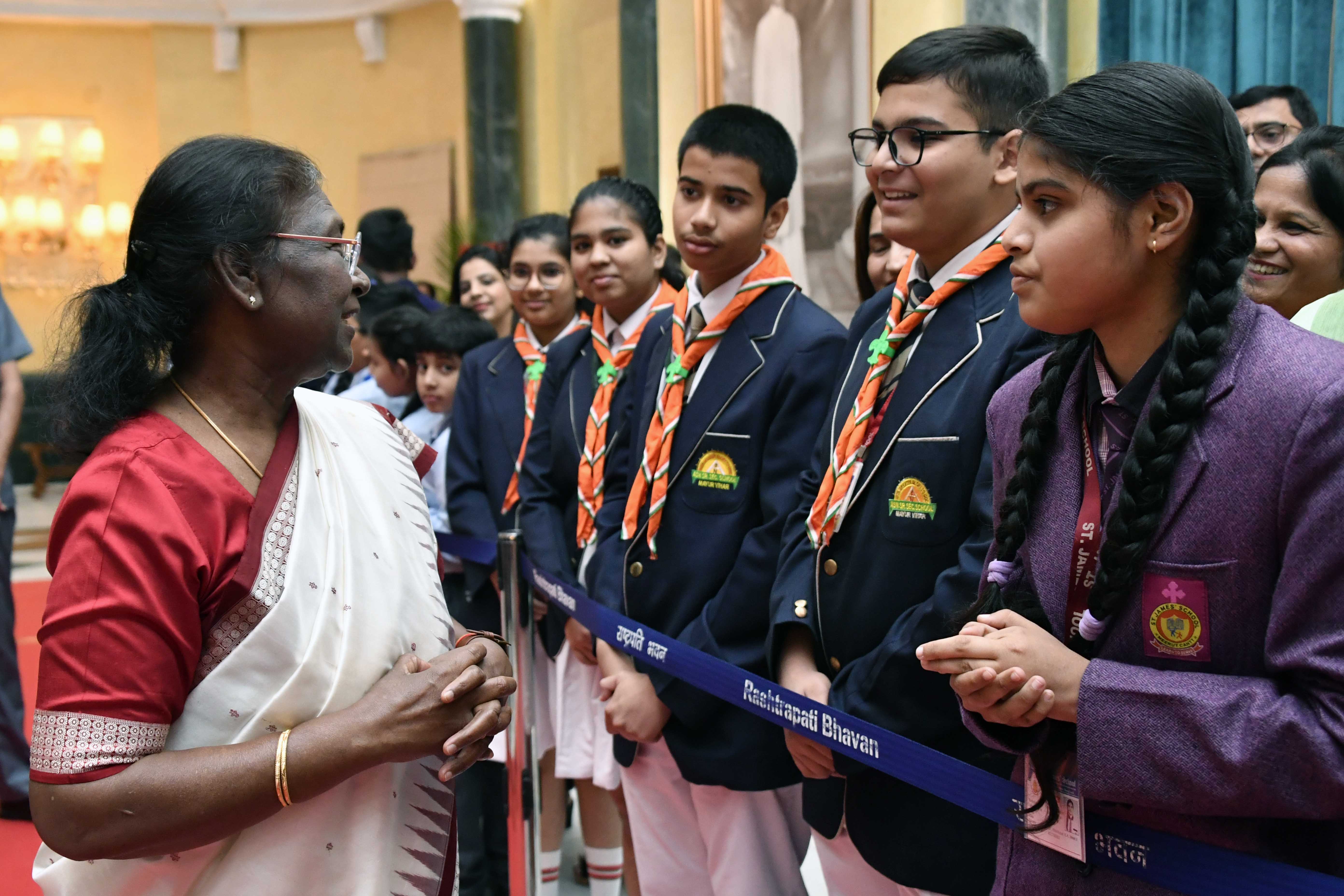 | Caption: | The President of India, Smt. Droupadi Murmu interacting with the students from various schools/organisations at Rashtrapati Bhavan Cultural Centre (RBCC) on November 14, 2022. |