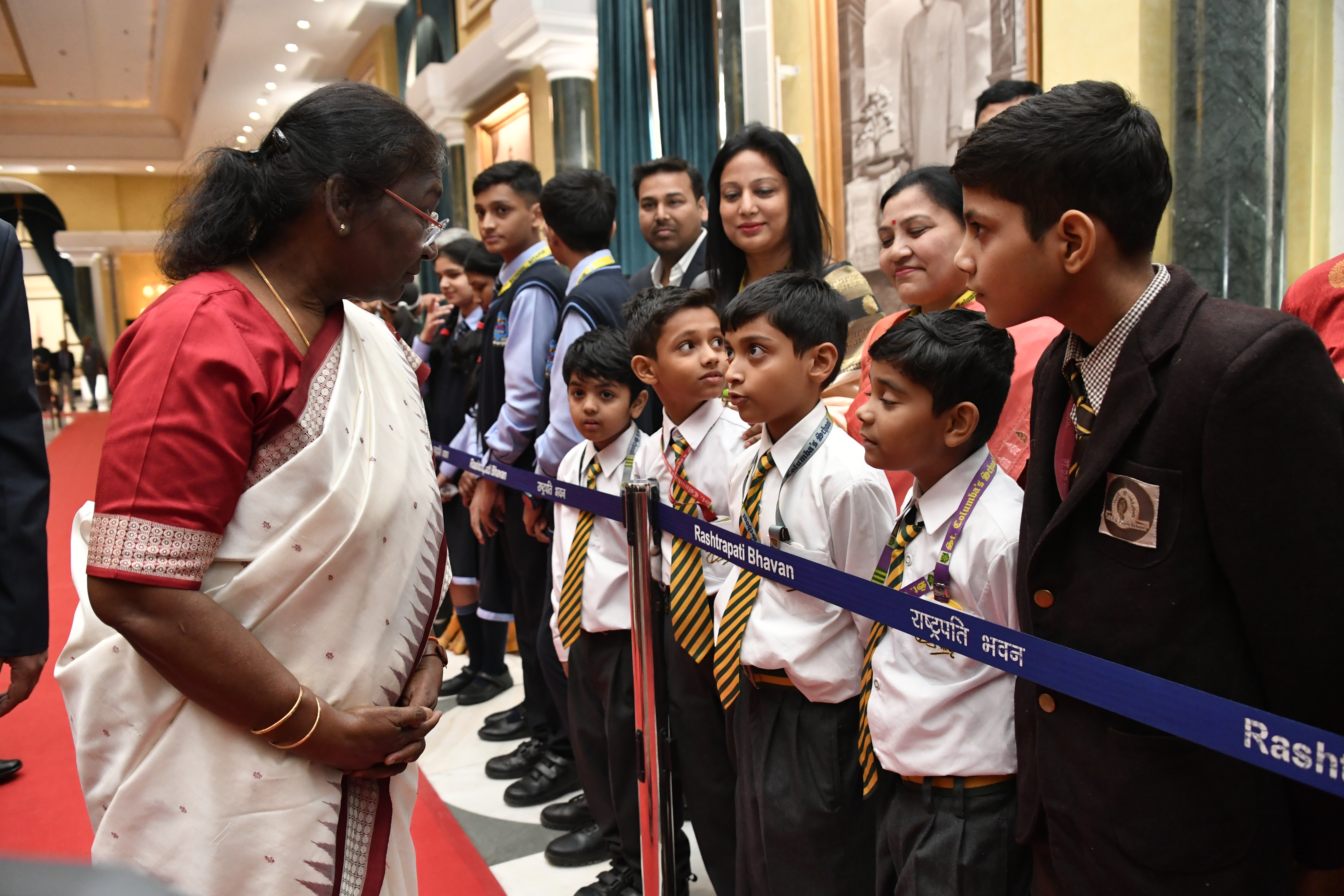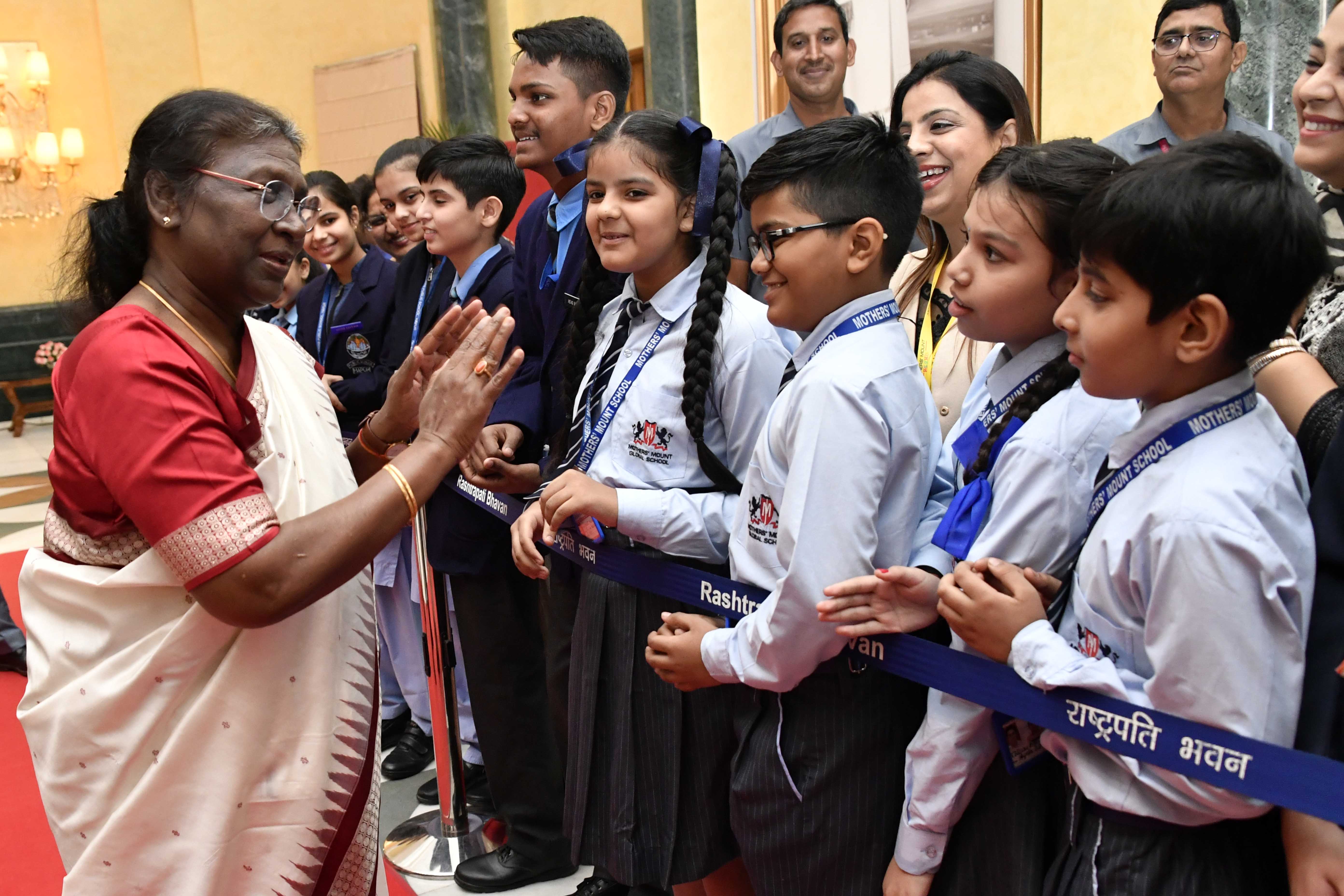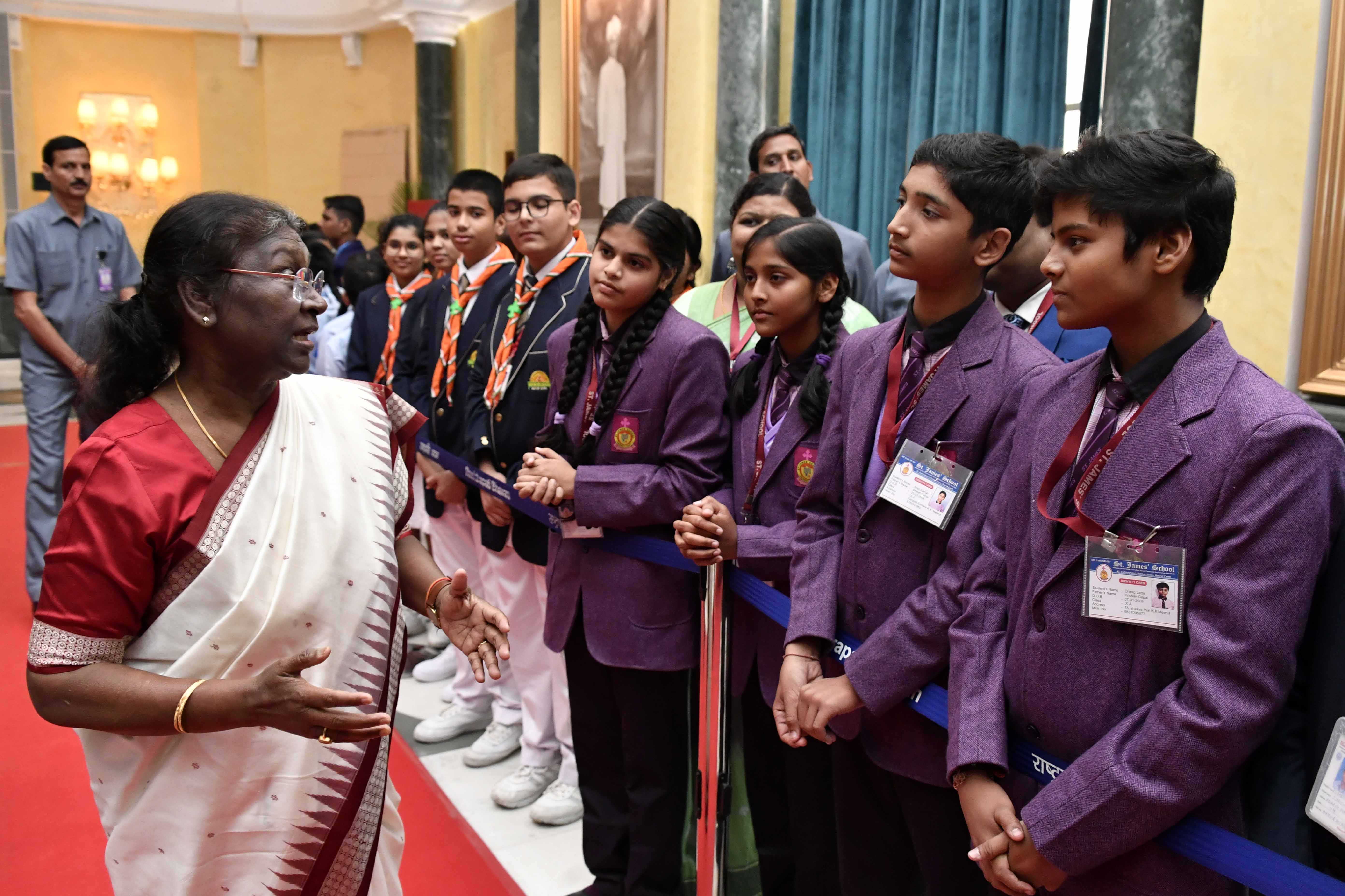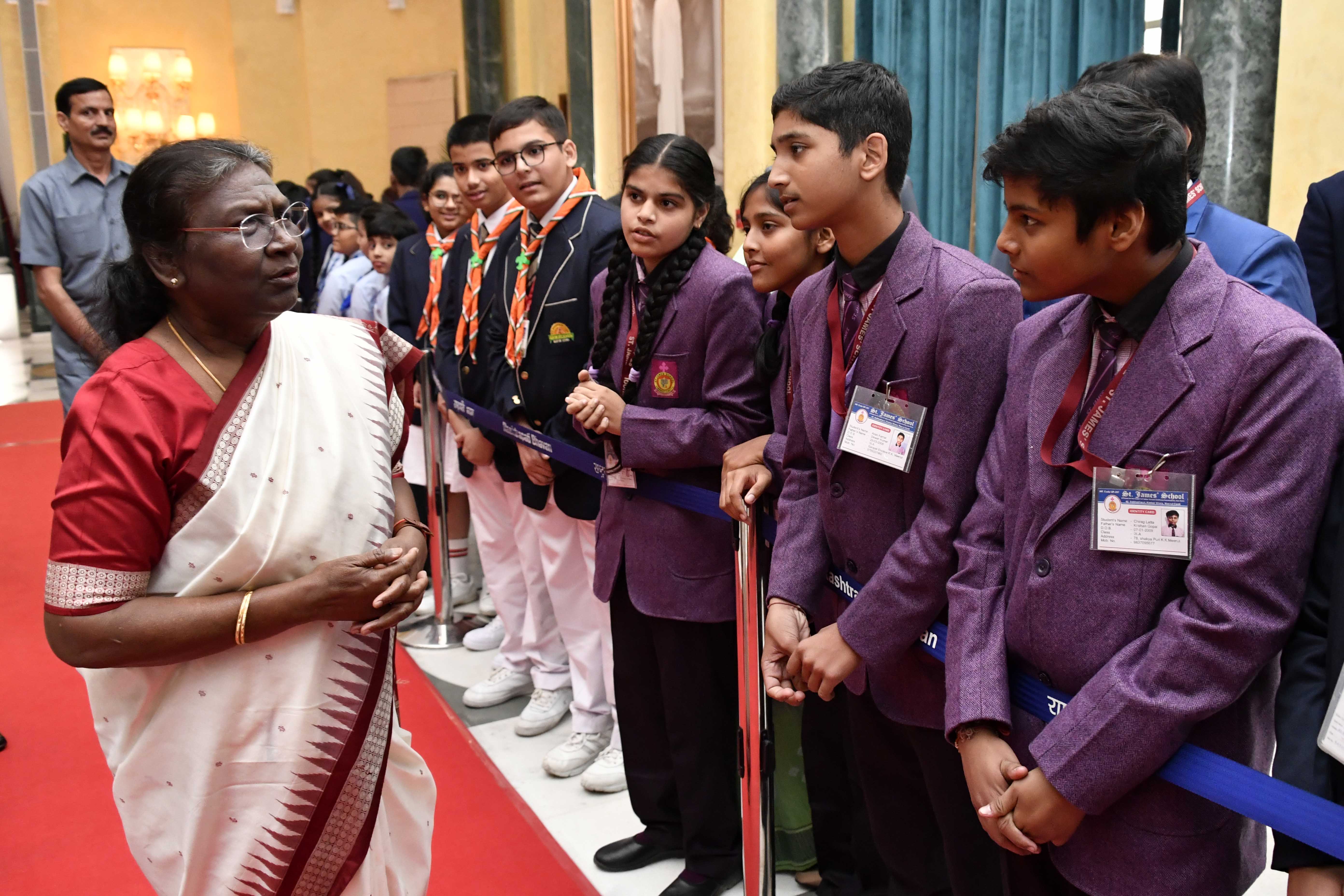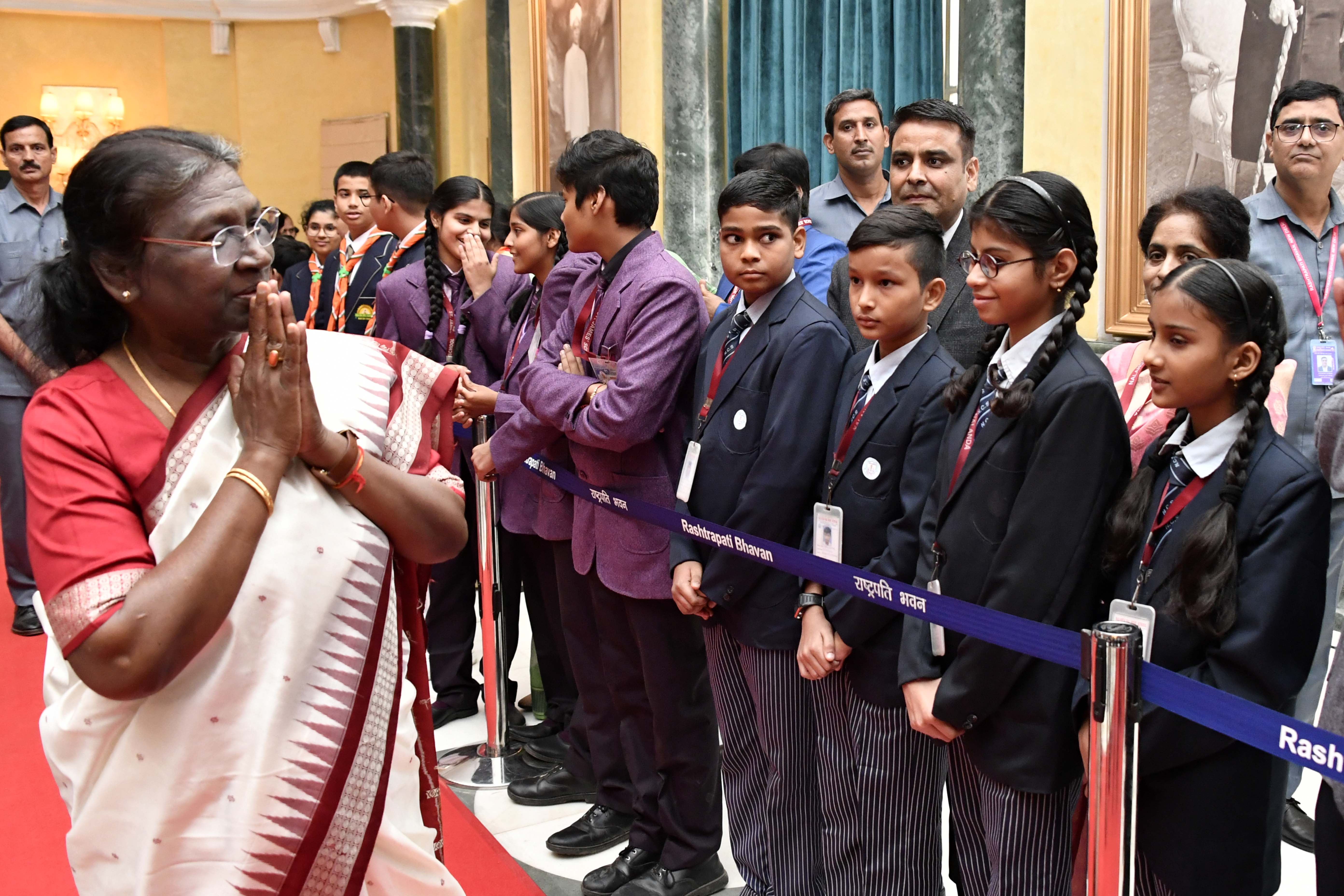 | Caption: | The President of India, Smt. Droupadi Murmu interacting with the students from various schools/organisations at Rashtrapati Bhavan Cultural Centre (RBCC) on November 14, 2022. |