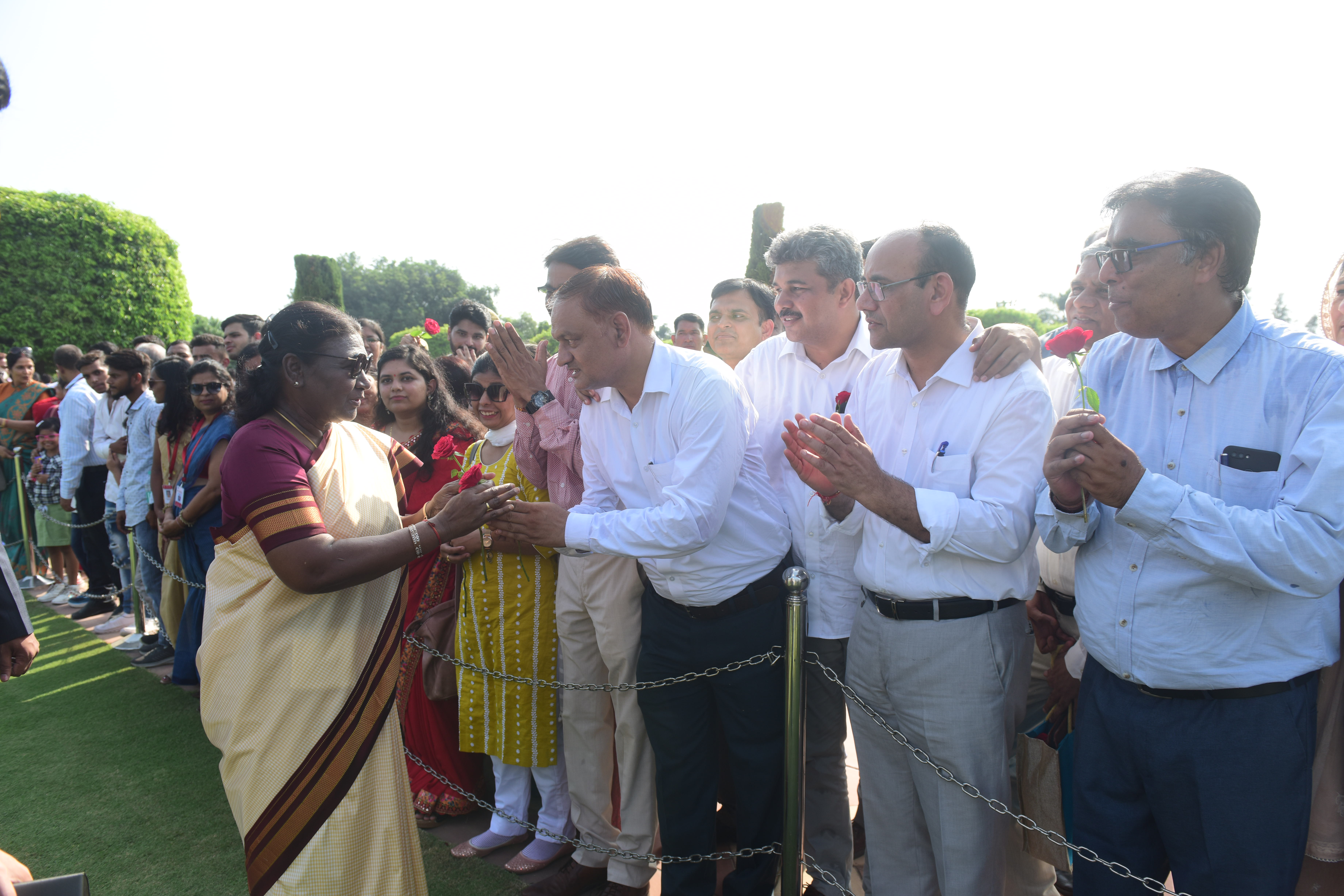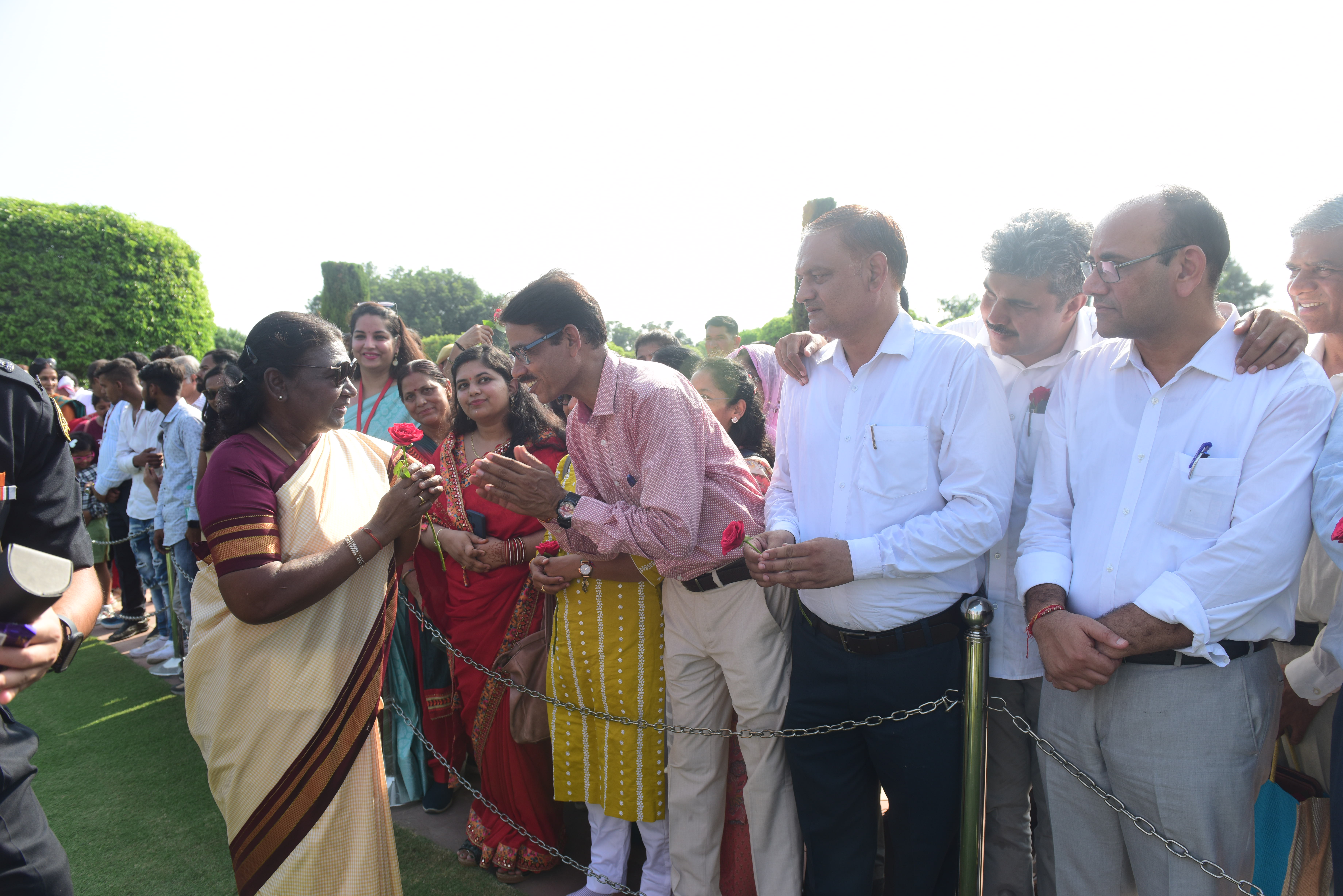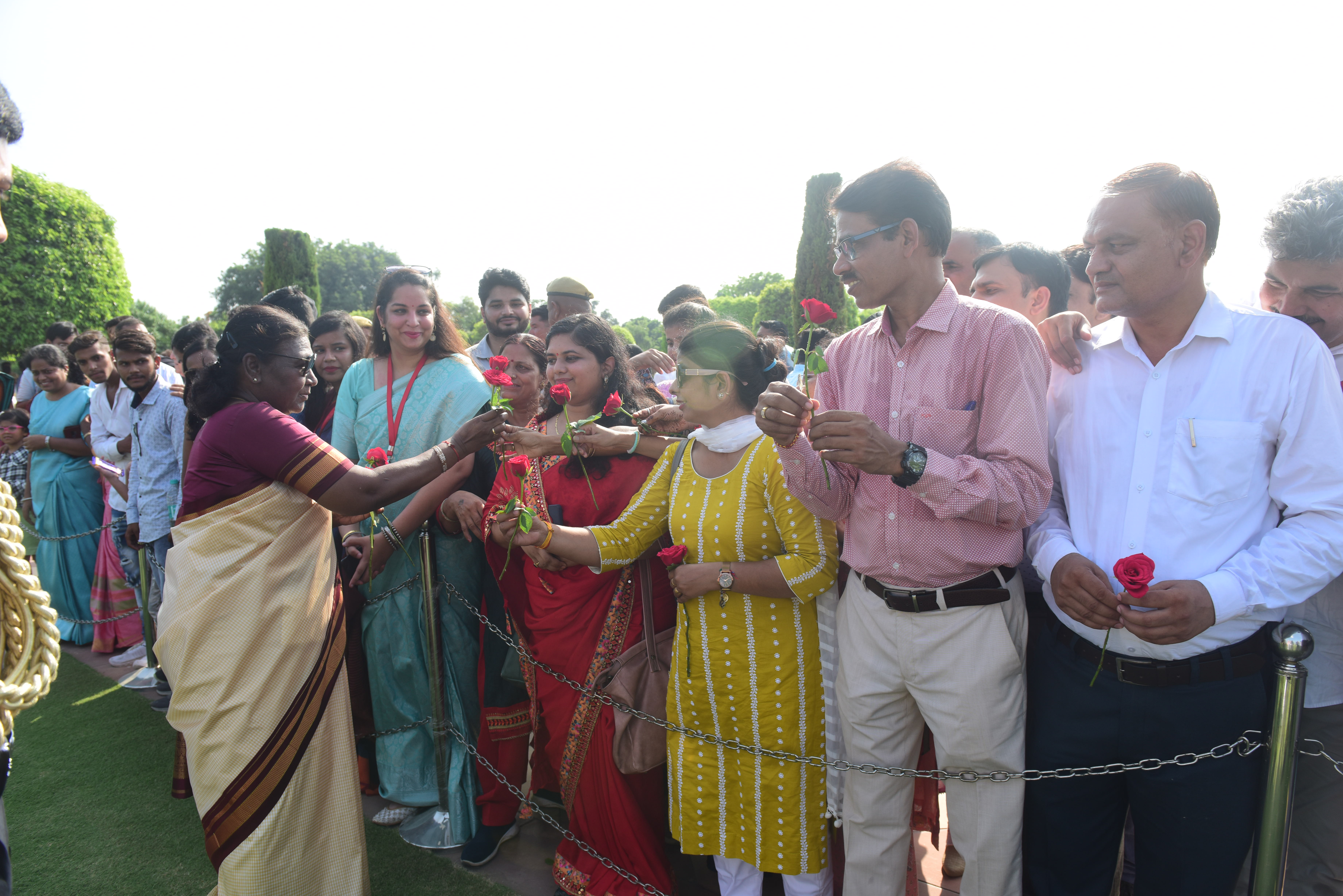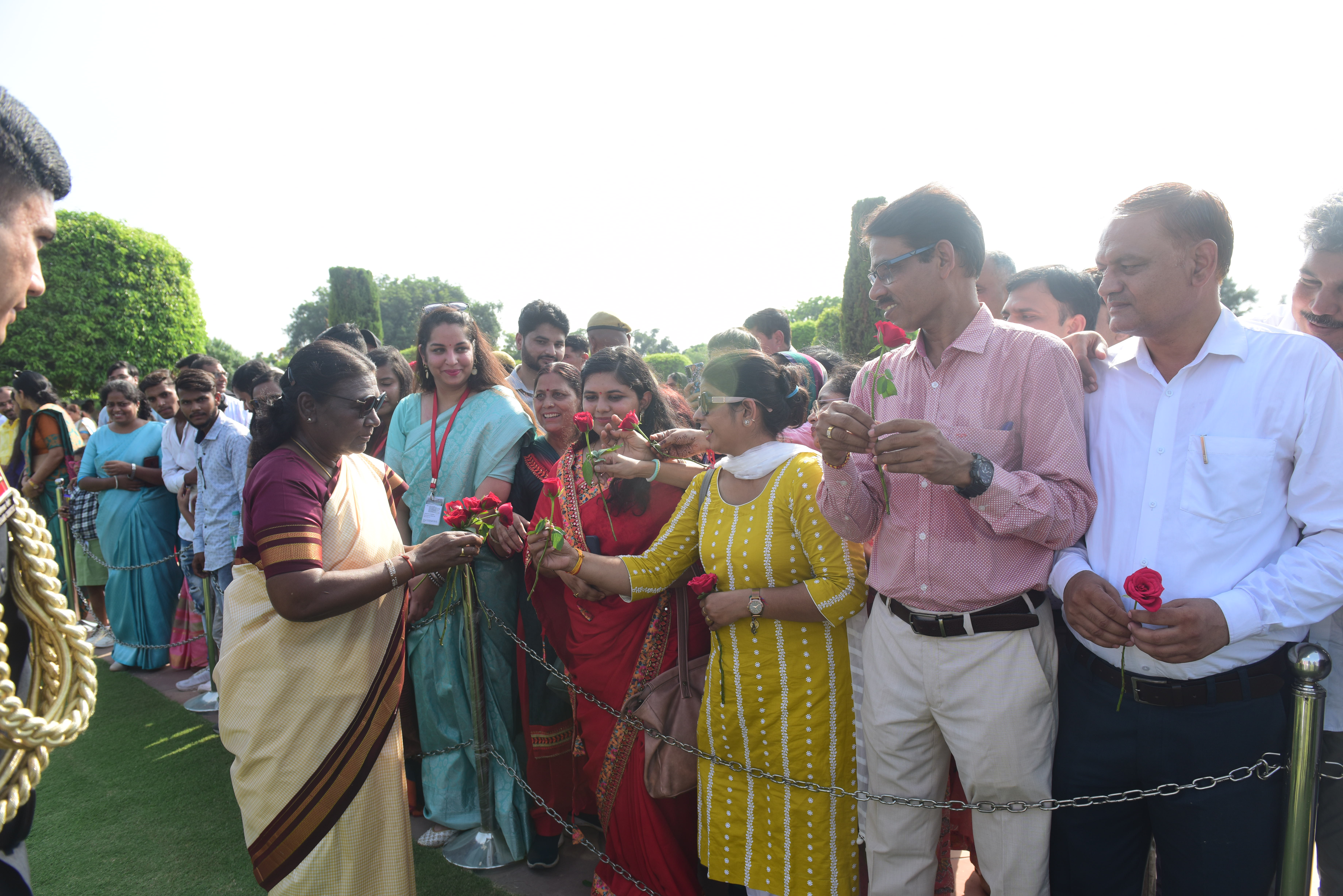 | Caption: | The President of India, Smt. Droupadi Murmu Interaction with the teachers invited to visit the Amrit Udyan as special invitees at Rashtrapati Bhavan on September 5, 2023. |