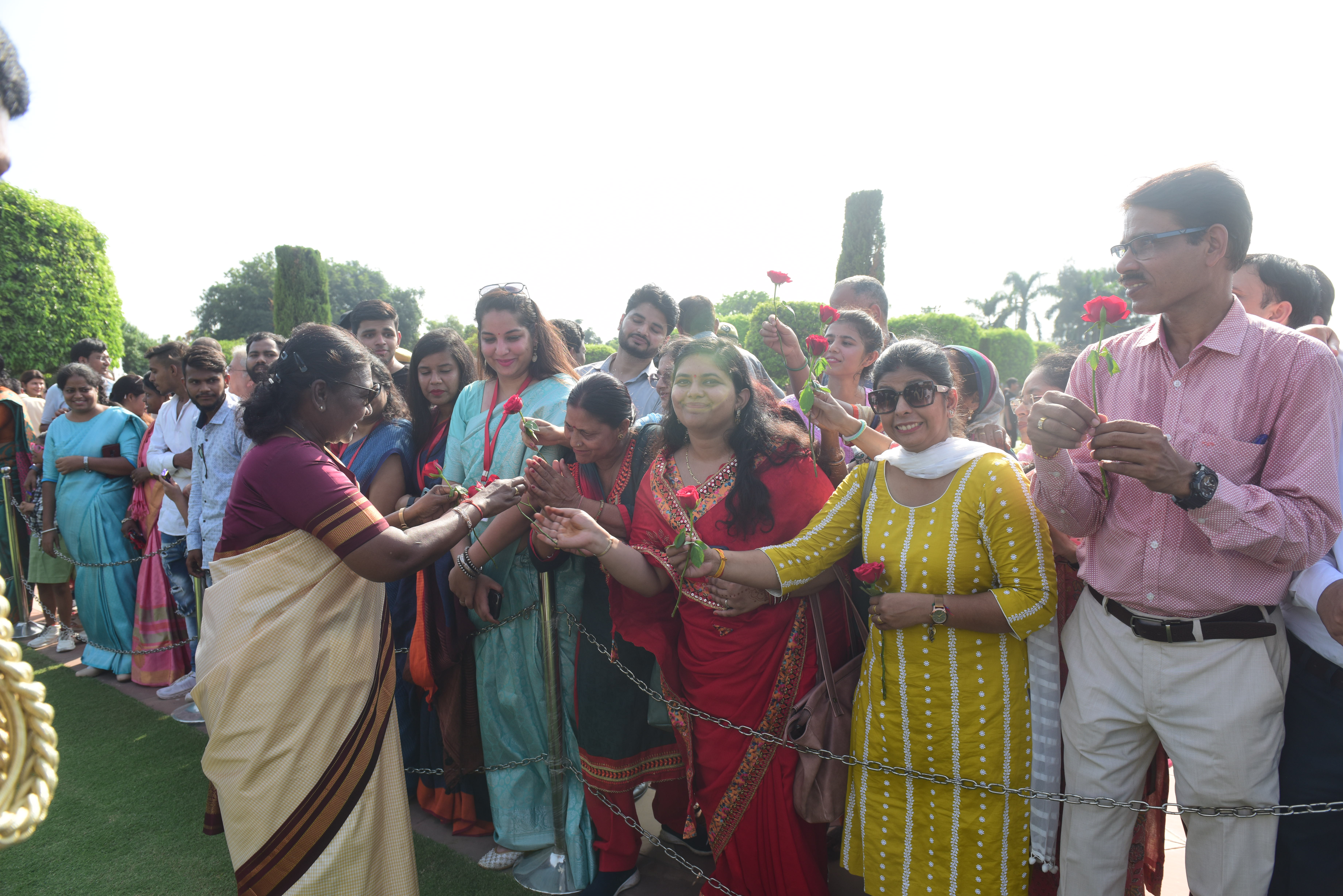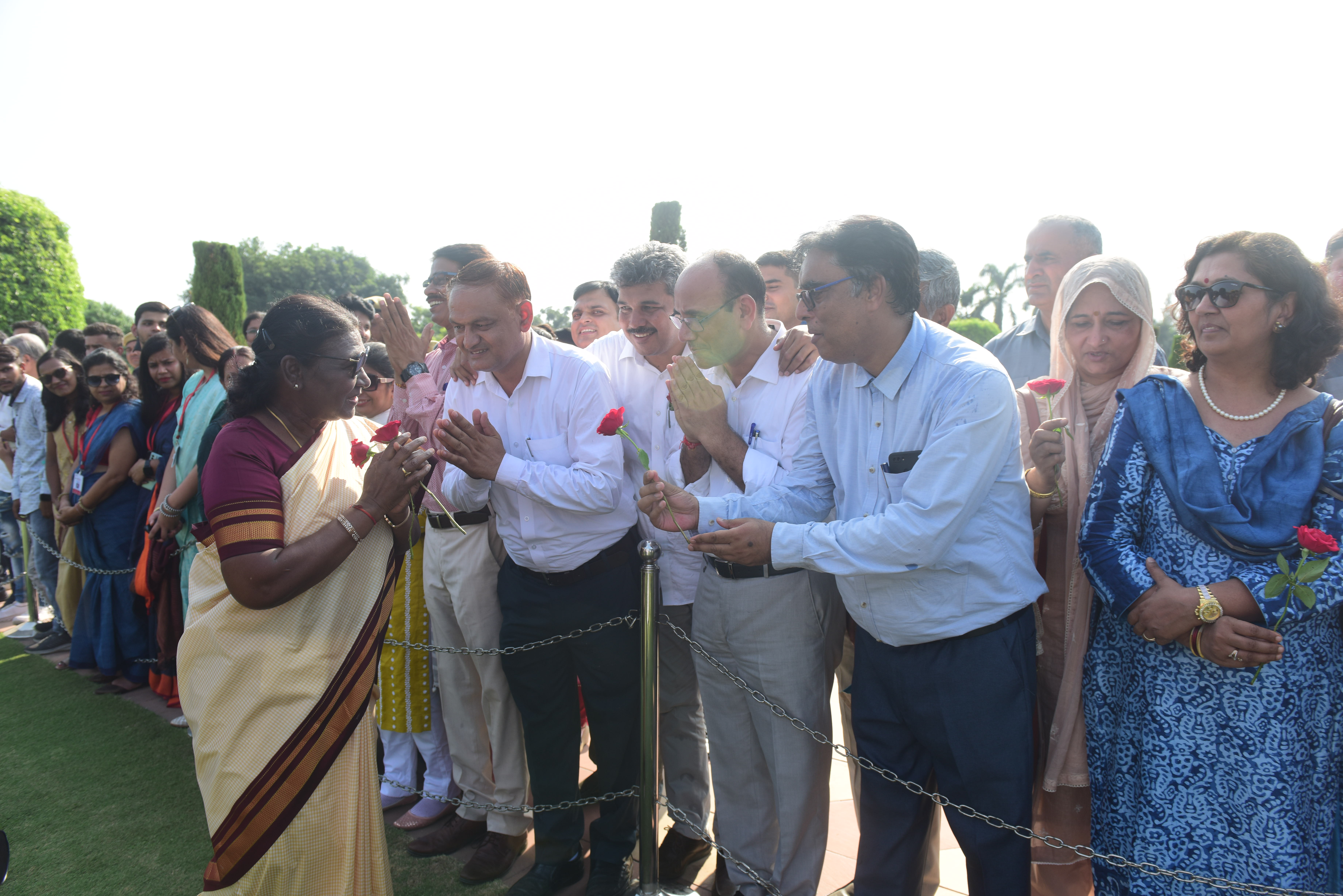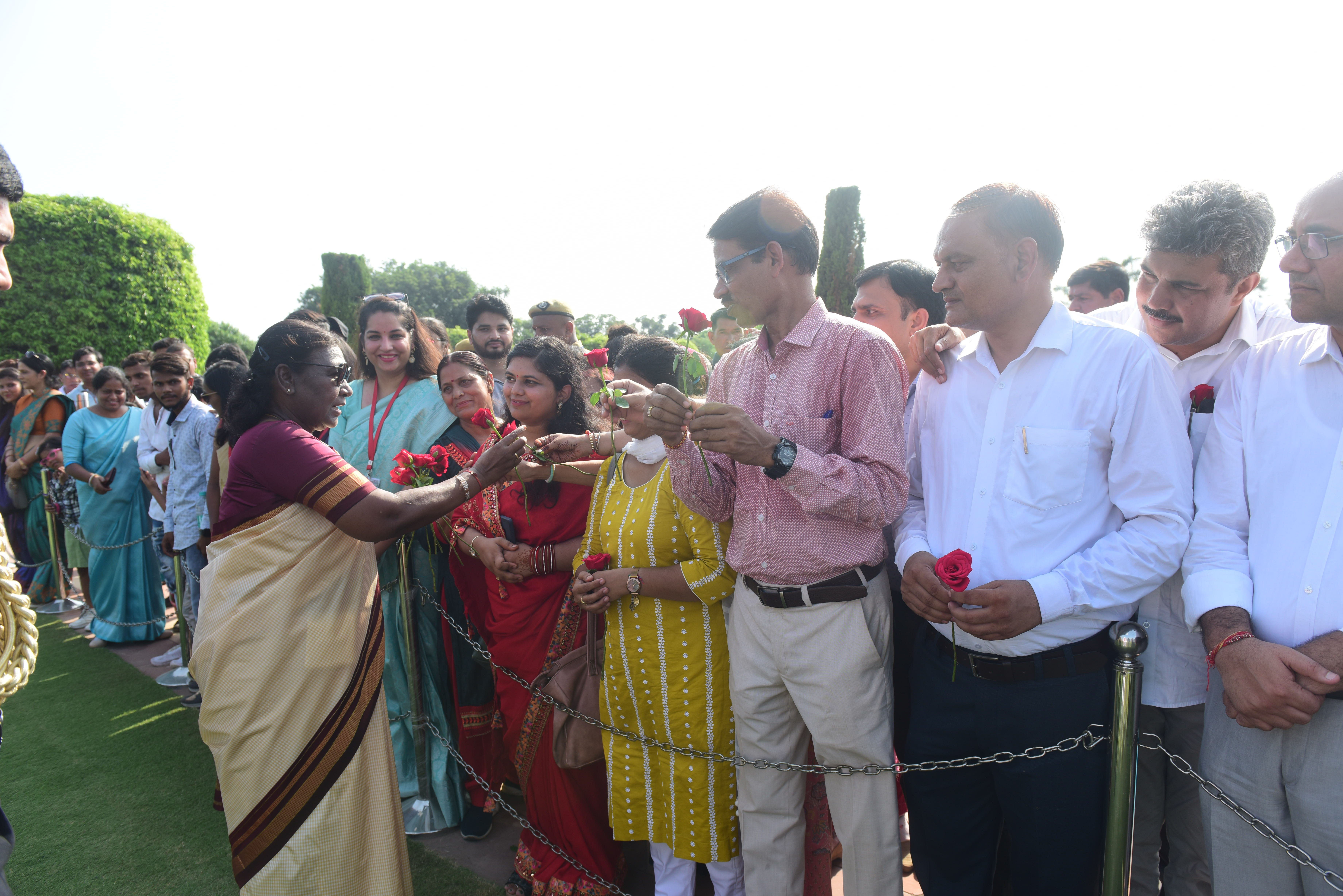 | Caption: | The President of India, Smt. Droupadi Murmu Interaction with the teachers invited to visit the Amrit Udyan as special invitees at Rashtrapati Bhavan on September 5, 2023. |