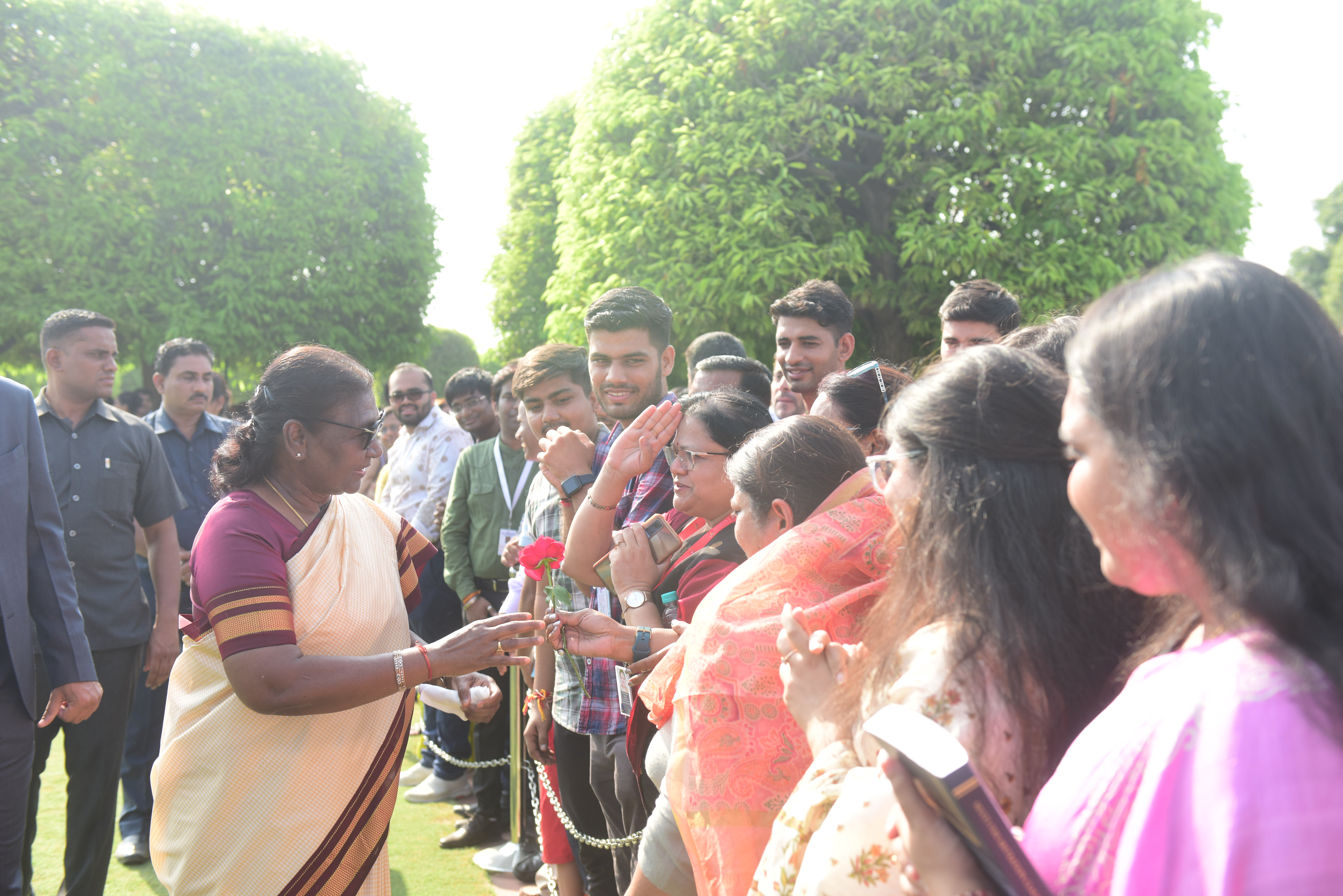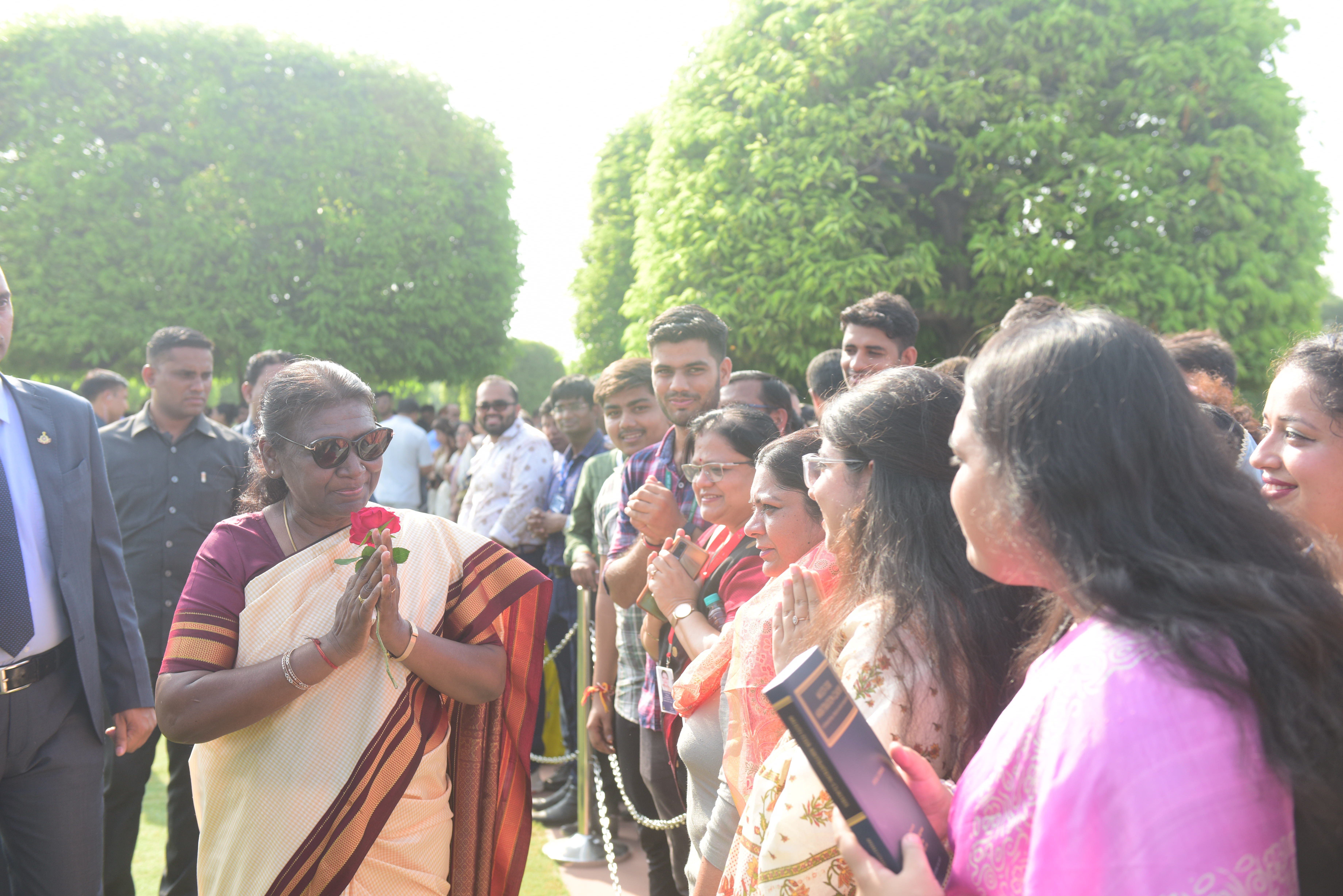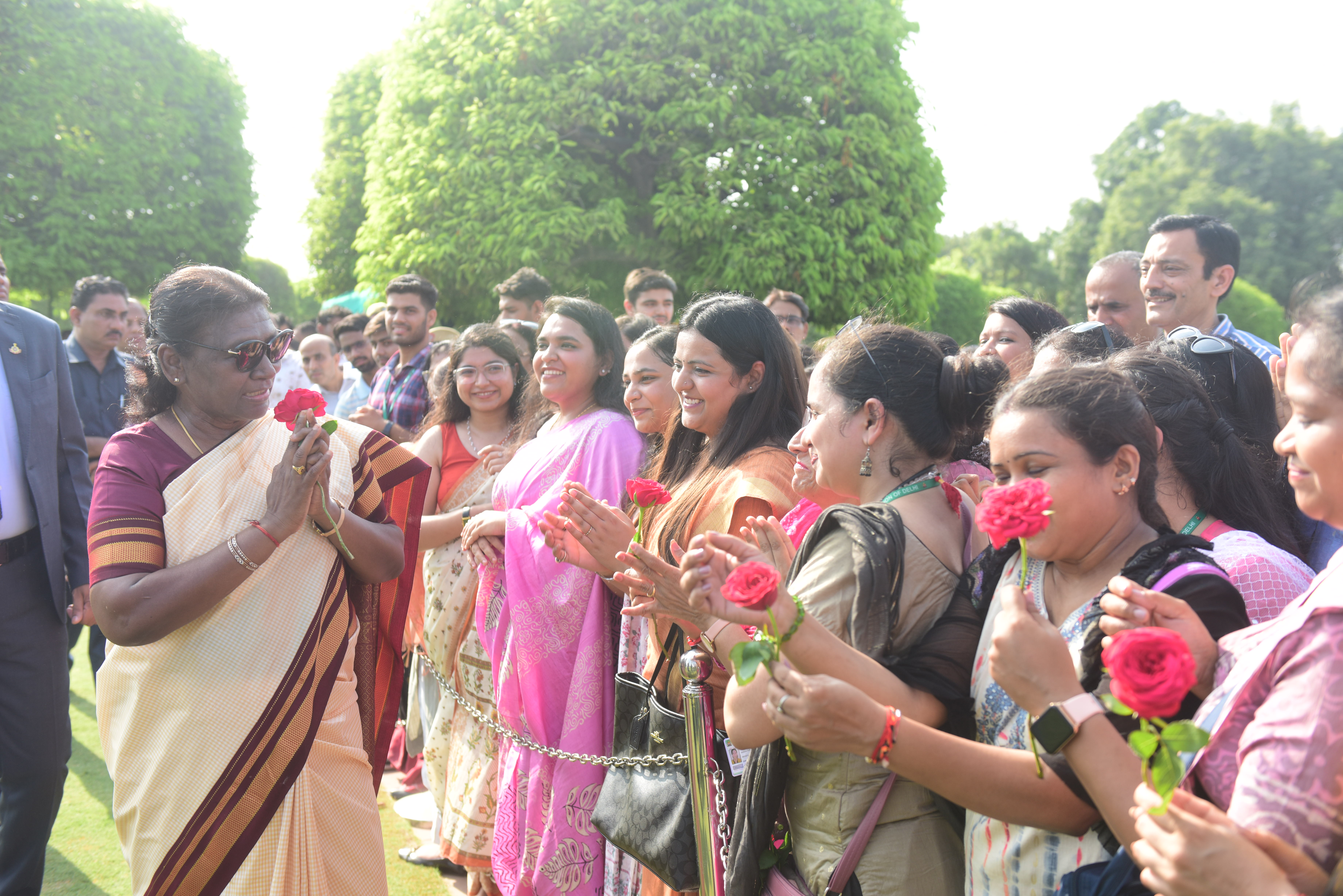 | Caption: | The President of India, Smt. Droupadi Murmu Interaction with the teachers invited to visit the Amrit Udyan as special invitees at Rashtrapati Bhavan on September 5, 2023. |