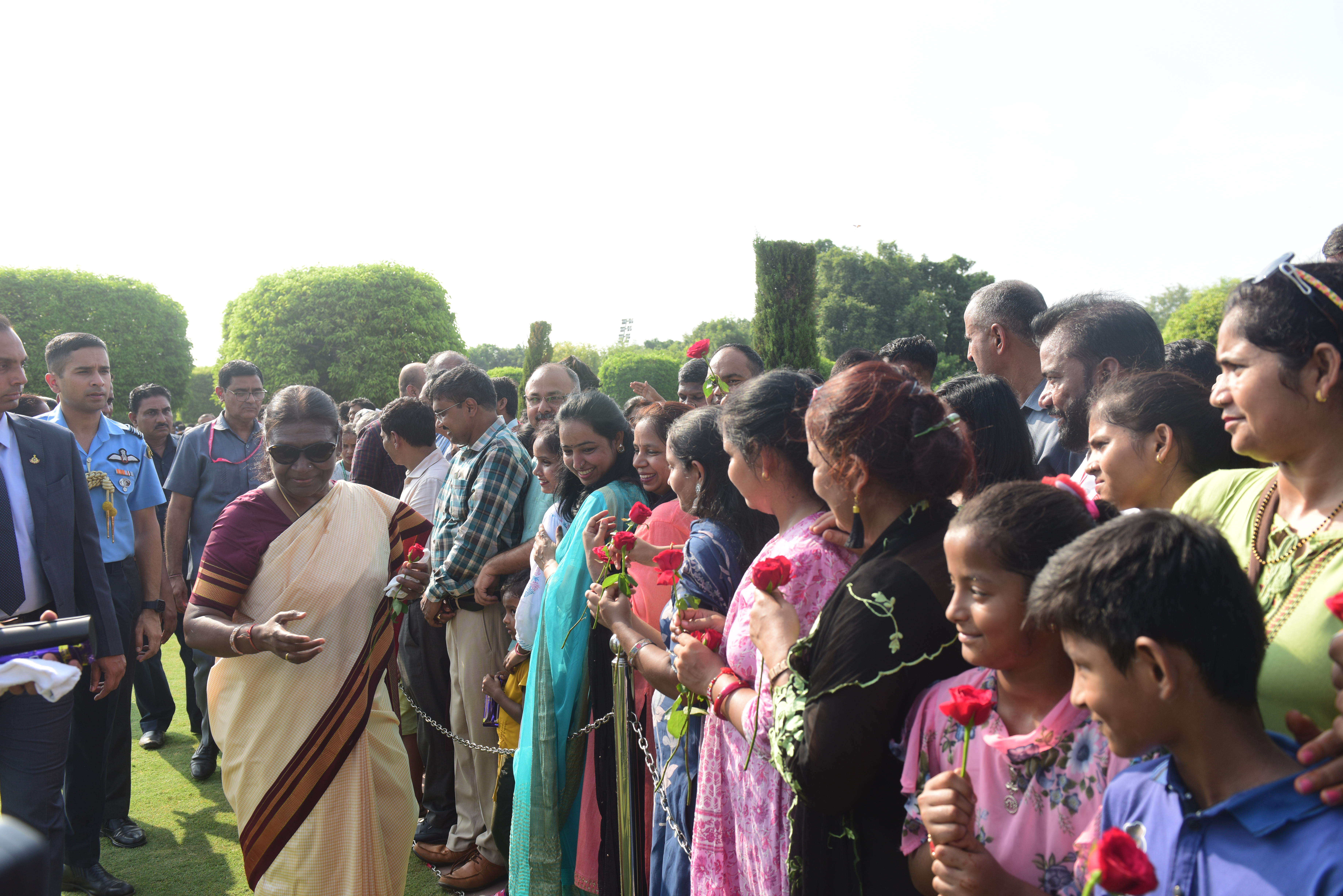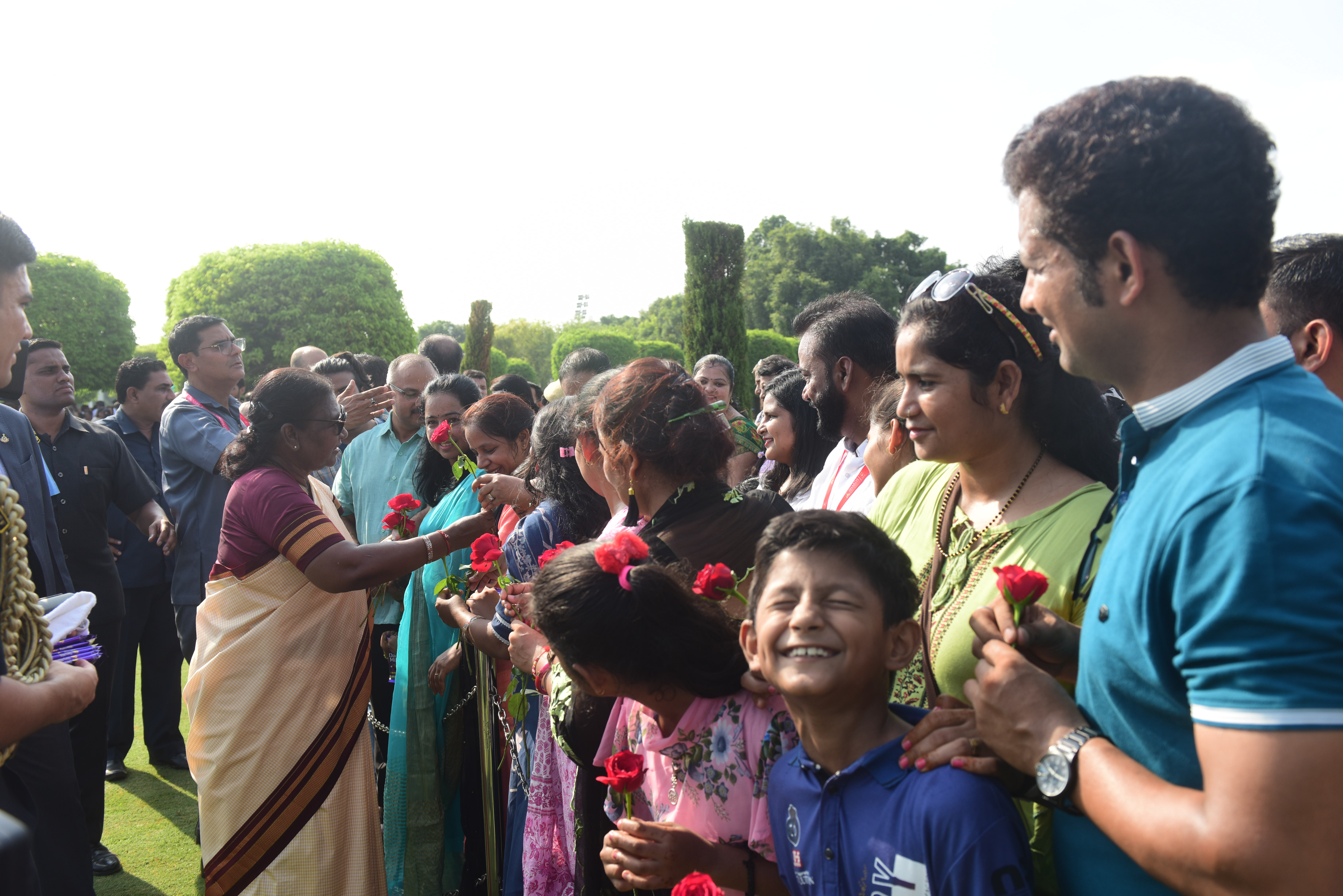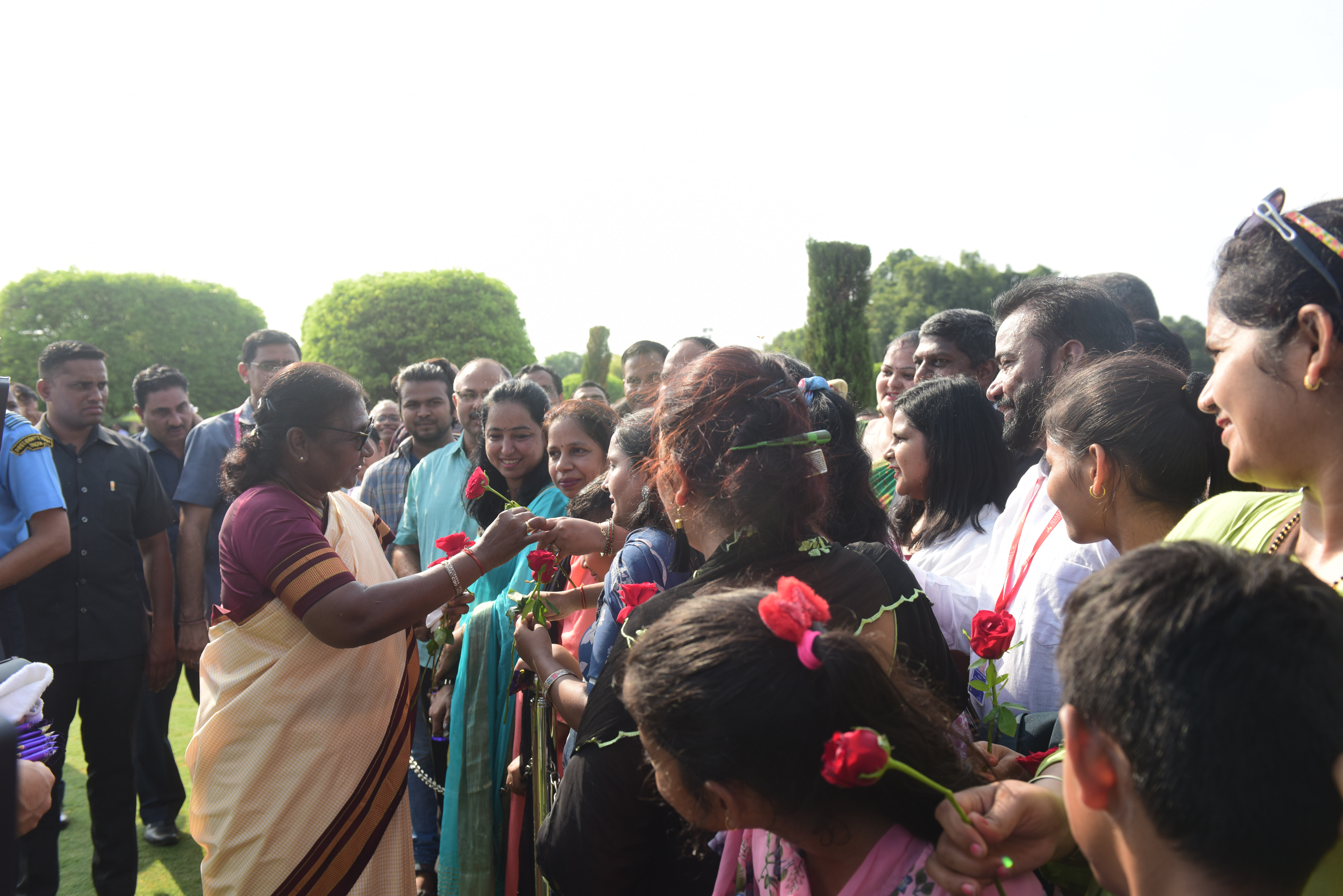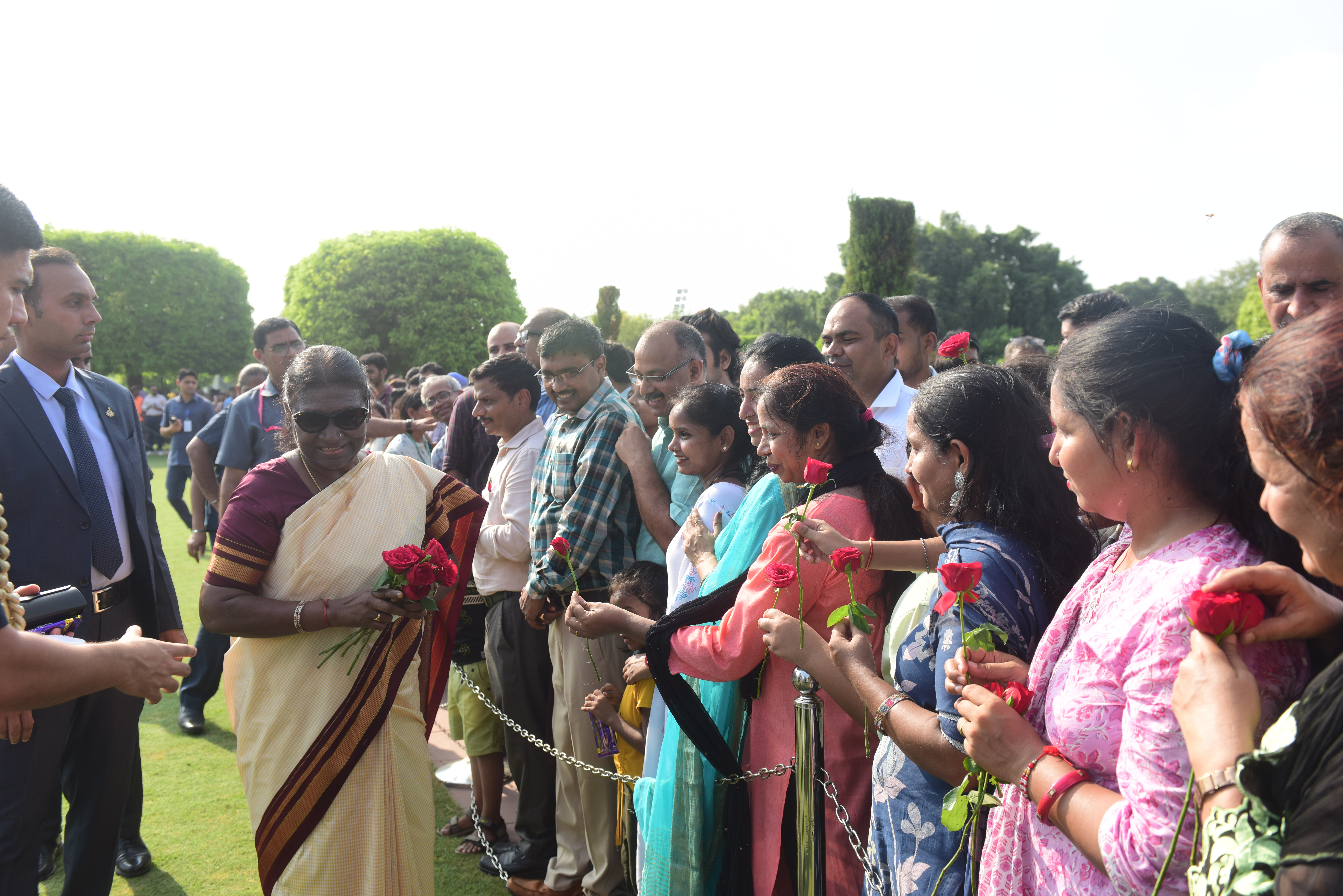 | Caption: | The President of India, Smt. Droupadi Murmu Interaction with the teachers invited to visit the Amrit Udyan as special invitees at Rashtrapati Bhavan on September 5, 2023. |