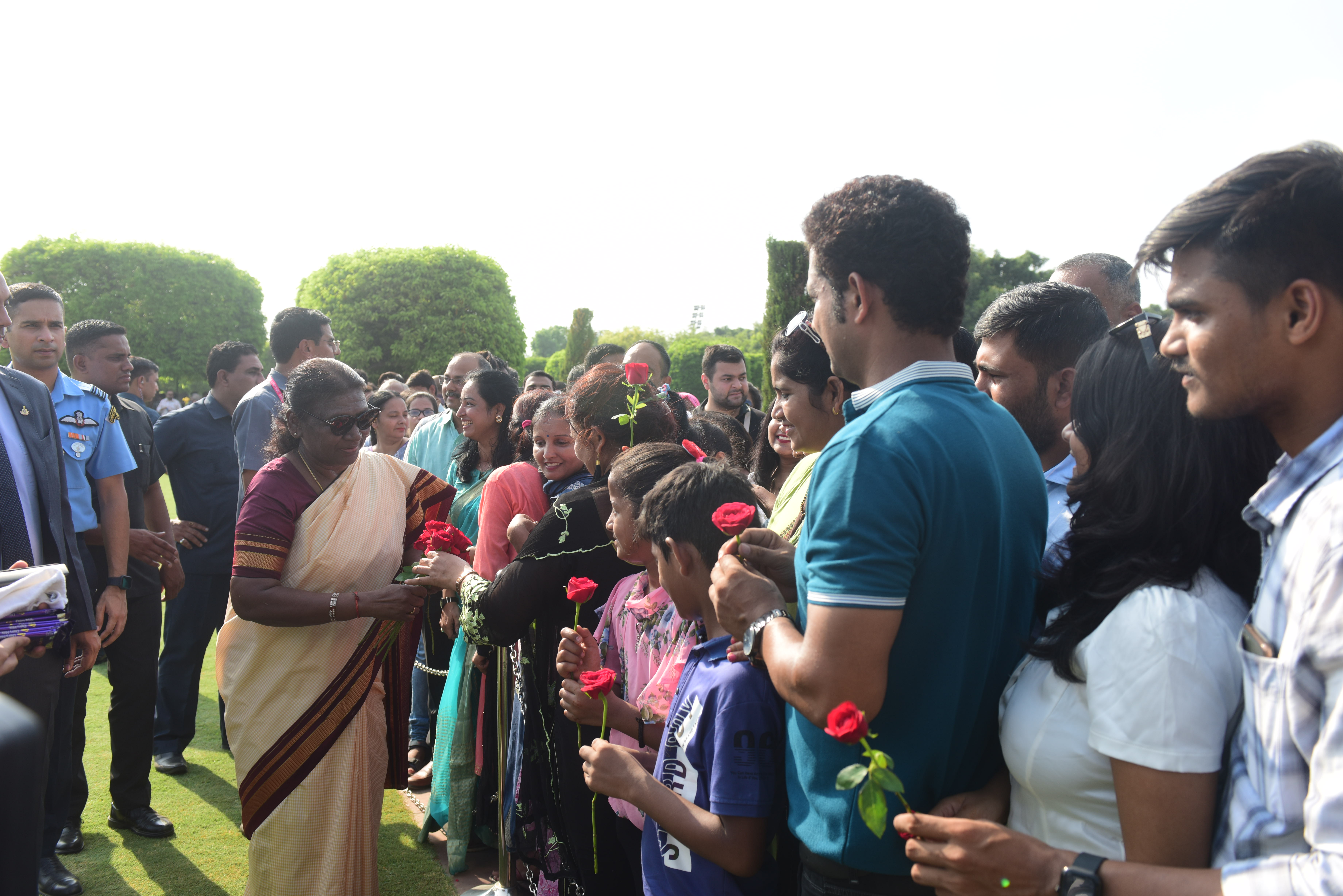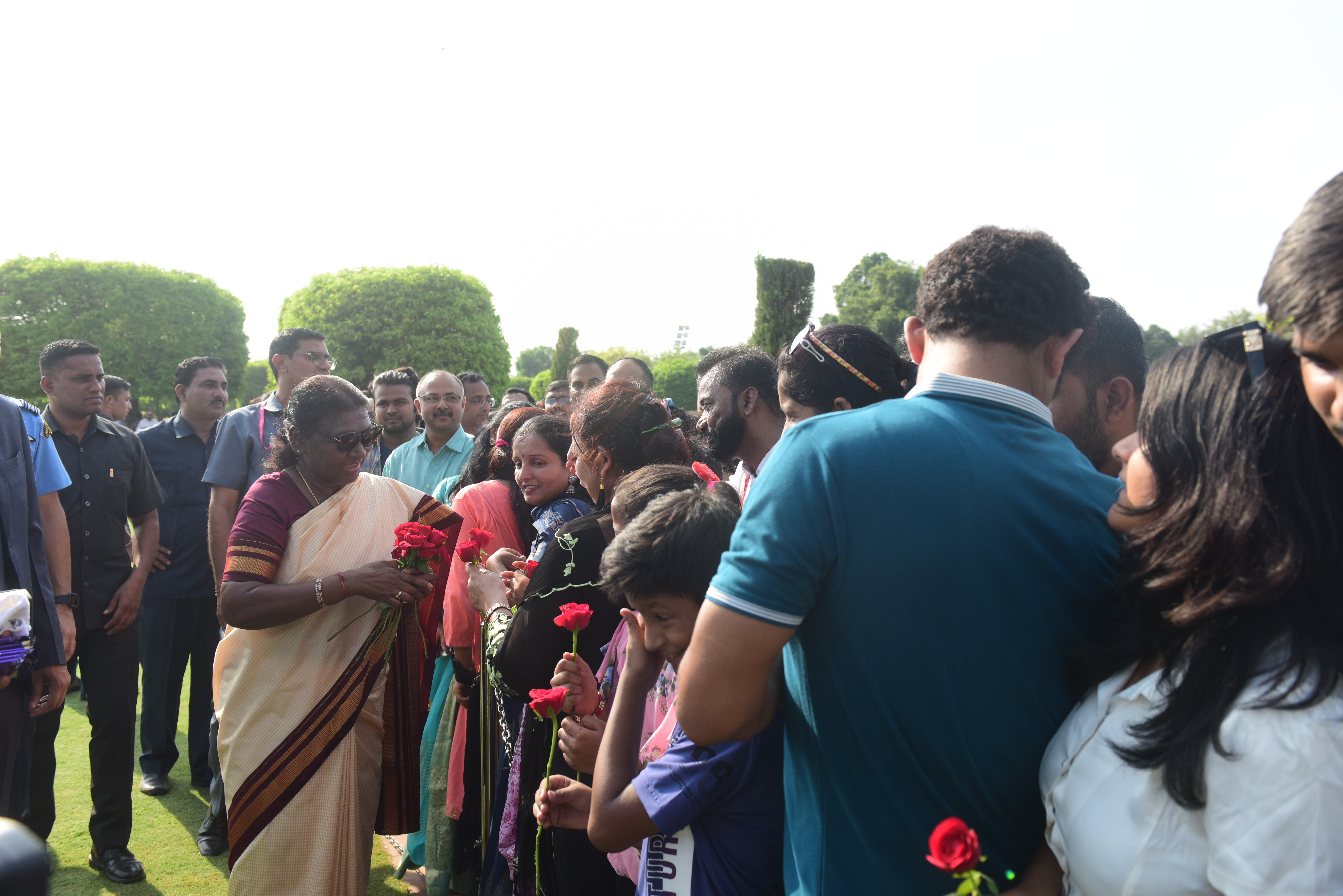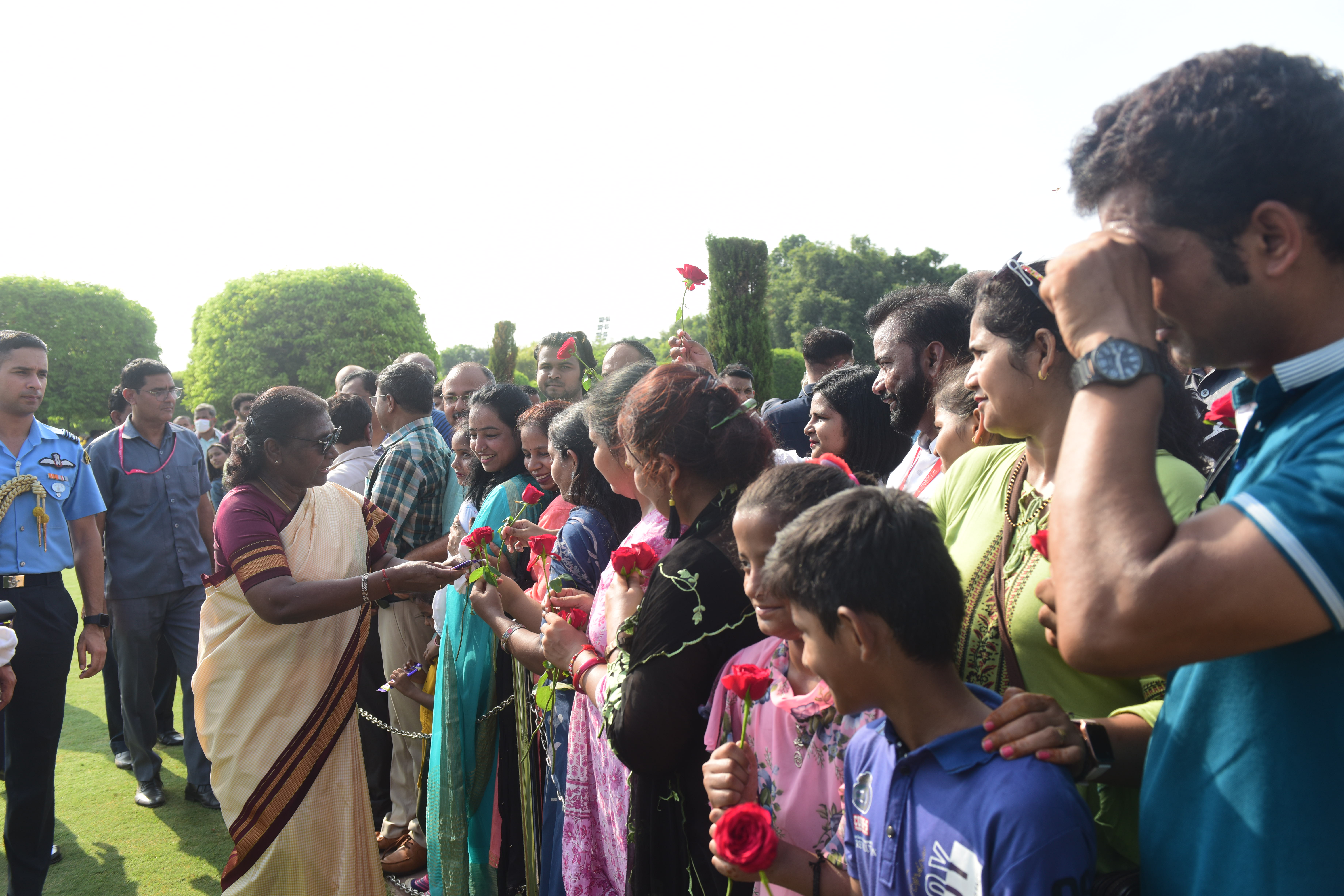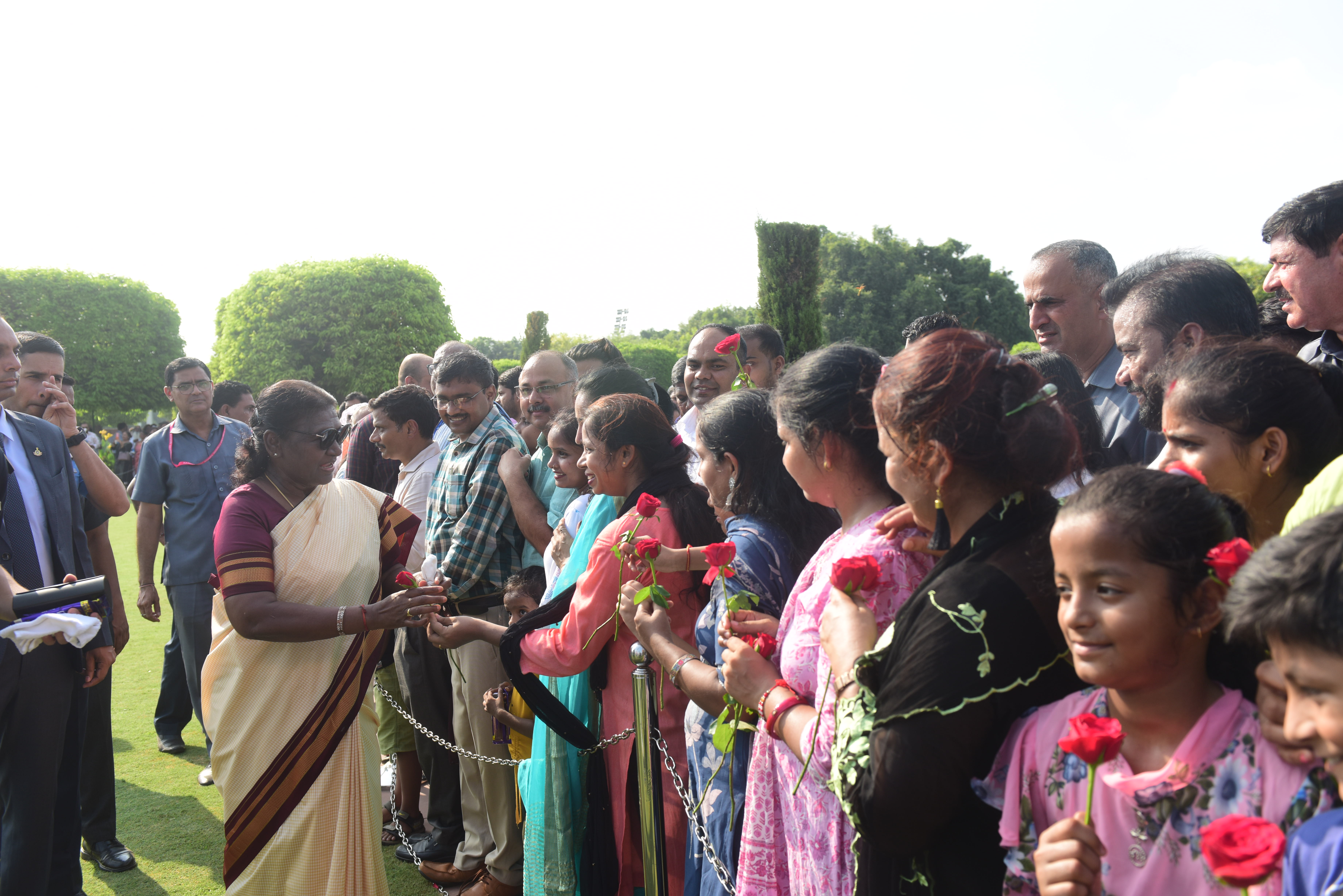 | Caption: | The President of India, Smt. Droupadi Murmu Interaction with the teachers invited to visit the Amrit Udyan as special invitees at Rashtrapati Bhavan on September 5, 2023. |